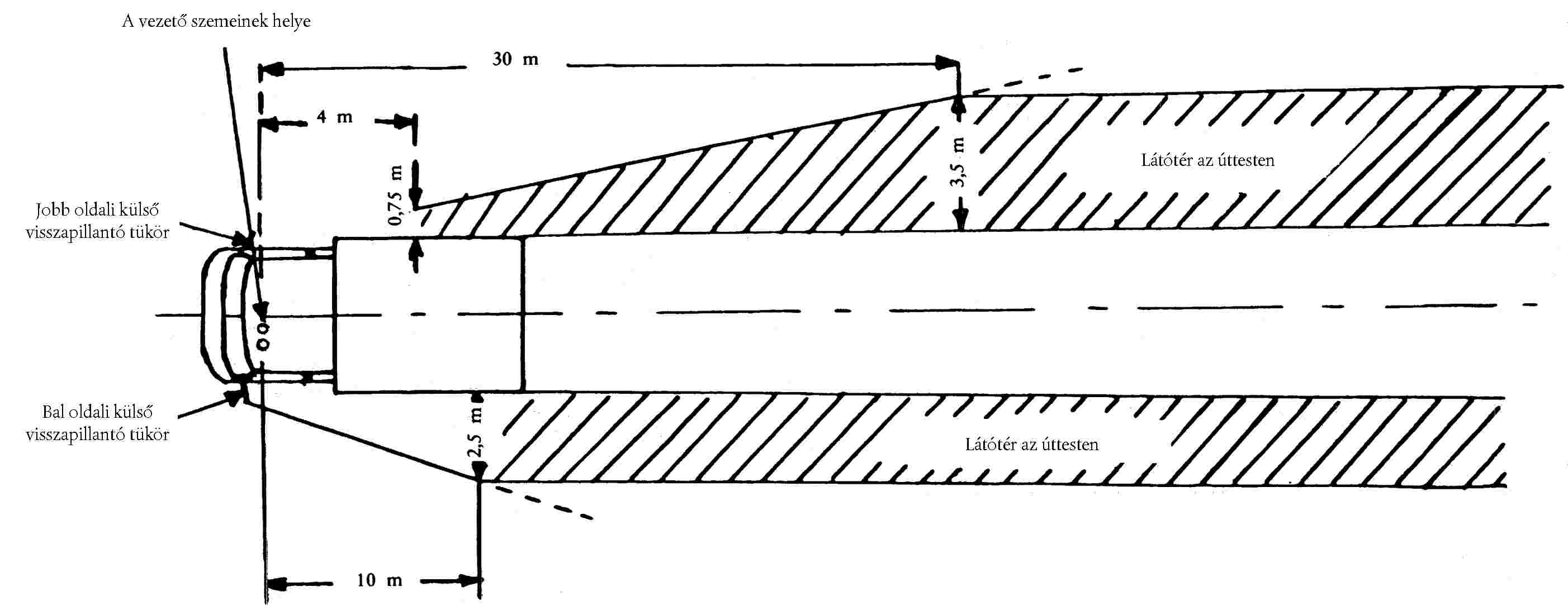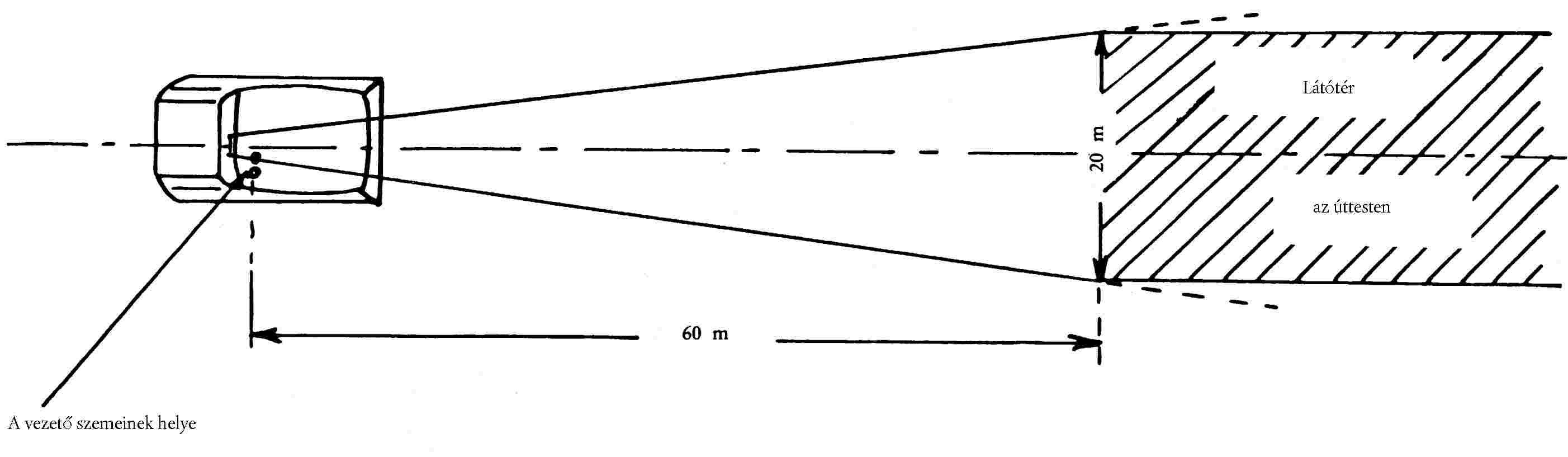 A látóteret úgy kell kialakítani, hogy a vezető az útpályának legalább egy olyan sík, vízszintes részét át tudja tekinteni, amely a jármű hosszanti függőleges, középsíkjához viszonyítva szimmetrikusan helyezkedik el, 20 m széles és a horizonttól a vezető szemeinek helye mögötti 60 m távolságig terjed (3. ábra).