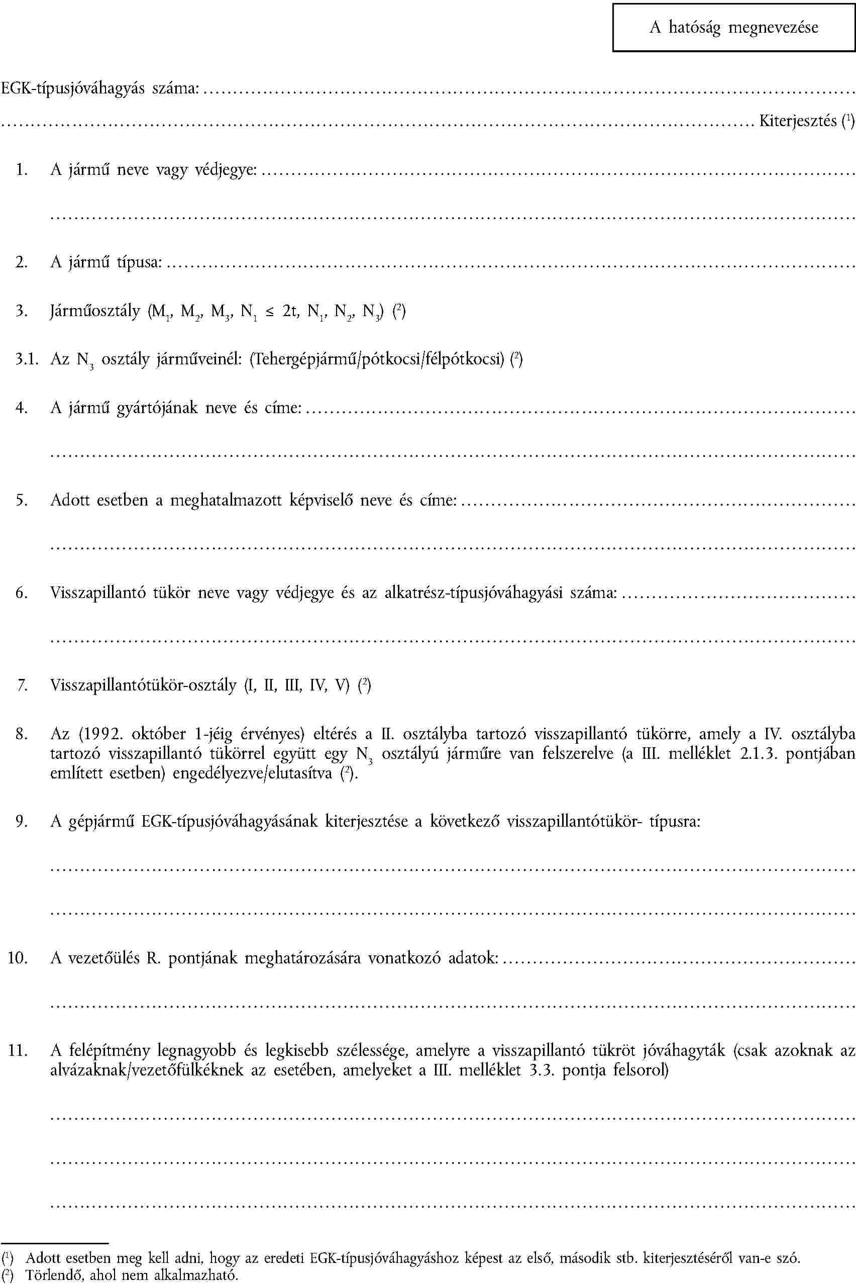N2> 7,5 tonna | – (lásd még a 2.2.3. pontot) | 2 (1 jobbra és 1 balra) | 1 (lásd még a 2.2.3. pontot) | 1 | – (lásd még a 3.7. pontot) |