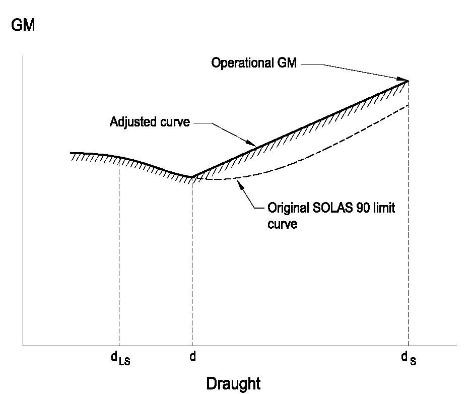 A kiigazított görbe egy egyenes vonal a modellkísérlet során alkalmazott GM merülési szintje és az eredeti SOLAS 90 görbe és a d merülési szint metszéspontja között.