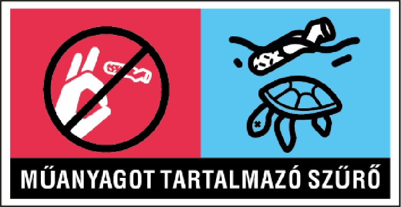 A jelölés két azonos méretű piros és kék négyzetből áll, amelyeket egymás mellett helyeznek el, valamint alattuk egy fekete téglalapból, amely a "MŰANYAGOT TARTALMAZÓ SZŰRŐ" feliratot tartalmazza. A jelölés magasságának és hosszának aránya 1:2.