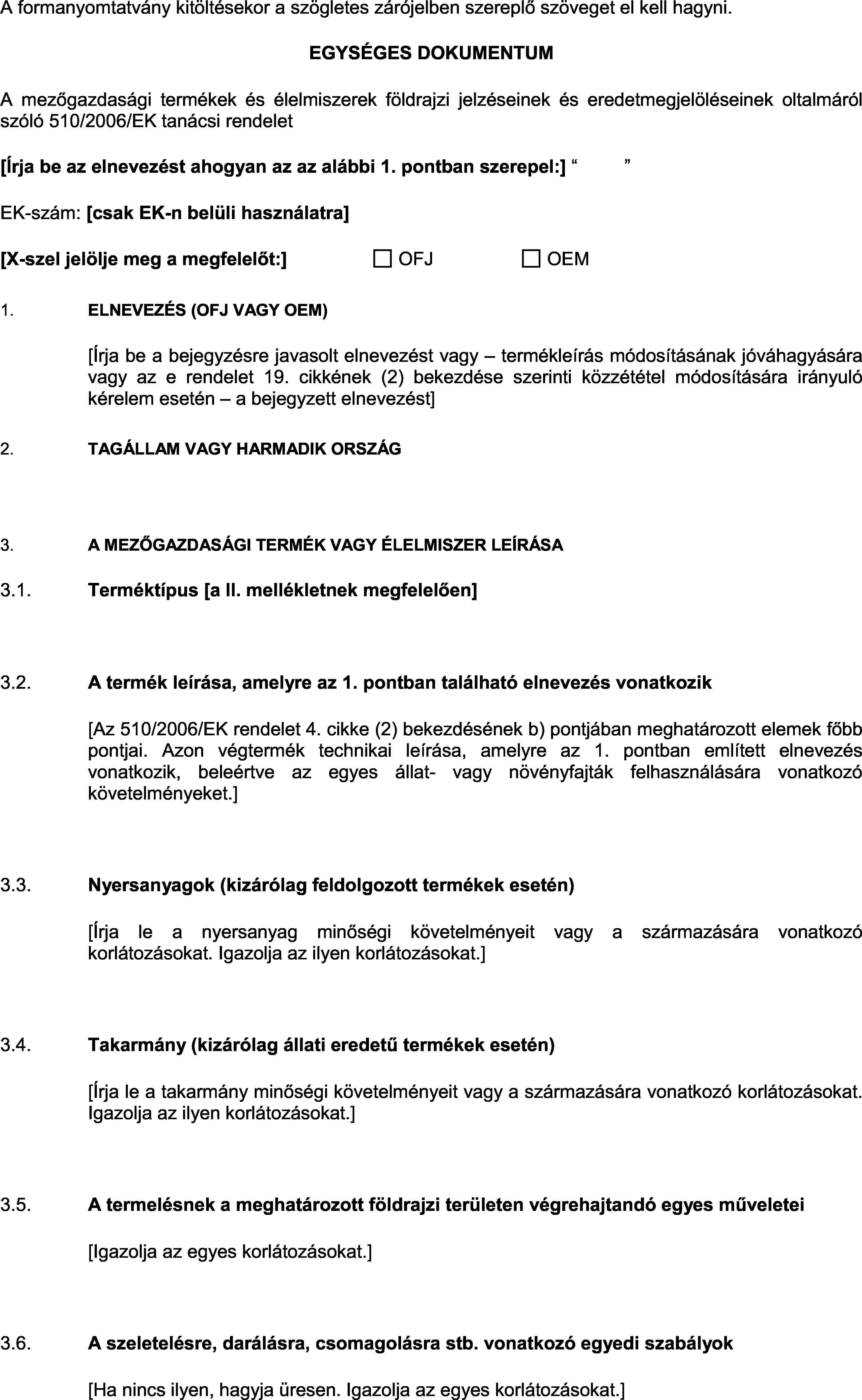 1. Az egységes dokumentumot a földrajzi jelzésre vagy az eredetmegjelölésre vonatkozó valamennyi kérelem esetében az 510/2006/EK rendelet 5. cikkének értelmében, a módosítás jóváhagyására irányuló kérelmek esetében pedig az adott rendelet 9. cikkének (2) bekezdése értelmében az e rendelet I. mellékletében található formanyomtatvánnyal összhangban kell elkészíteni.