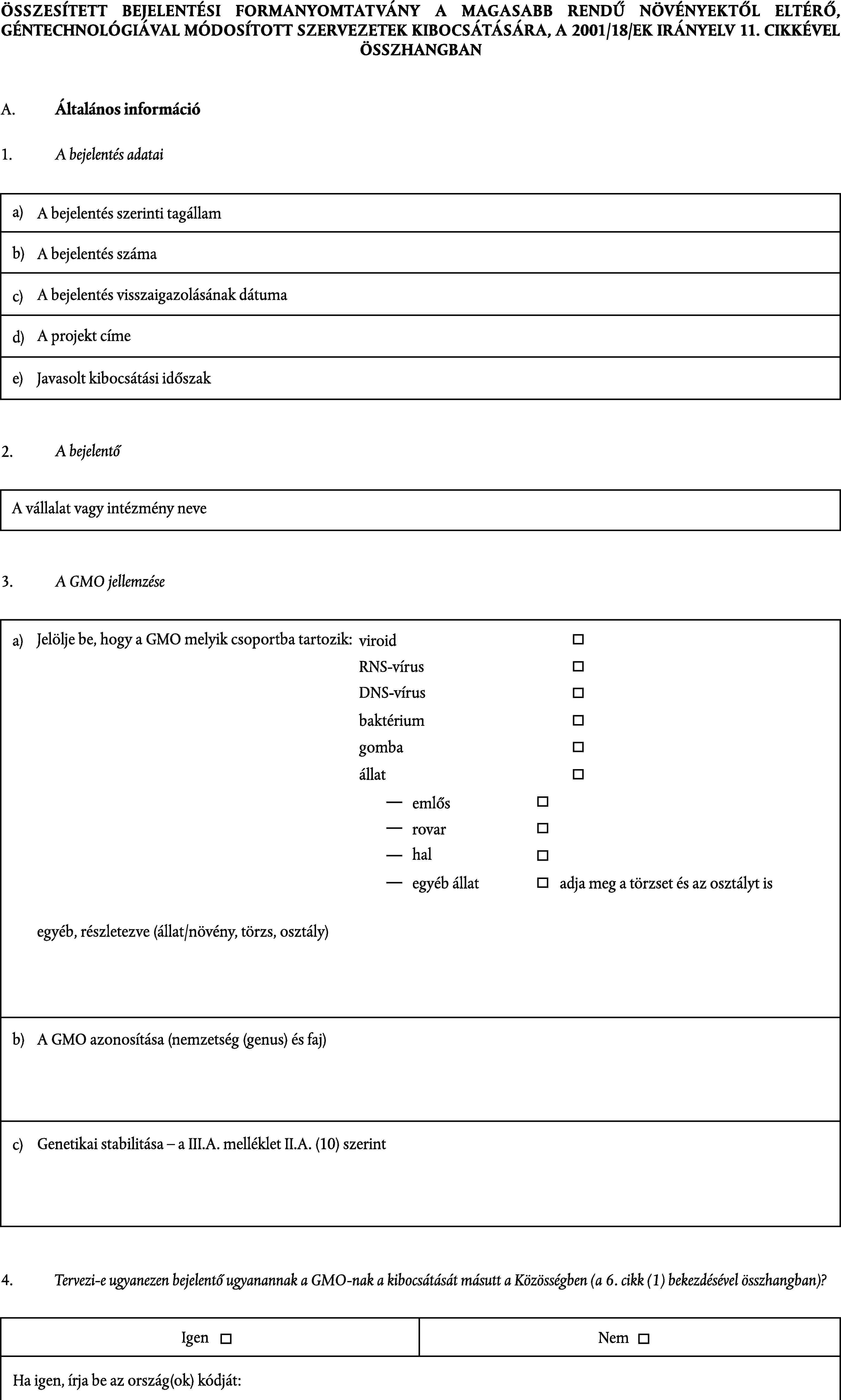 A GMO-k és a GMO-kombinációk kereskedelmi forgalomba hozataltól eltérő bármilyen egyéb célból a környezetbe történő szándékos kibocsátásával kapcsolatos bejelentések összefoglaló bejelentési formanyomtatványát a 2001/18/EK irányelv 11. cikkében felvázolt célra és az ott létrehozott eljárással összhangban alakították ki.