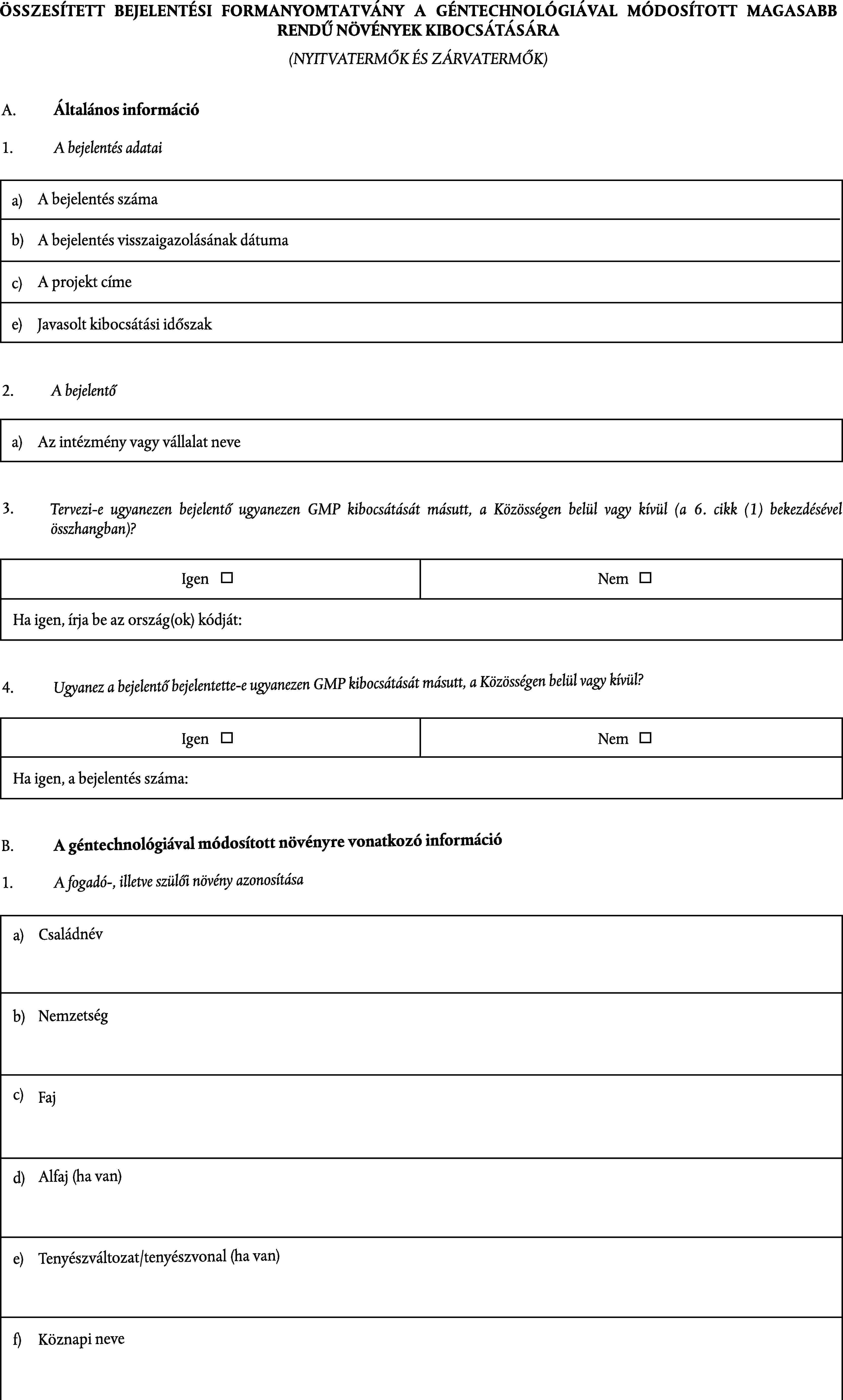 A GMO-KNAK ÉS A GMO-KOMBINÁCIÓKNAK A KERESKEDELMI FORGALOMBA HOZATALTÓL ELTÉRŐ BÁRMILYEN EGYÉB CÉLBÓL A KÖRNYEZETBE TÖRTÉNŐ SZÁNDÉKOS KIBOCSÁTÁSÁVAL KAPCSOLATOS BEJELENTÉSEK ÖSSZEFOGLALÓ BEJELENTÉSI FORMANYOMTATVÁNYA