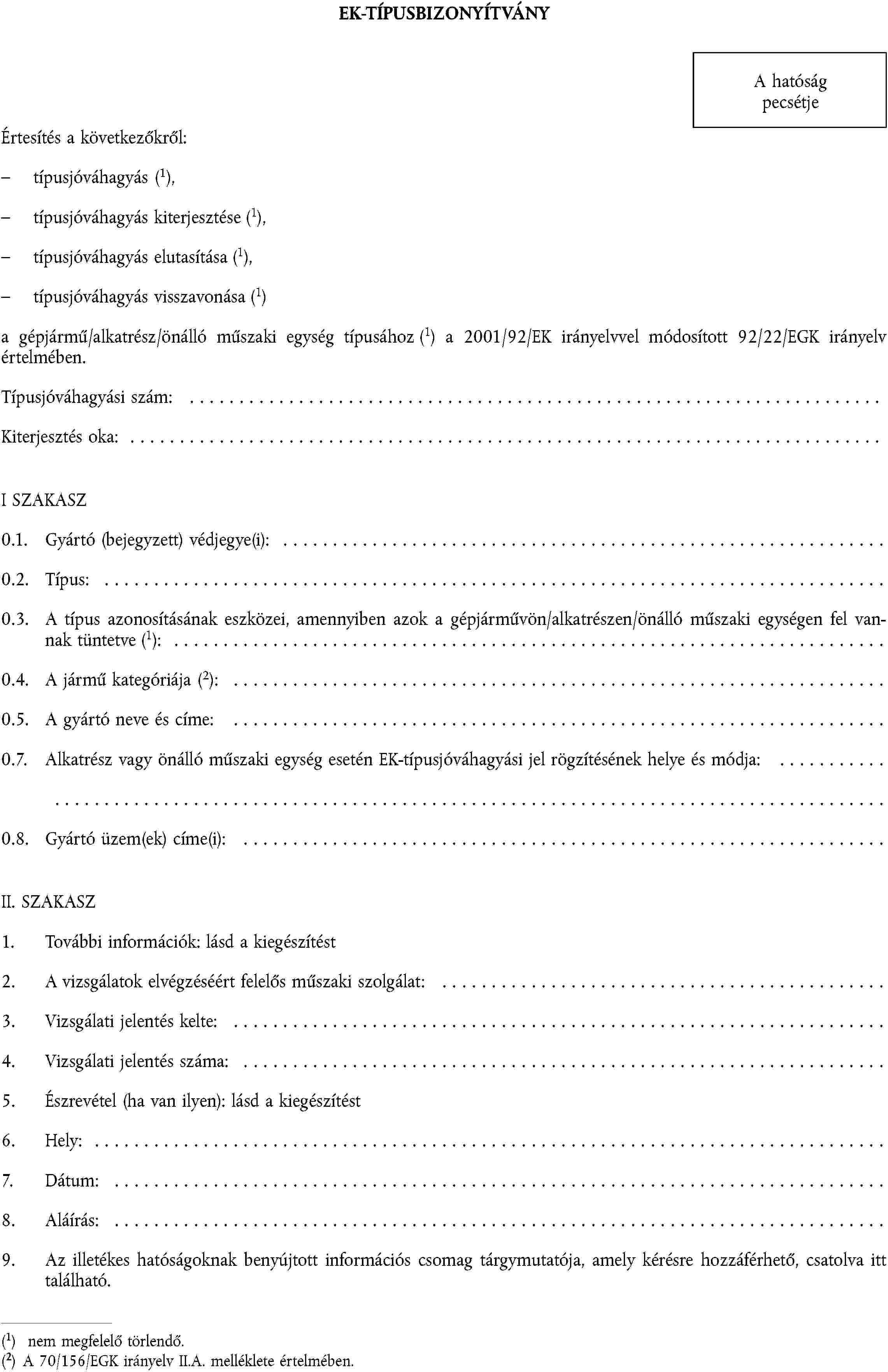 2. függelék: | A biztonsági üvegezés típusára vonatkozó EK-típusbizonyítvány | |