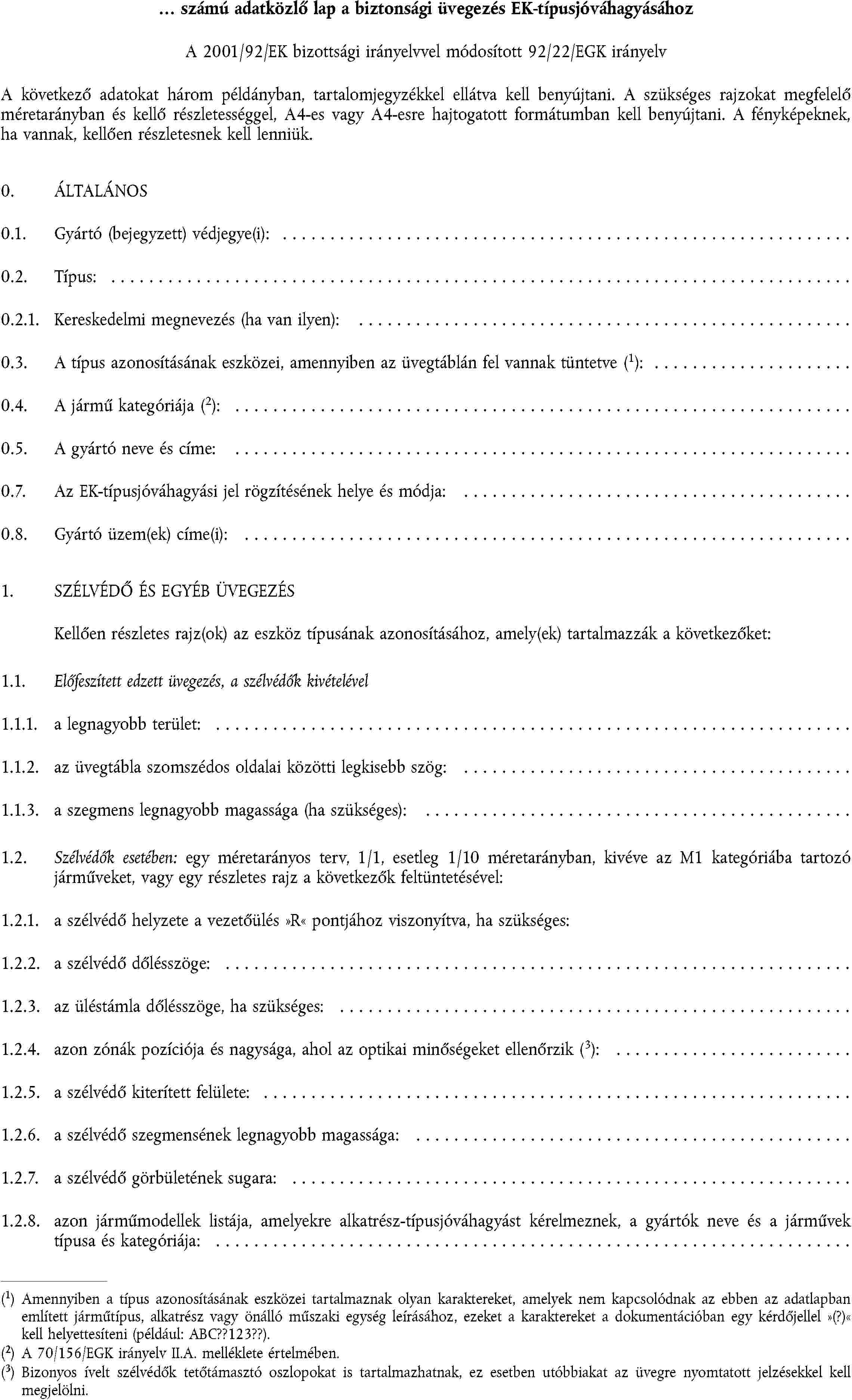 a szélvédők egy típusának EK-típusjóváhagyásához a 2001/92/EK irányelvvel módosított 92/22/EGK irányelv szerint