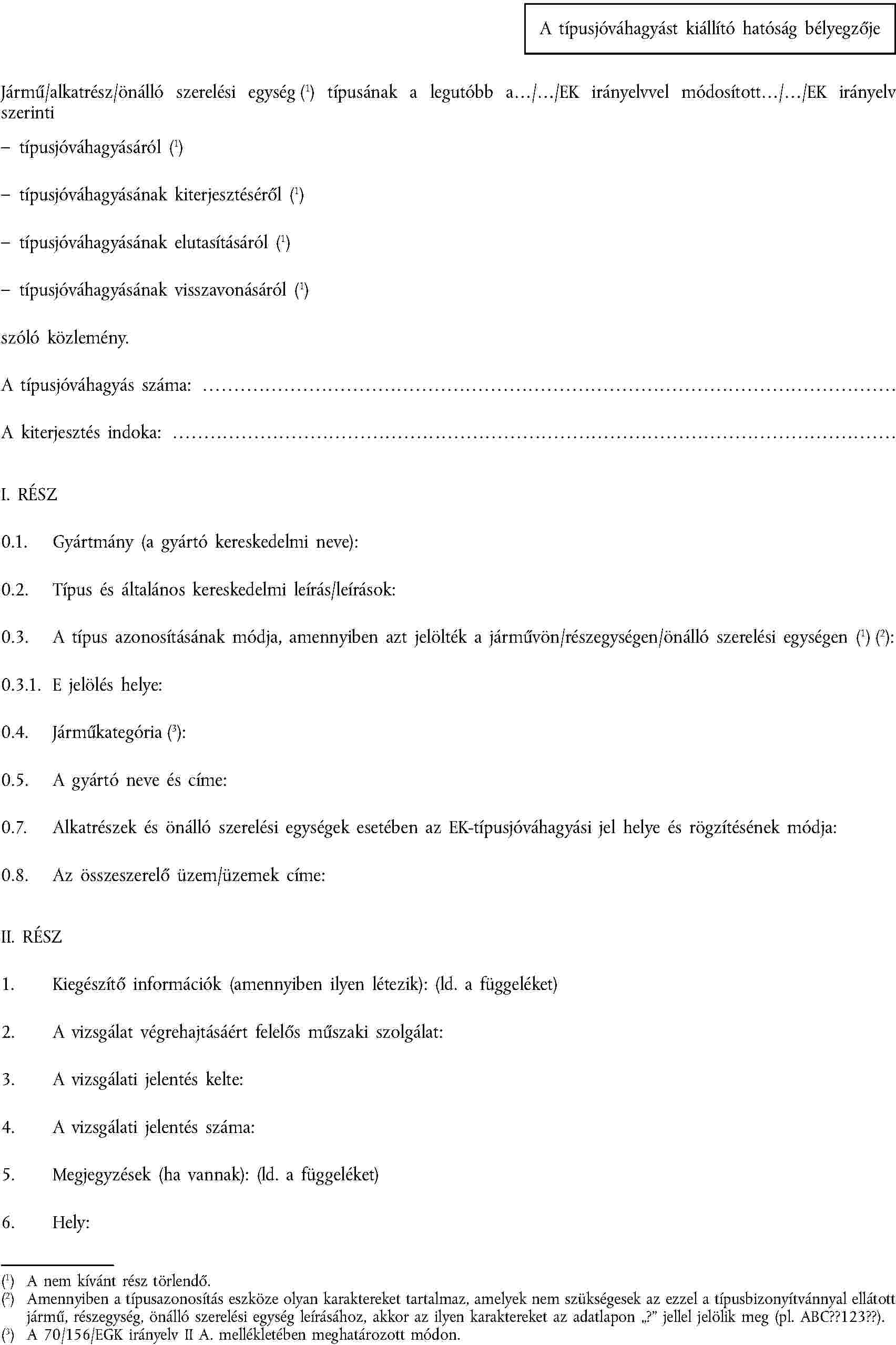 ( 8 ) Az ezen adatközlő lapon alkalmazott számozások és lábjegyzetek a 70/156/EGK irányelv I. mellékletéhez igazodnak. Az ezen irányelvben foglaltak szempontjából érdektelen részeket kihagyták.
