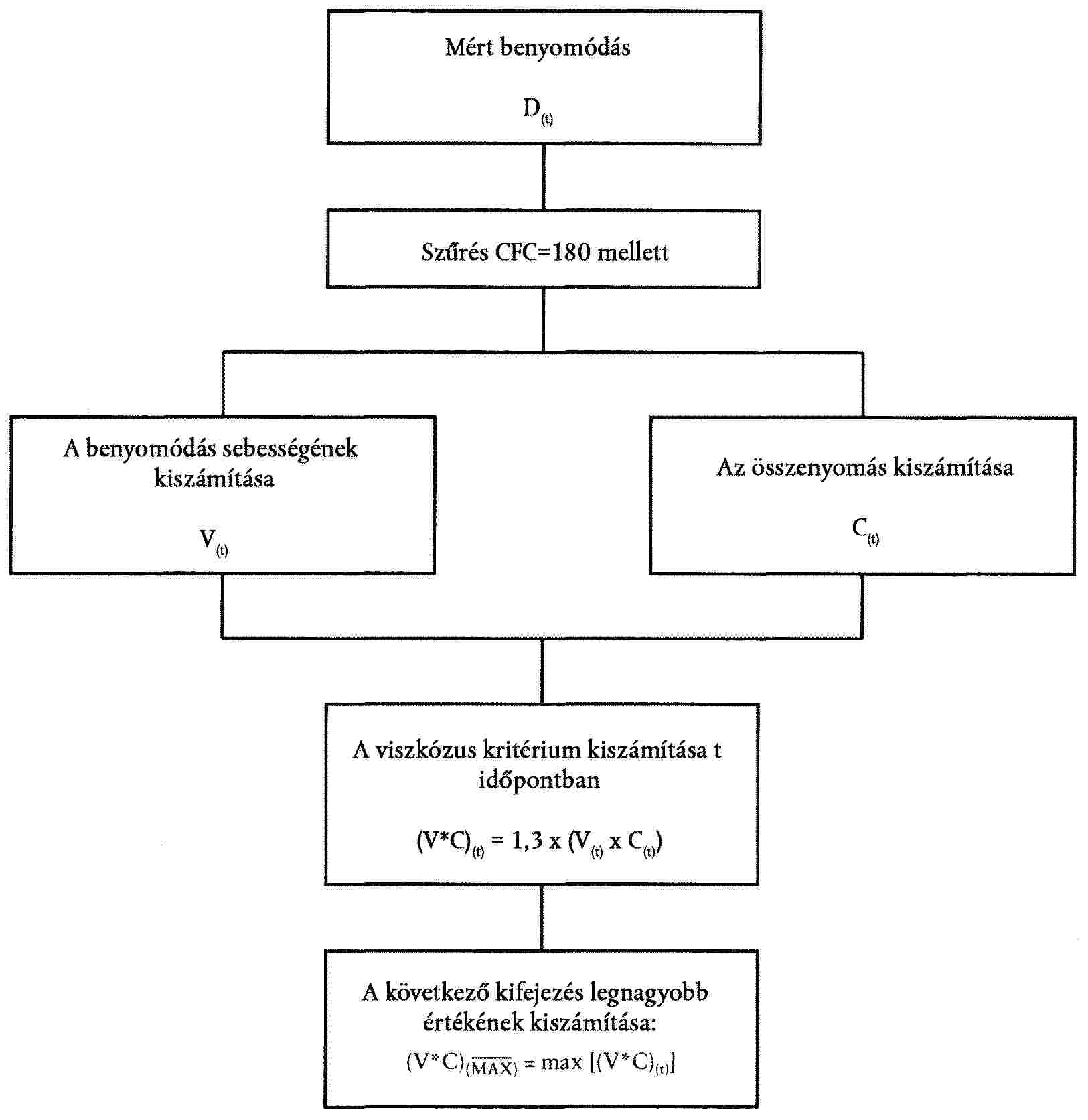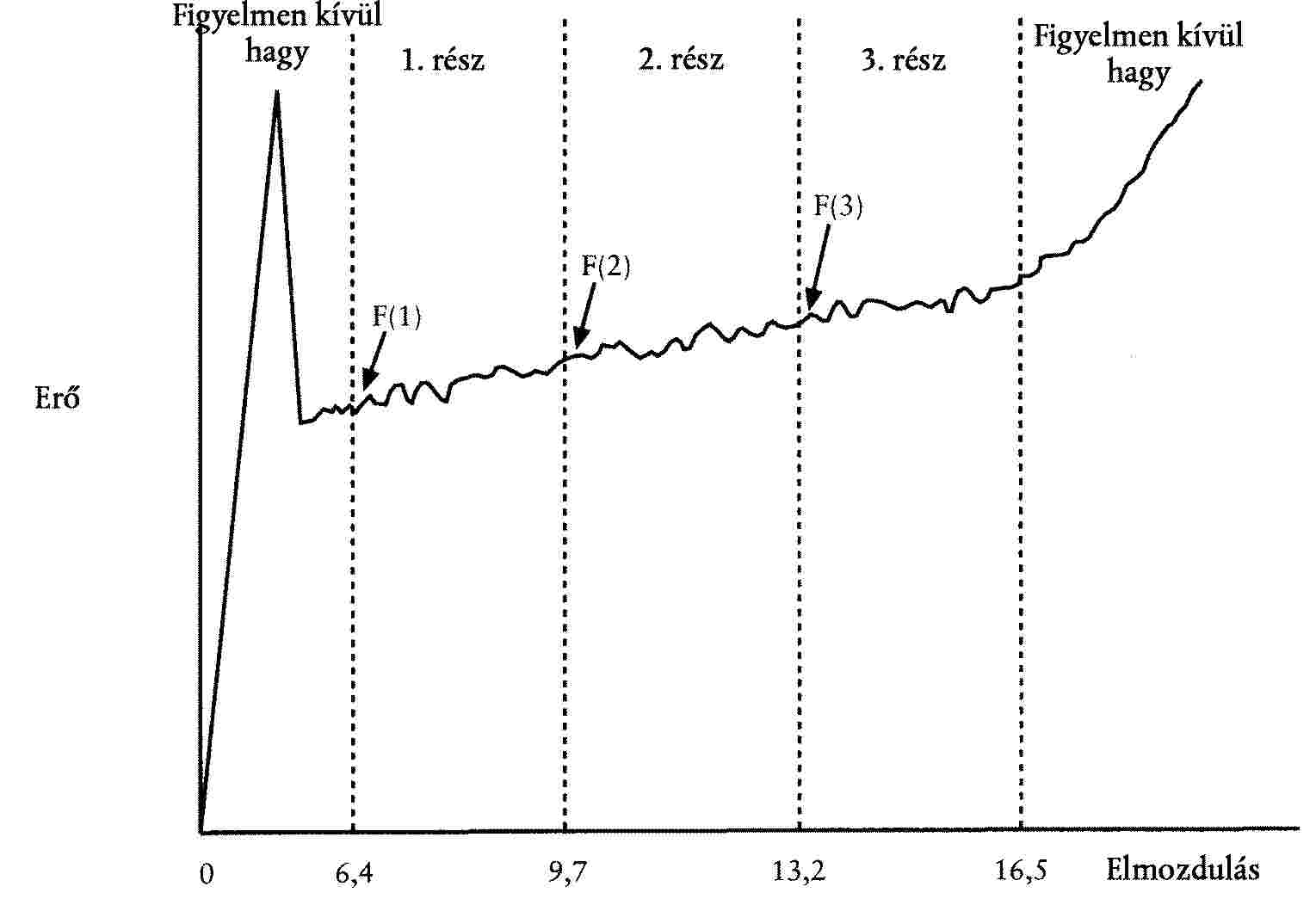 Minden adatot, amely az összenyomódás mértékében 6,4 mm előtt és 16,5 mm után keletkezett, figyelmen kívül kell hagyni. A megmaradt adatokat három részre, avagy elmozdulási intervallumra kell osztani (n = 1,2,3) (lásd. 3. ábra) a következők szerint: