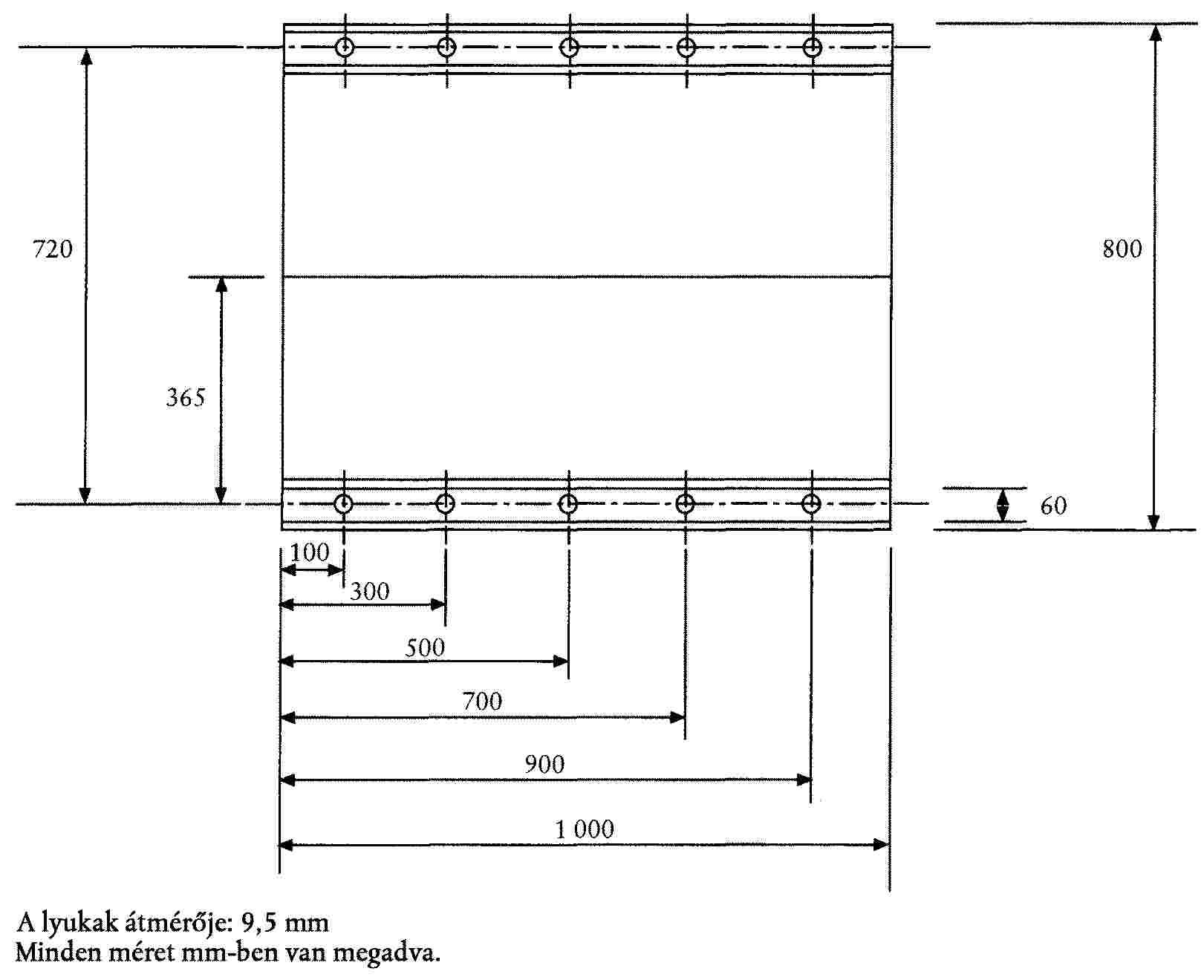 5.2. A deformálódó korlátot rögzíteni kell a betontömbhöz tíz csavar segítségével, öttel a felső bordában, öttel az alsóban. Ezeknek a csavaroknak legalább 8 mm átmérőjűeknek kell lenniük. Acél rögzítőszalagokat kell használni az alsó és a felső szerelési bordánál egyaránt (lásd. 1. és 5. ábra). E szalagoknak legalább 60 mm magasnak, 1000 mm szélesnek és 3 mm vastagnak kell lenniük. Öt darab 9,5 mm átmérőjű szavatolt hézagú furatot kell beléjük fúrni a korlát szerelési bordáin levőknek megfelelően (lásd 4. bekezdés). Egyik rögzítés sem lazulhat meg az ütközési teszt során.