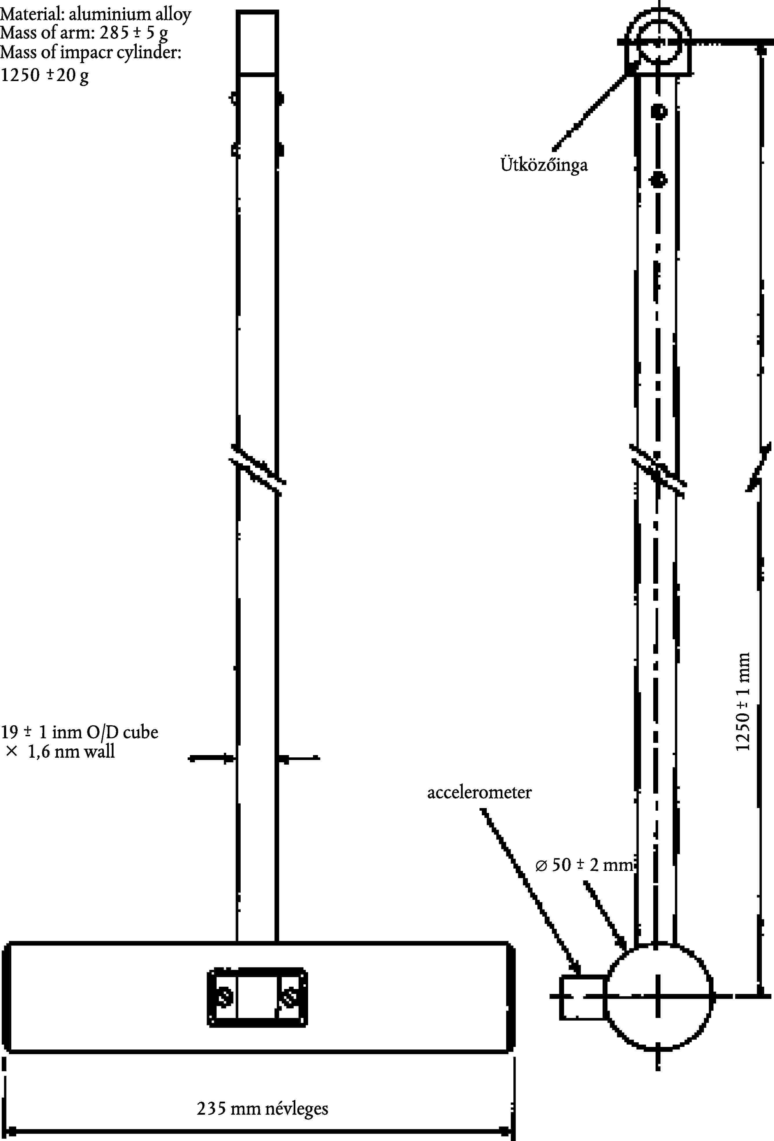 3.3.5. A merev ütközésmérő egy 50 (± 2) mm átmérőjű vízszintes hengerből és egy 19 (± 1) mm átmérőjű ingakarból áll (4. ábra). A henger tömege 1,25 (± 0,02) kg, beleértve műszerezését és a tartókar hengeren belülre eső részét is. Az ingakar tömege 285 (± 5) g. A tengely - amelyhez a tartókar van csatlakoztatva - forgó alkatrészeinek tömege nem lehet 100 g-nál több. Az ütközőhenger vízszintes középponti tengelye és a teljes inga forgástengelye közötti távolság 1 250 (± 1) mm legyen. Az ütközőhenger hosszanti tengelye vízszintes, és merőleges az ütközés irányára. Az ingának a cipő sarkához kell ütődnie, a próbabábu kemény, vízszintes alapon nyugvó sarkának aljától számított 62 (± 2) mm távolságban oly módon, hogy az ingakar hosszirányú középvonala ütközéskor a függőlegeshez képest 1o-on belül legyen. Az ütközésmérő mozgását irányítani kell a jelentősebb oldalirányú, függőleges, illetve forgó mozgás kizárása érdekében.