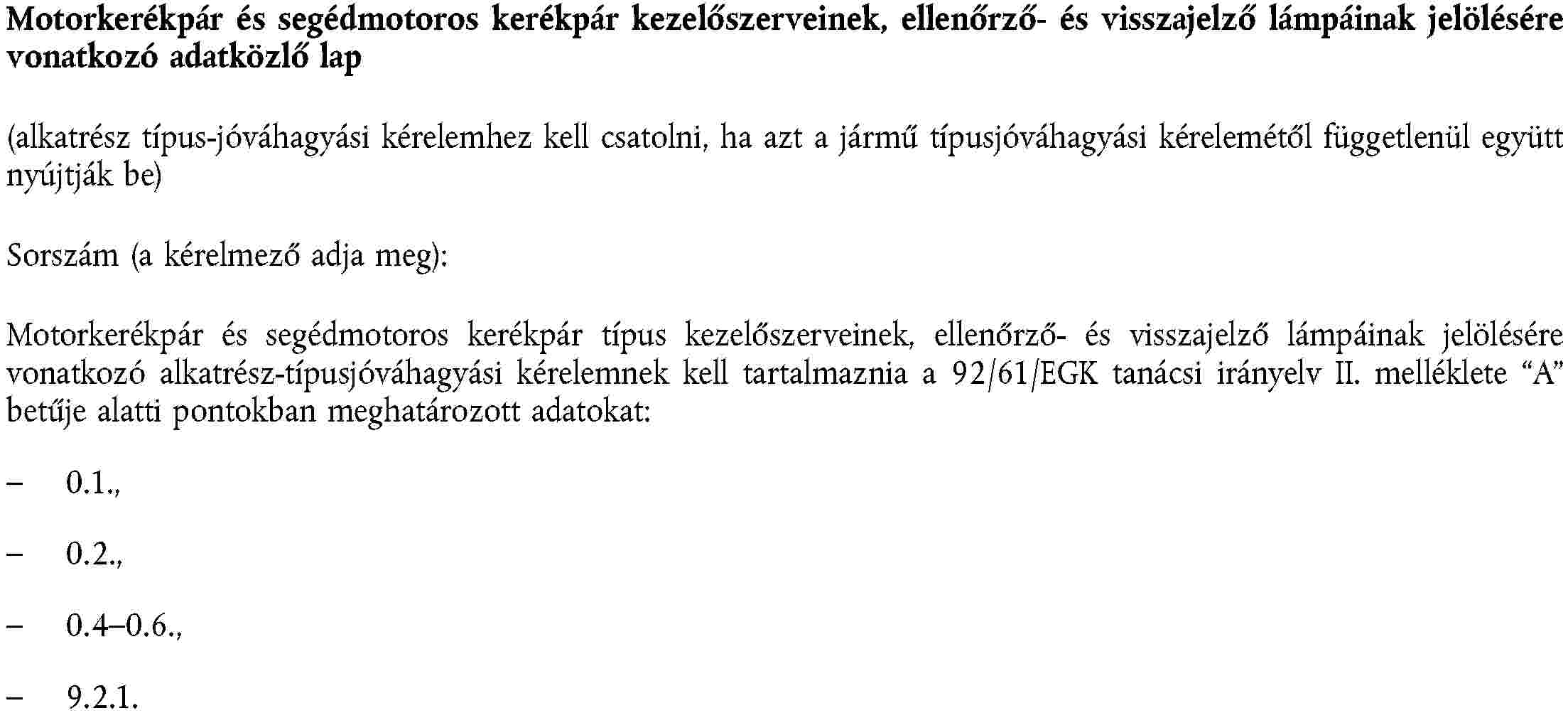 A motorkerékpárok és segédmotoros kerékpárok kezelőszerveinek, ellenőrző és visszajelző lámpáinak jelölésére vonatkozó alkatrésztípus-jóváhagyás megadásához szükséges eljárást, valamint e járművek szabad áruforgalomba hozatalának feltételeit a 92/61/EGK irányelv II., illetve III. fejezete rögzíti.