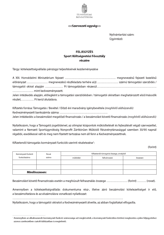 Nyilvántartási szám: Ügyintéző: FELJEGYZÉS Tárgy: A(z)..................nyilvántartási számú lebonyolítói megállapodás alapján előirányzatkeret számlák közötti átvezetésének kezdeményezése A XIII. Honvédelmi Minisztérium fejezet............... előirányzat/részfeladat...... megnevezésű részfeladat terhére a(z) .................. nyilvántartási számú, ................................. lebonyolítóval (a továbbiakban: Lebonyolító) megkötött lebonyolítói megállapodás (a továbbiakban: Megállapodás) és a döntési lista alapján összesen ..................... Ft előirányzatkeret átvezetése szükséges a Lebonyolító részére megnyitott lebonyolítási számla javára az alábbi részletezés szerint: A Megállapodás ............... pontjában meghatározott feladatra a(z) ........................ elnevezésű fejezeti kezelésű előirányzat, ..........................., megnevezésű részfeladat tekintetében .................. Ft az alábbiak szerint: Kifizetés forrása: Támogatás / Bevétel / Előző évi maradvány igénybevétele (megfelelő aláhúzandó) Terhelendő bankszámla száma:........................... Lebonyolítási bankszámla száma:........................ Számlák közötti átvezetés összege:........................ Kifizetendő támogatás kormányzati funkciók szerinti részletezése: (forint) | ||||||