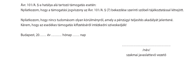 részére megítélt támogatásról szóló döntésnek a Magyar Államkincstár (a továbbiakban: Kincstár) által működtetett kincstári monitoring rendszerbe történő bejelentésére irányuló intézkedést megtettem, amelynek visszaigazolása a Kincstár részéről megtörtént.1 Nincs tudomásom semmilyen más körülményről, amely hatályos jogszabályi előírások, illetve a Honvédelmi Minisztérium (a továbbiakban: HM) belső szabályzatainak rendelkezései alapján a támogatási szerződés megkötését / támogatói okirat kiadását kizárná.2 |
