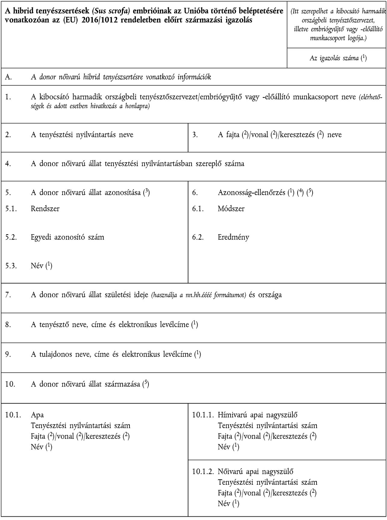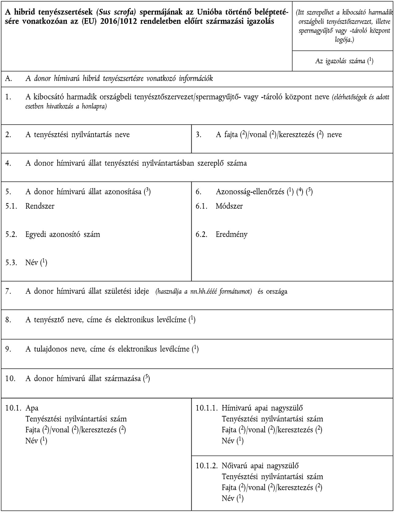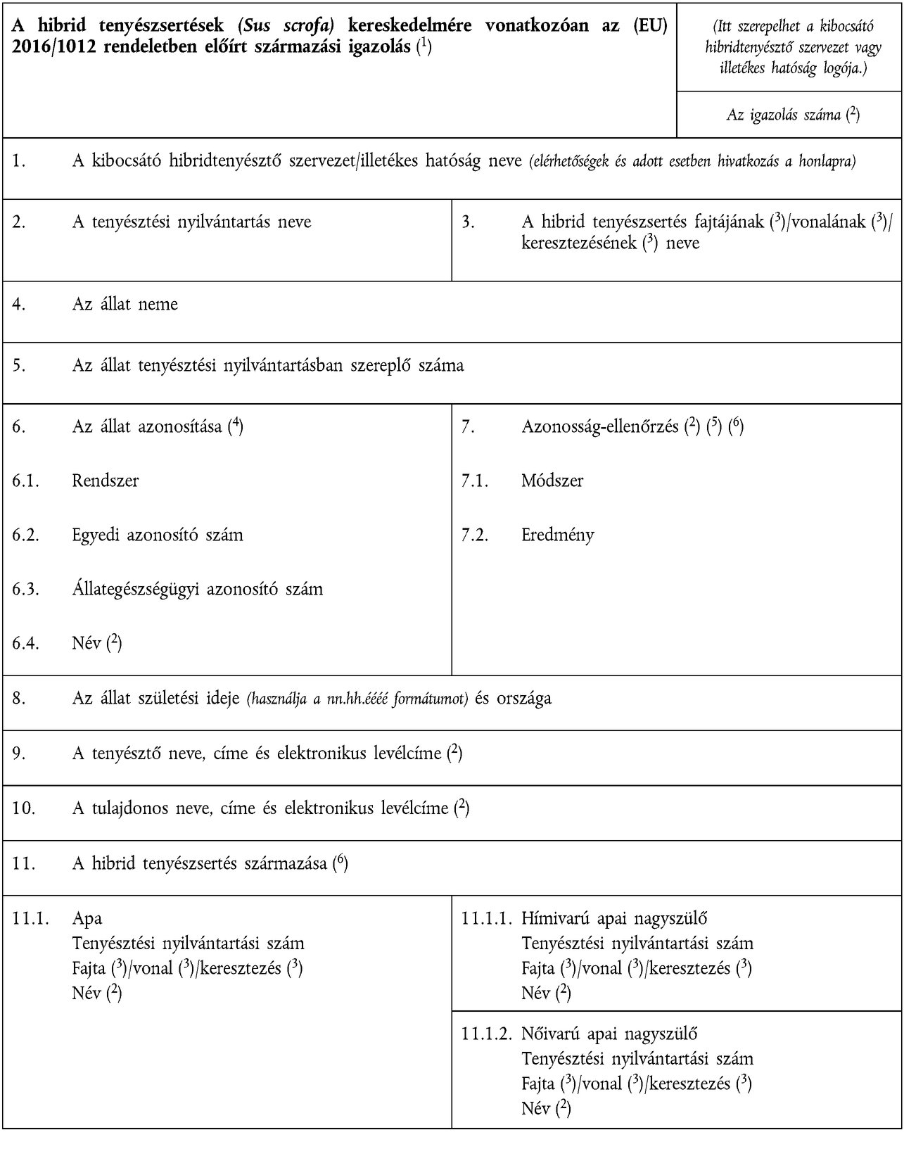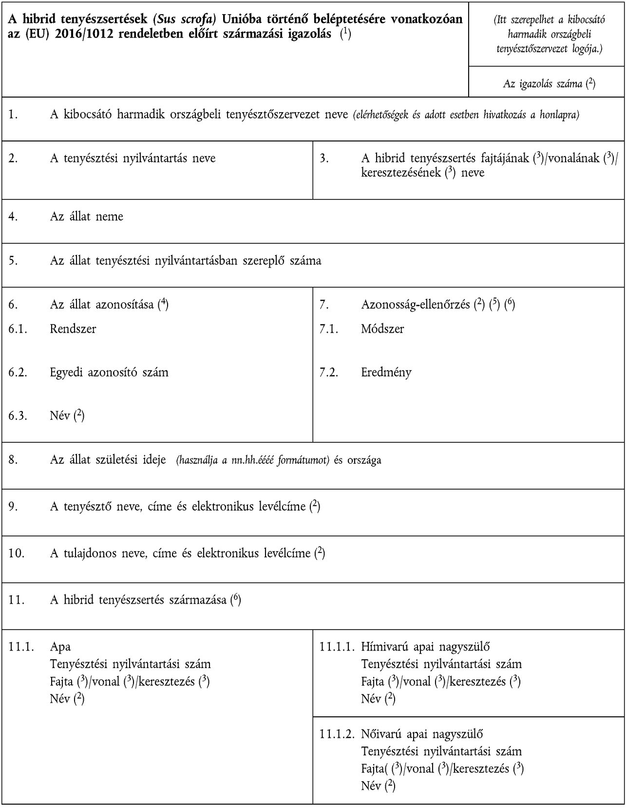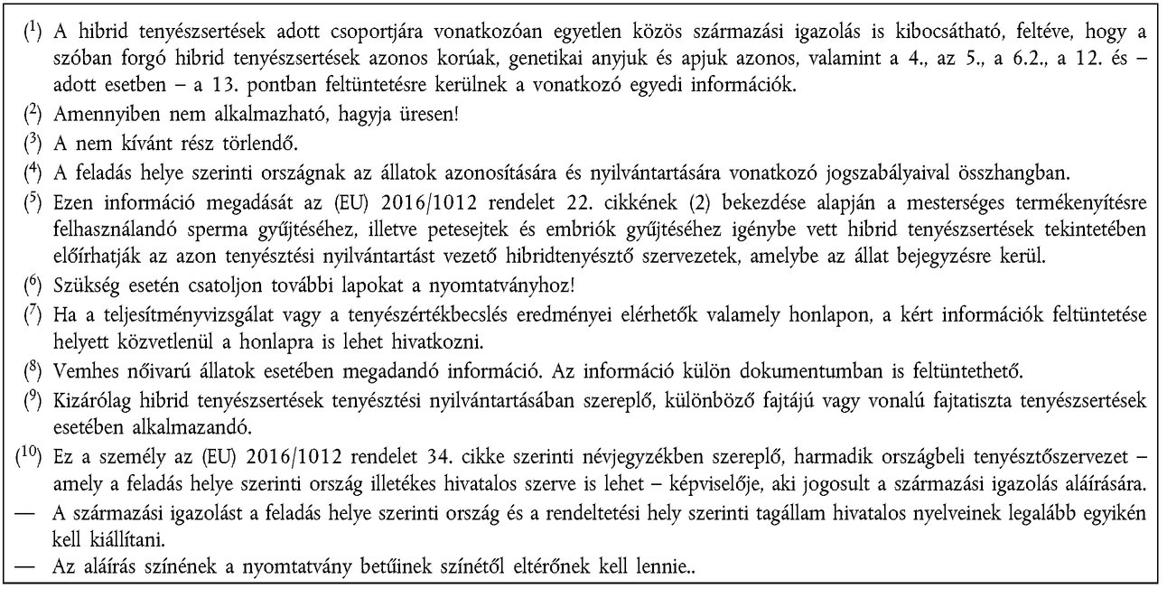A hibrid tenyészsertések (Sus scrofa) Unióba történő beléptetésére vonatkozóan az (EU) 2016/1012 rendeletben előírt származási igazolás (1)
