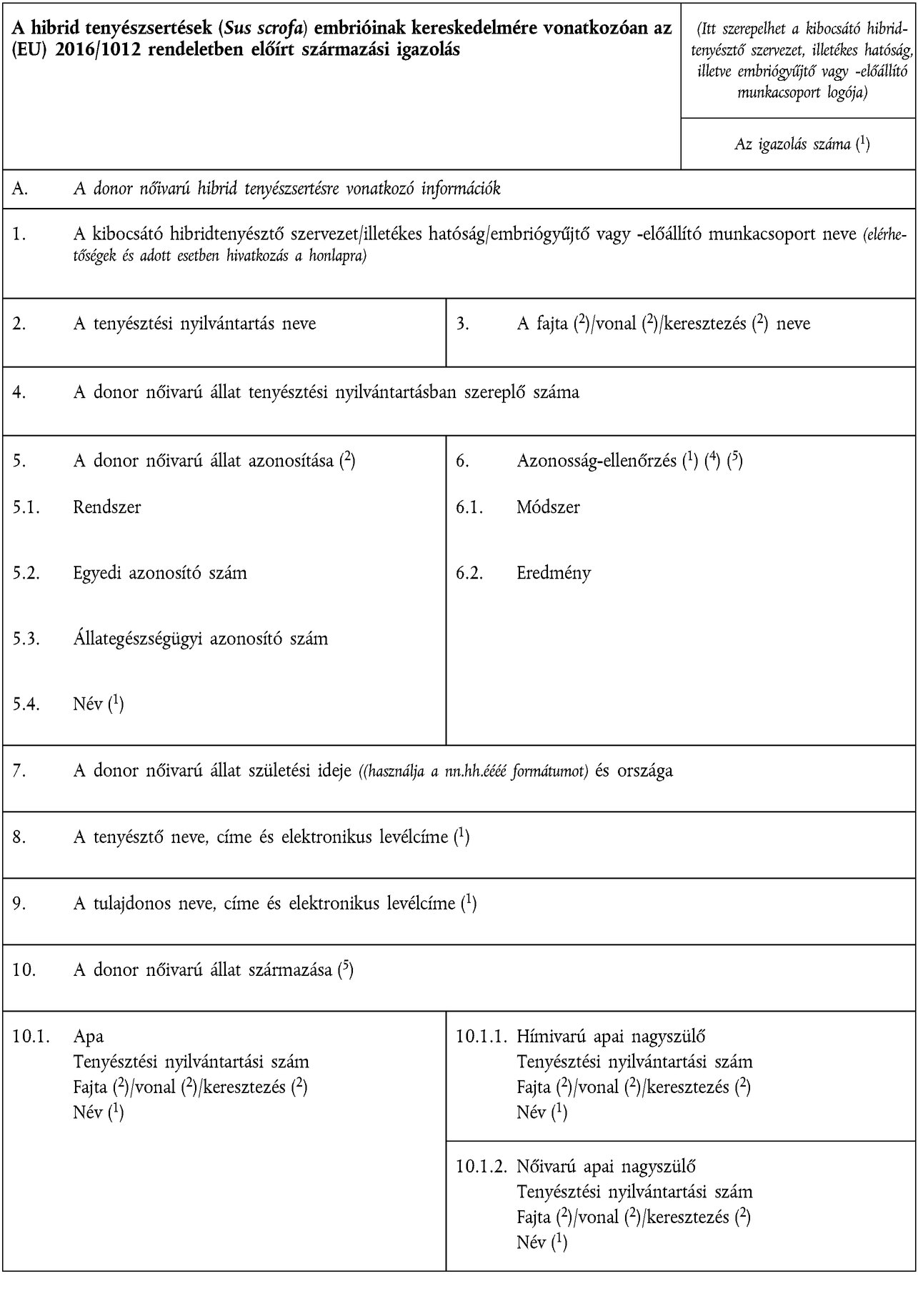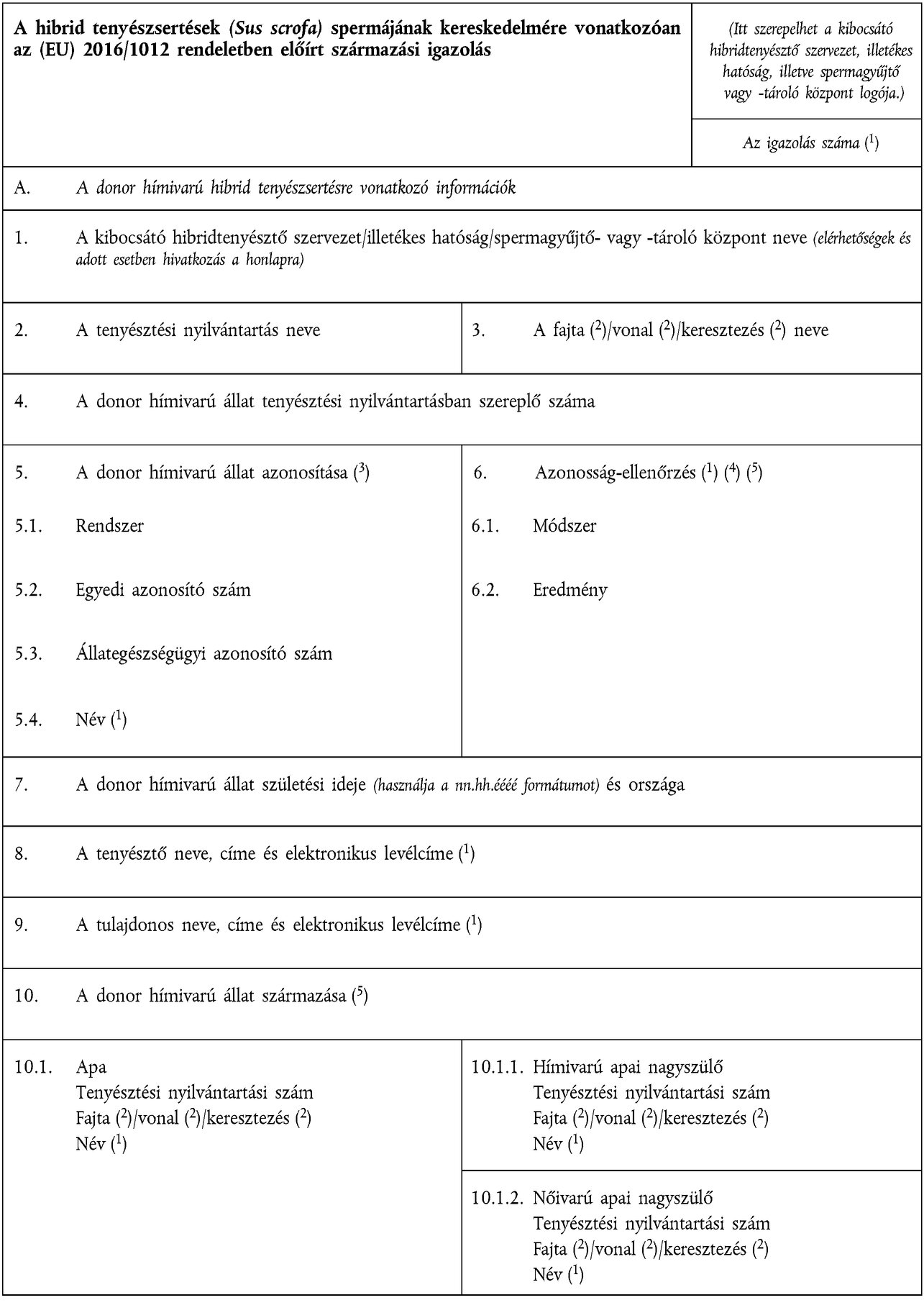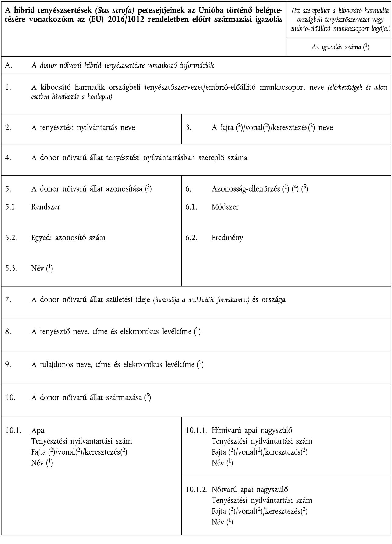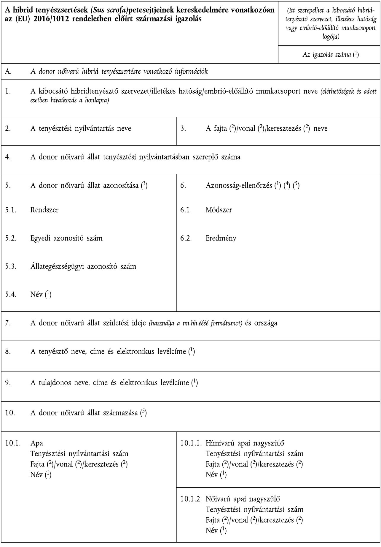 A hibrid tenyészsertések (Sus scrofa) Unióba történő beléptetésére vonatkozóan az (EU) 2016/1012 rendeletben előírt származási igazolás (1)