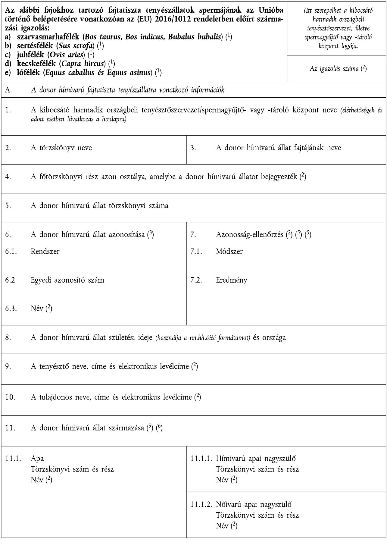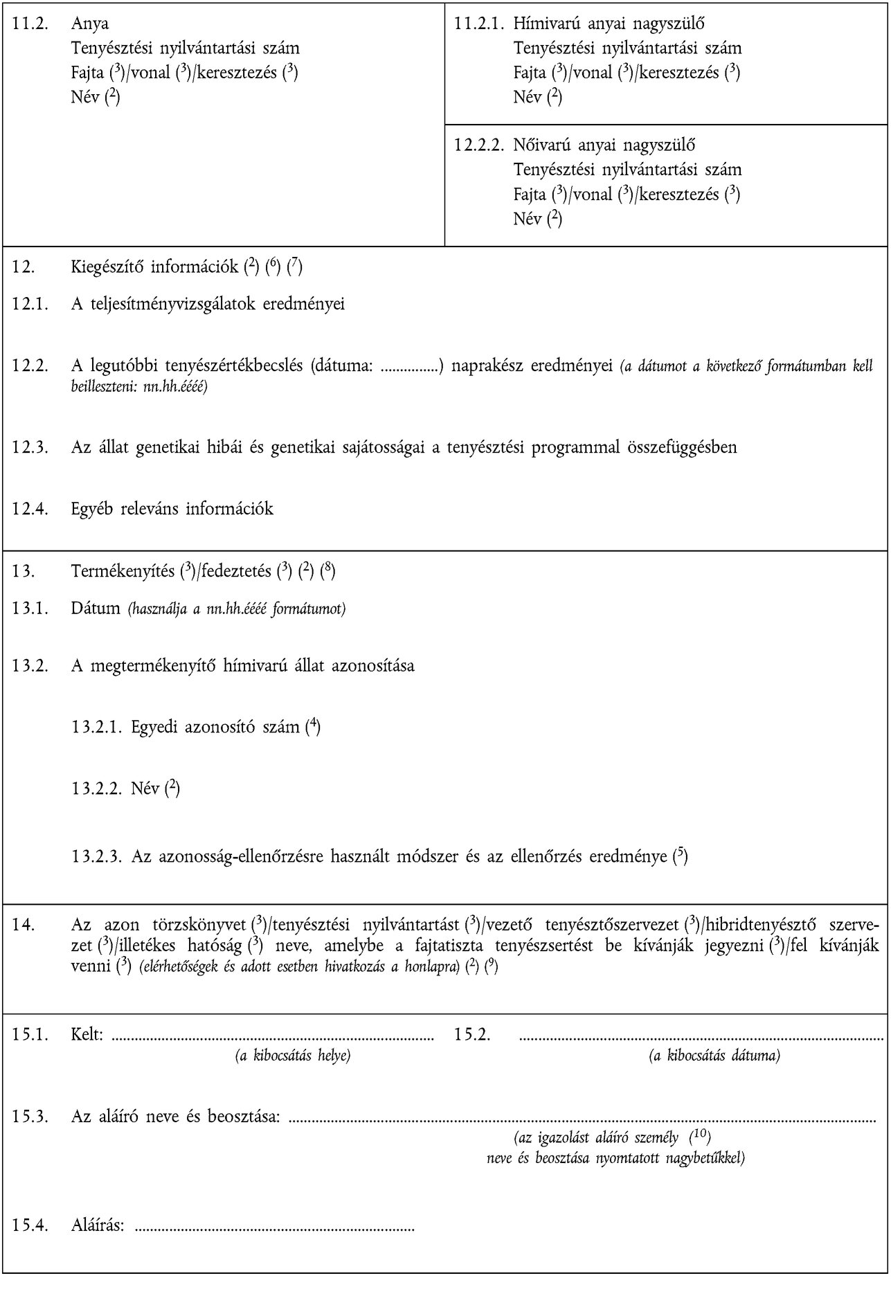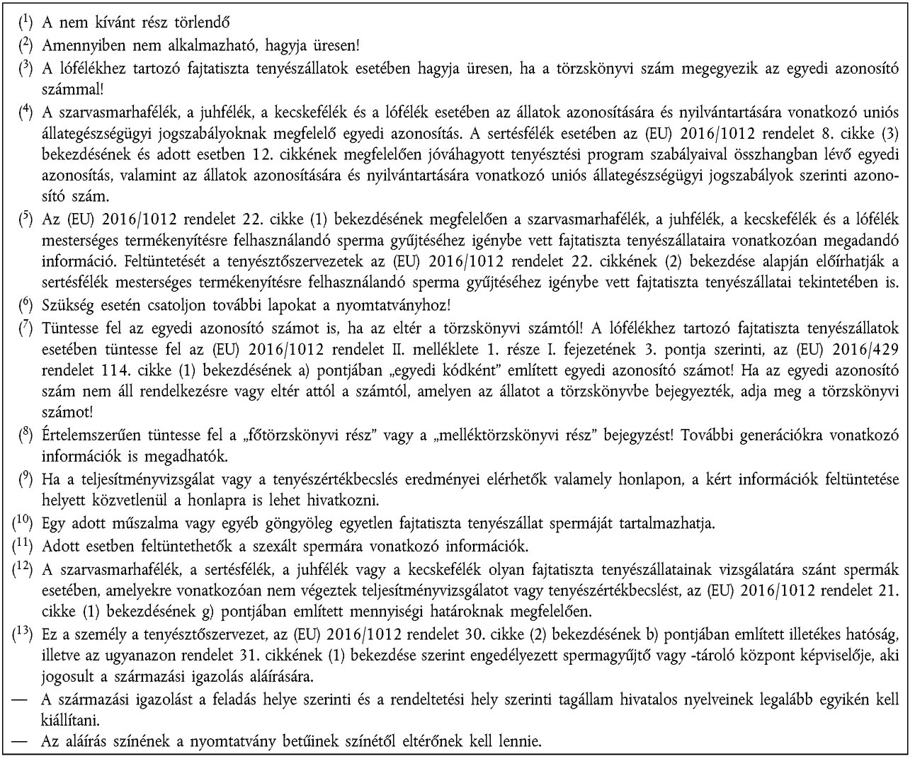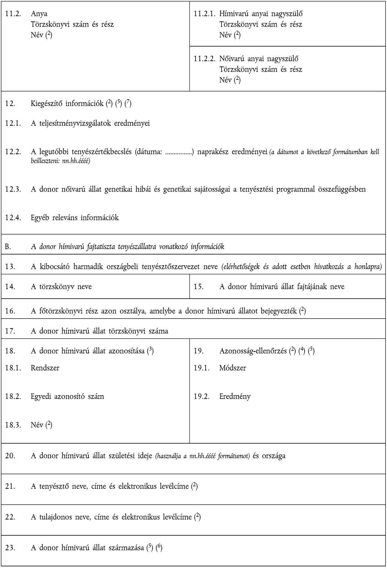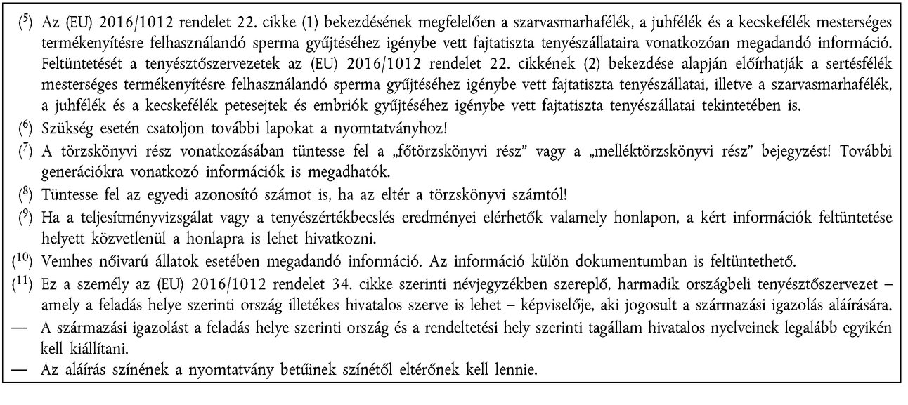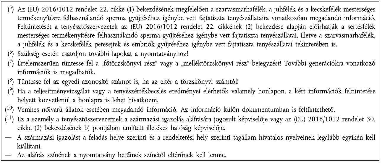 (4) Az (EU) 2016/1012 rendelet 22. cikke (1) bekezdésének megfelelően a szarvasmarhafélék, a juhfélék, a kecskefélék és a lófélék mesterséges termékenyítésre felhasználandó sperma gyűjtéséhez igénybe vett fajtatiszta tenyészállataira vonatkozóan megadandó információ. Feltüntetését az (EU) 2016/1012 rendelet 22. cikkének (2) bekezdése alapján a szarvasmarhafélék, a sertésfélék, a juhfélék, a kecskefélék és a lófélék petesejtek és embriók gyűjtéséhez igénybe vett fajtatiszta tenyészállatai tekintetében is előírhatják az azon törzskönyvet vezető tenyésztőszervezetek, amelybe az érintett embriókból nyert utódok bejegyzésre kerülnek.