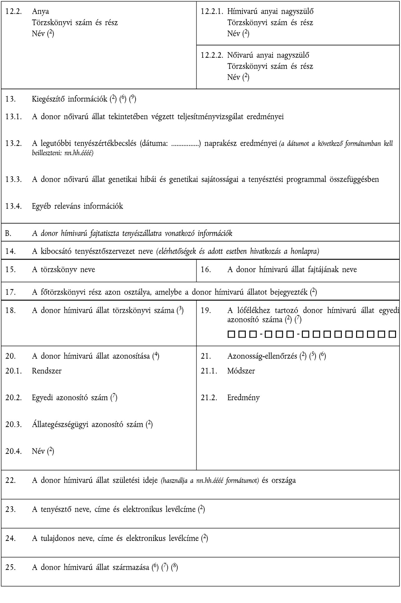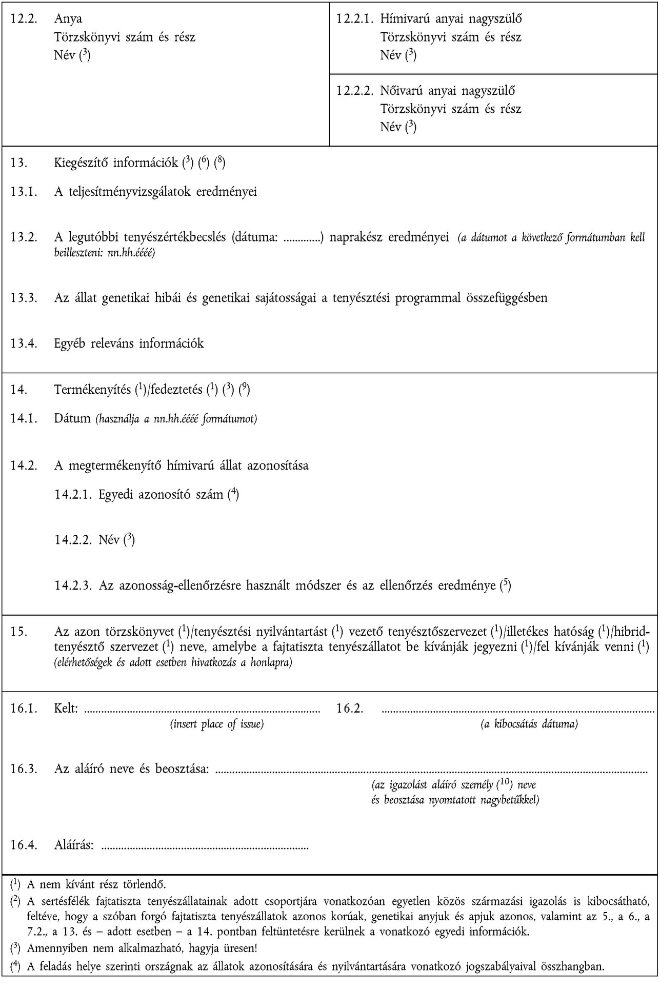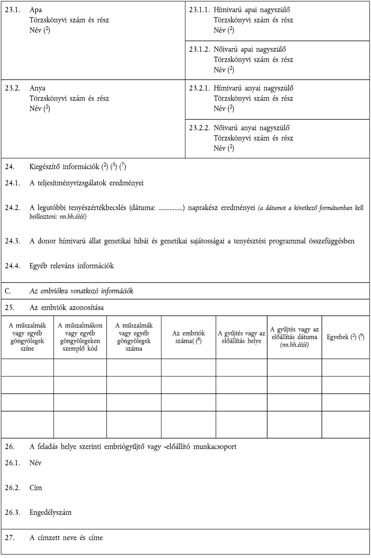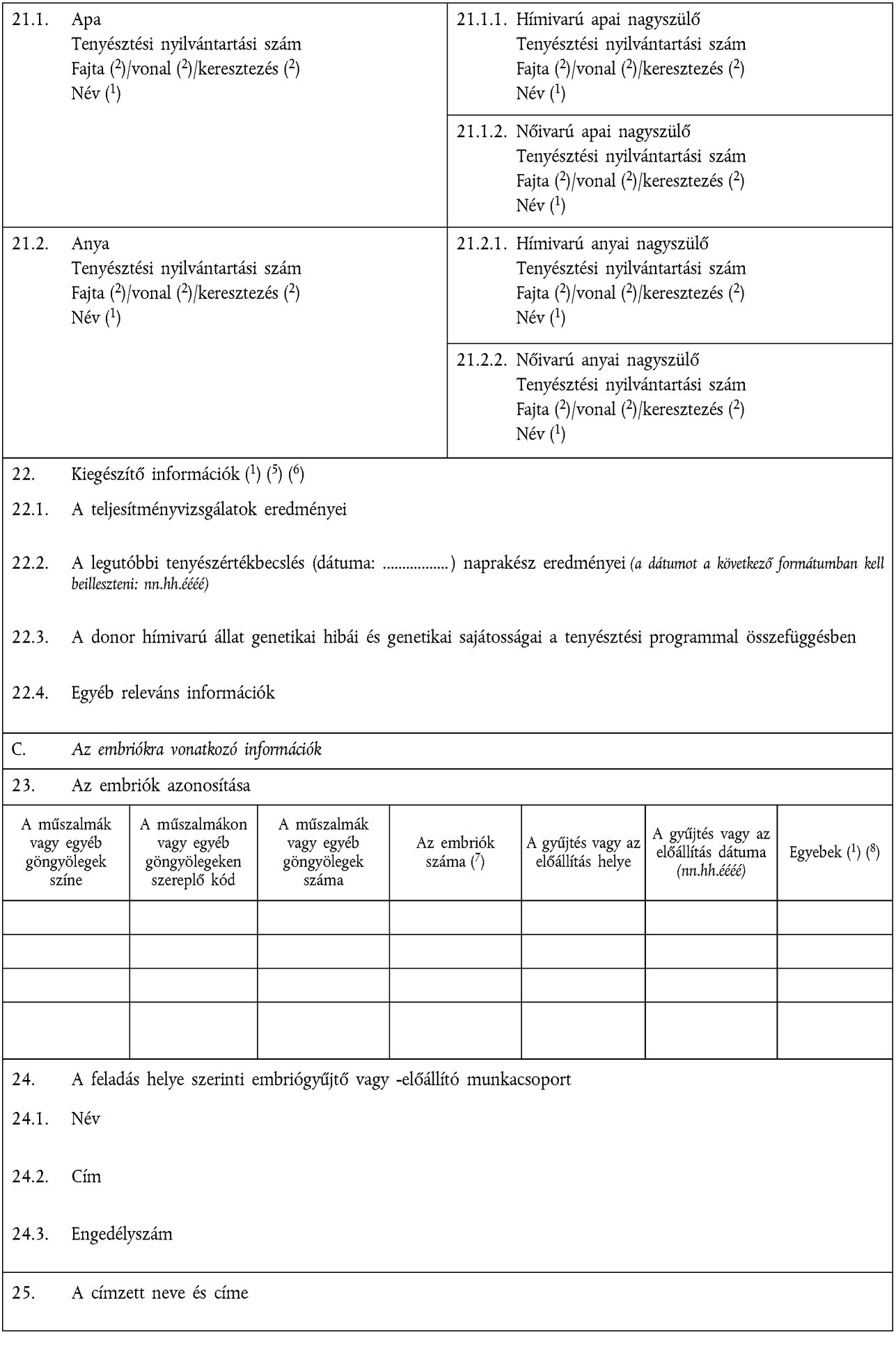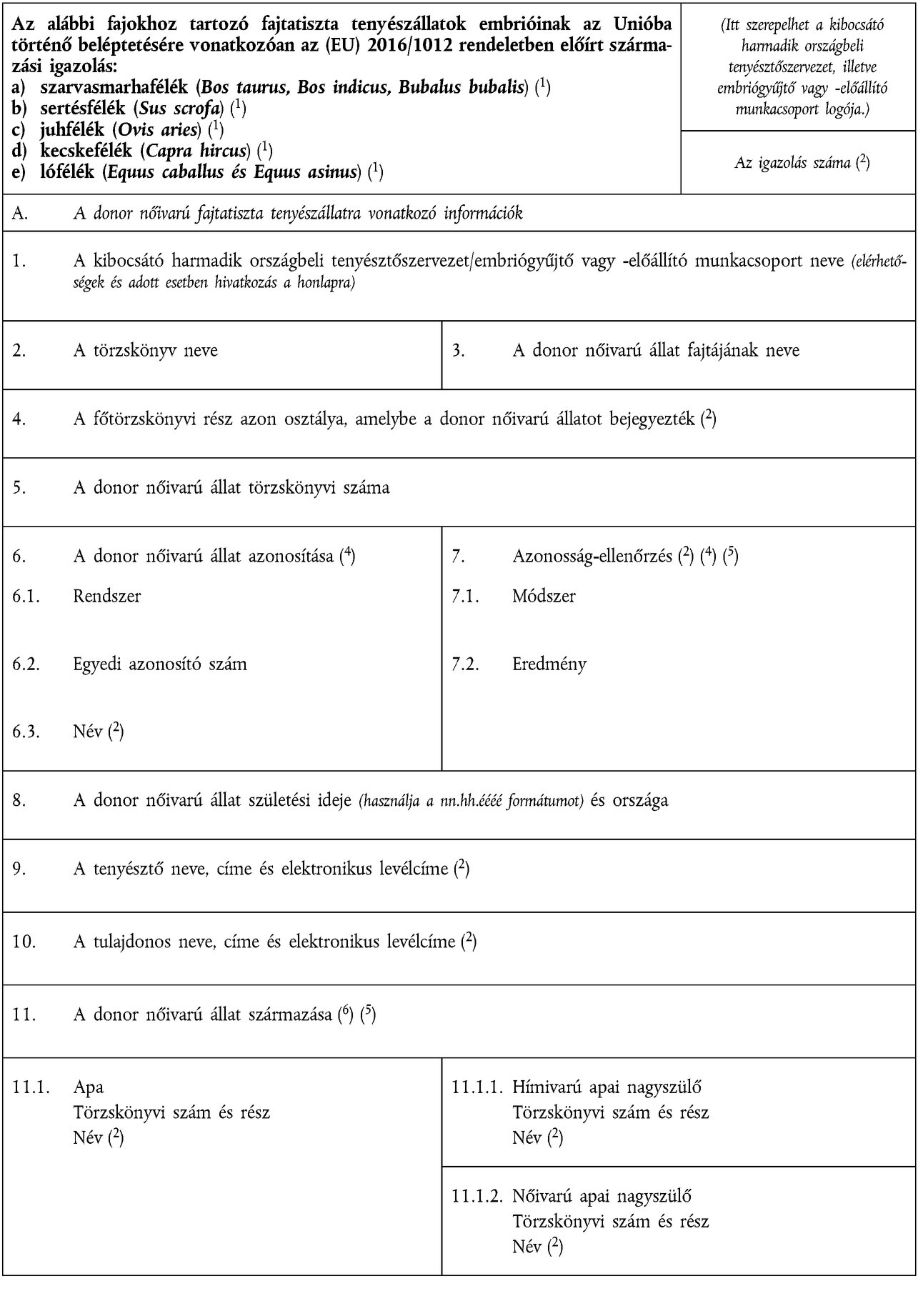 (4) Az (EU) 2016/1012 rendelet 22. cikke (1) bekezdésének megfelelően a szarvasmarhafélék, a juhfélék, a kecskefélék és a lófélék mesterséges termékenyítésre felhasználandó sperma gyűjtéséhez igénybe vett fajtatiszta tenyészállataira vonatkozóan megadandó információ. Feltüntetését az (EU) 2016/1012 rendelet 22. cikkének (2) bekezdése alapján a szarvasmarhafélék, a sertésfélék, a juhfélék, a kecskefélék és a lófélék petesejtek és embriók gyűjtéséhez igénybe vett fajtatiszta tenyészállatai tekintetében is előírhatják az azon törzskönyvet vezető tenyésztőszervezetek, amelybe az érintett embriókból nyert utódok bejegyzésre kerülnek.