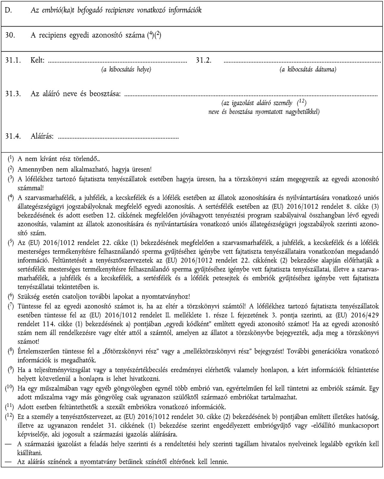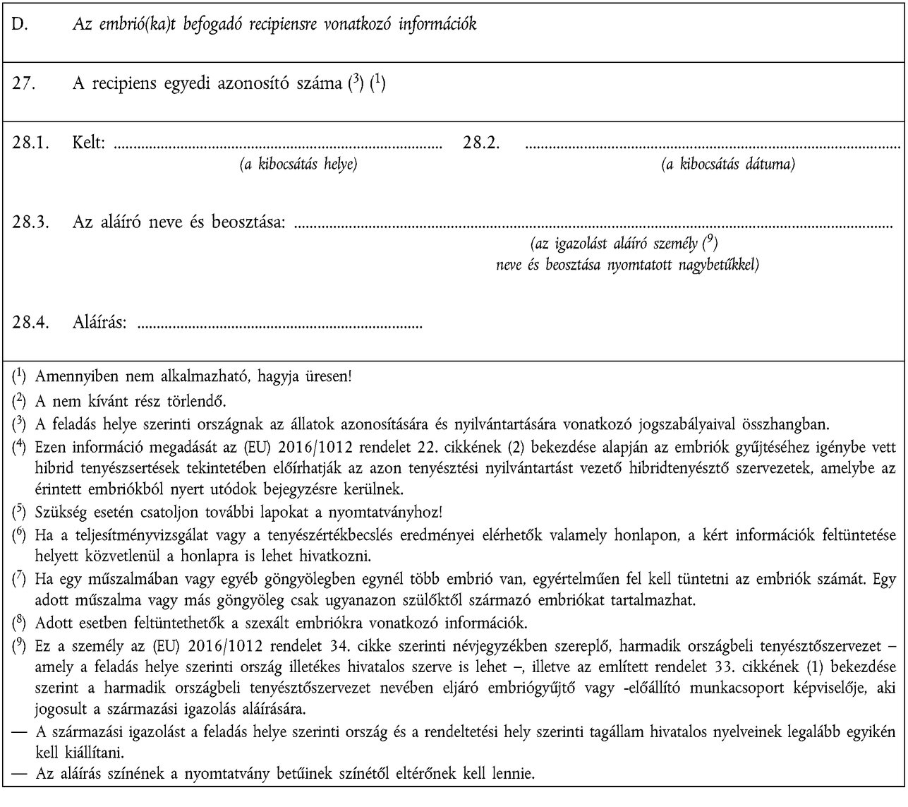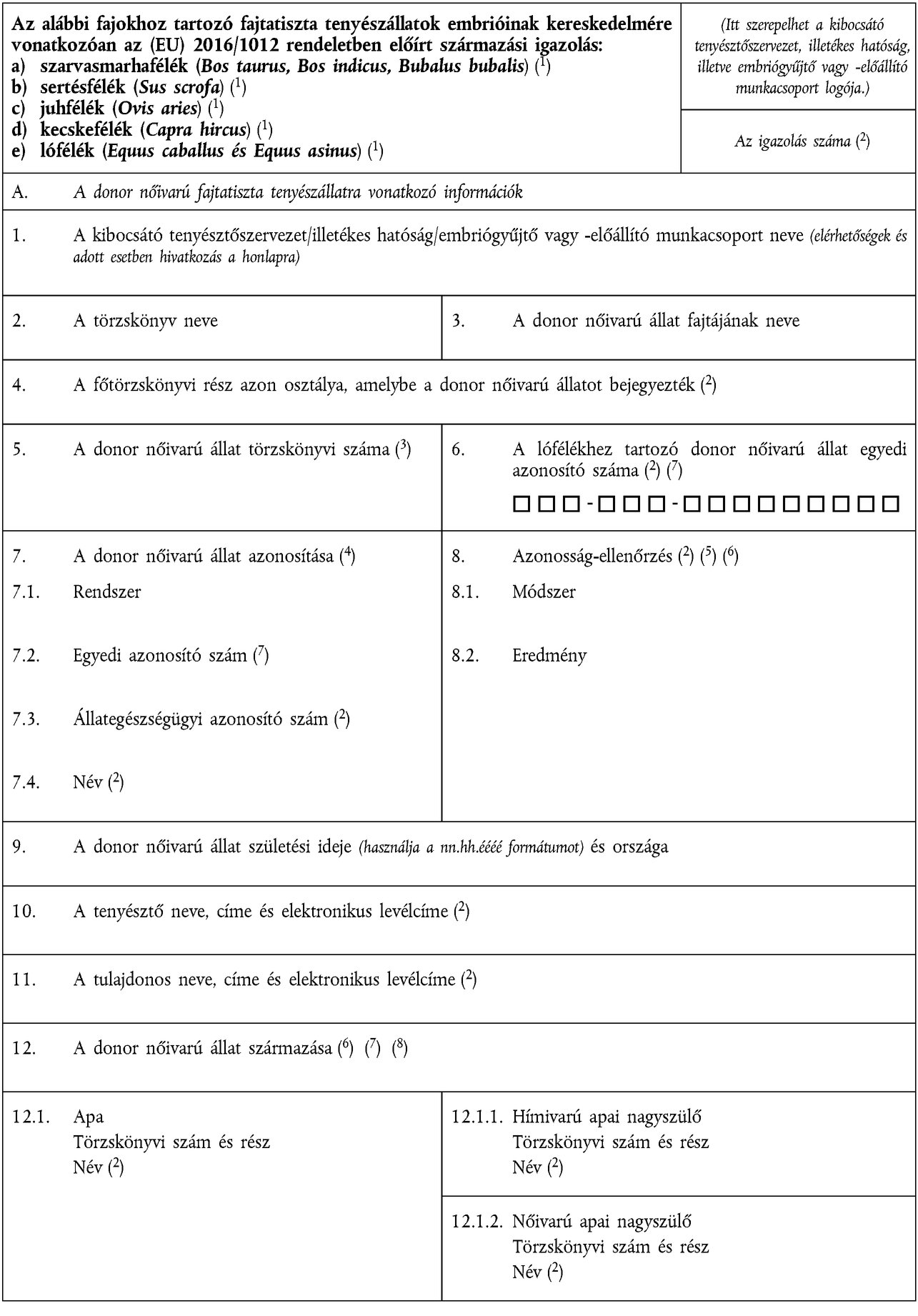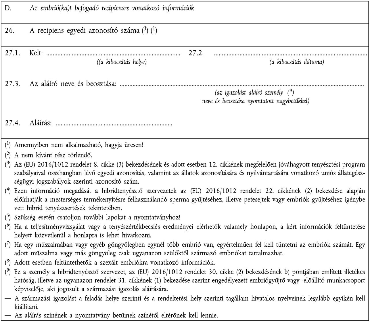 (8) Ez a személy az (EU) 2016/1012 rendelet 34. cikke szerinti névjegyzékben szereplő, harmadik országbeli tenyésztőszervezet - amely a feladás helye szerinti ország illetékes hivatalos szerve is lehet -, illetve az említett rendelet 33. cikkének (1) bekezdése szerint a harmadik országbeli tenyésztőszervezet nevében eljáró embrió-előállító munkacsoport képviselője, aki jogosult a származási igazolás aláírására.