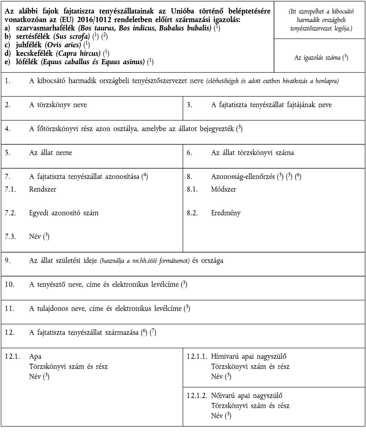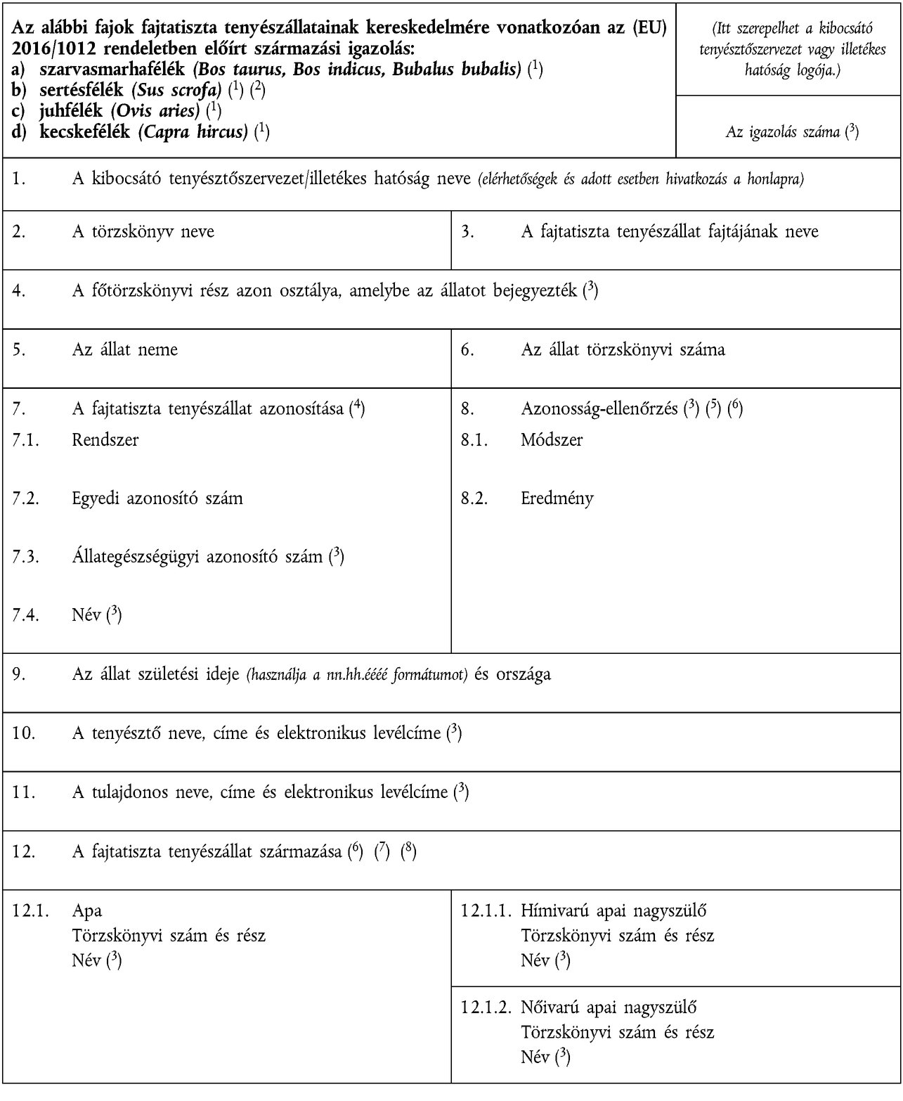 Az alábbi fajok fajtatiszta tenyészállatainak kereskedelmére vonatkozóan az (EU) 2016/1012 rendeletben előírt származási igazolás: