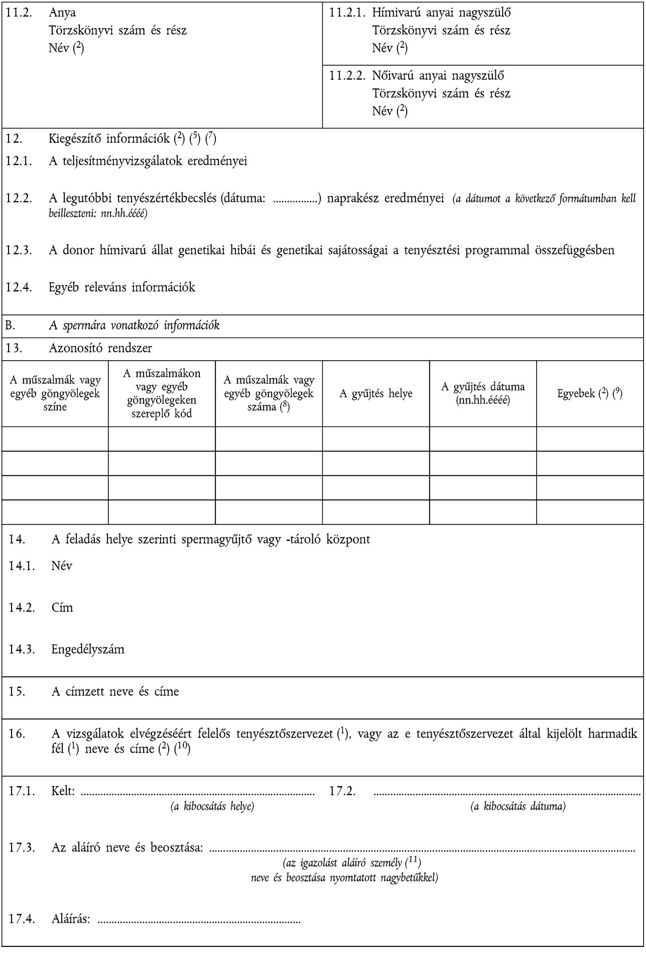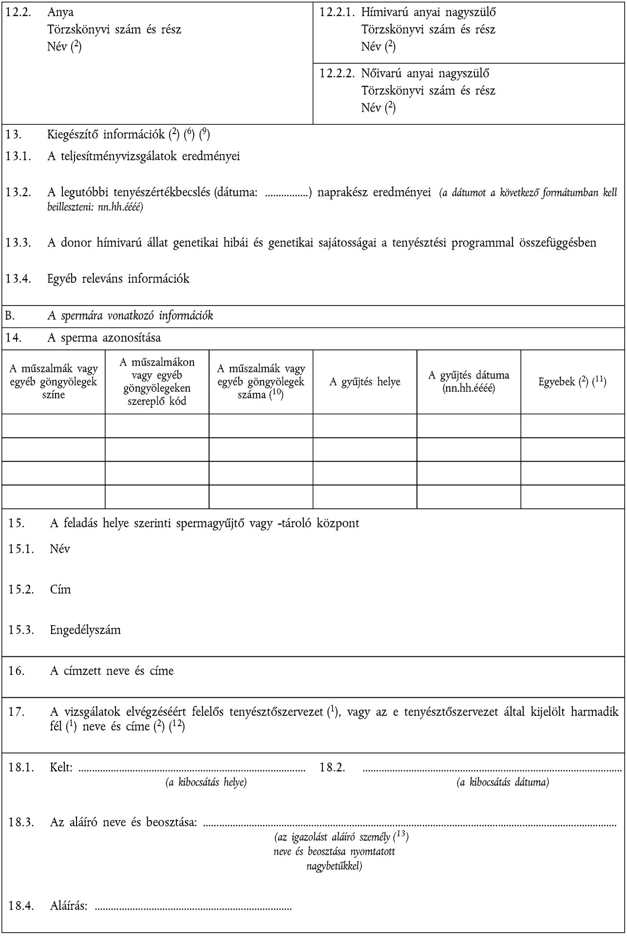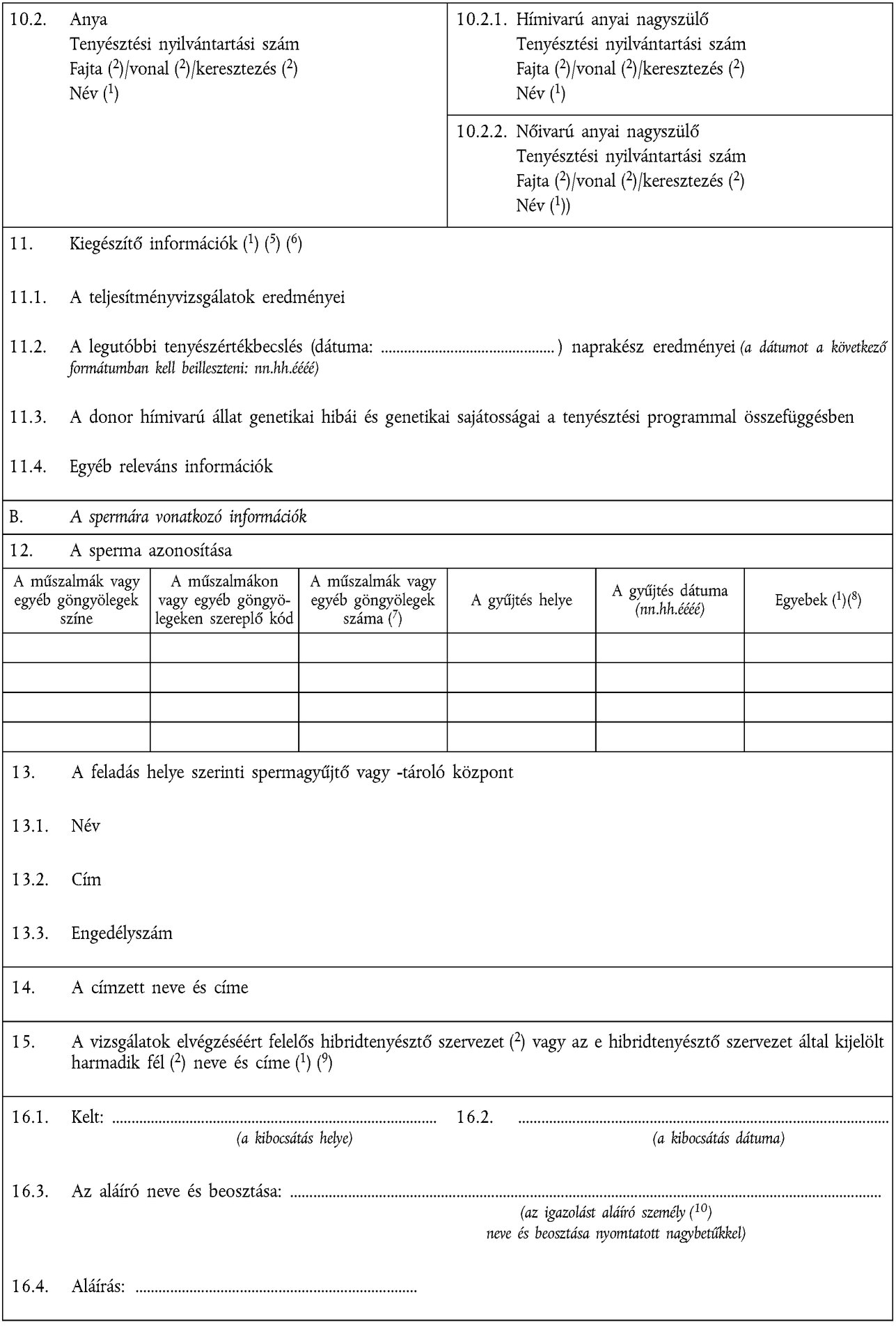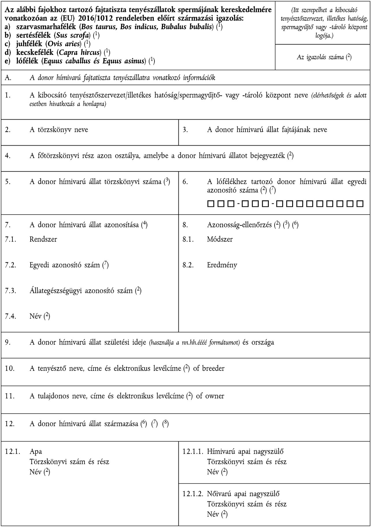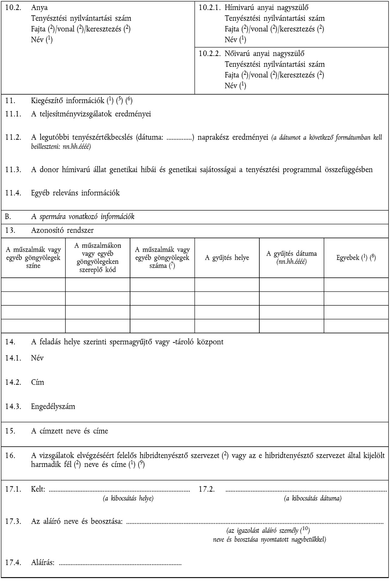 (10) Ez a személy az (EU) 2016/1012 rendelet 34. cikke szerinti névjegyzékben szereplő, harmadik országbeli tenyésztőszervezet - amely a feladás helye szerinti ország illetékes hivatalos szerve is lehet -, illetve az említett rendelet 33. cikkének (1) bekezdése szerint a harmadik országbeli tenyésztőszervezet nevében eljáró spermagyűjtő vagy -tároló központ képviselője, aki jogosult a származási igazolás aláírására.