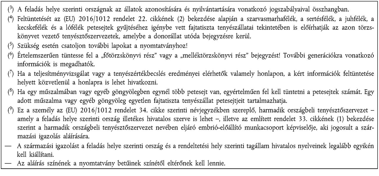 (9) Ez a személy az (EU) 2016/1012 rendelet 34. cikke szerinti névjegyzékben szereplő, harmadik országbeli tenyésztőszervezet - amely a feladás helye szerinti ország illetékes hivatalos szerve is lehet -, illetve az említett rendelet 33. cikkének (1) bekezdése szerint a harmadik országbeli tenyésztőszervezet nevében eljáró embriógyűjtő vagy -előállító munkacsoport képviselője, aki jogosult a származási igazolás aláírására.