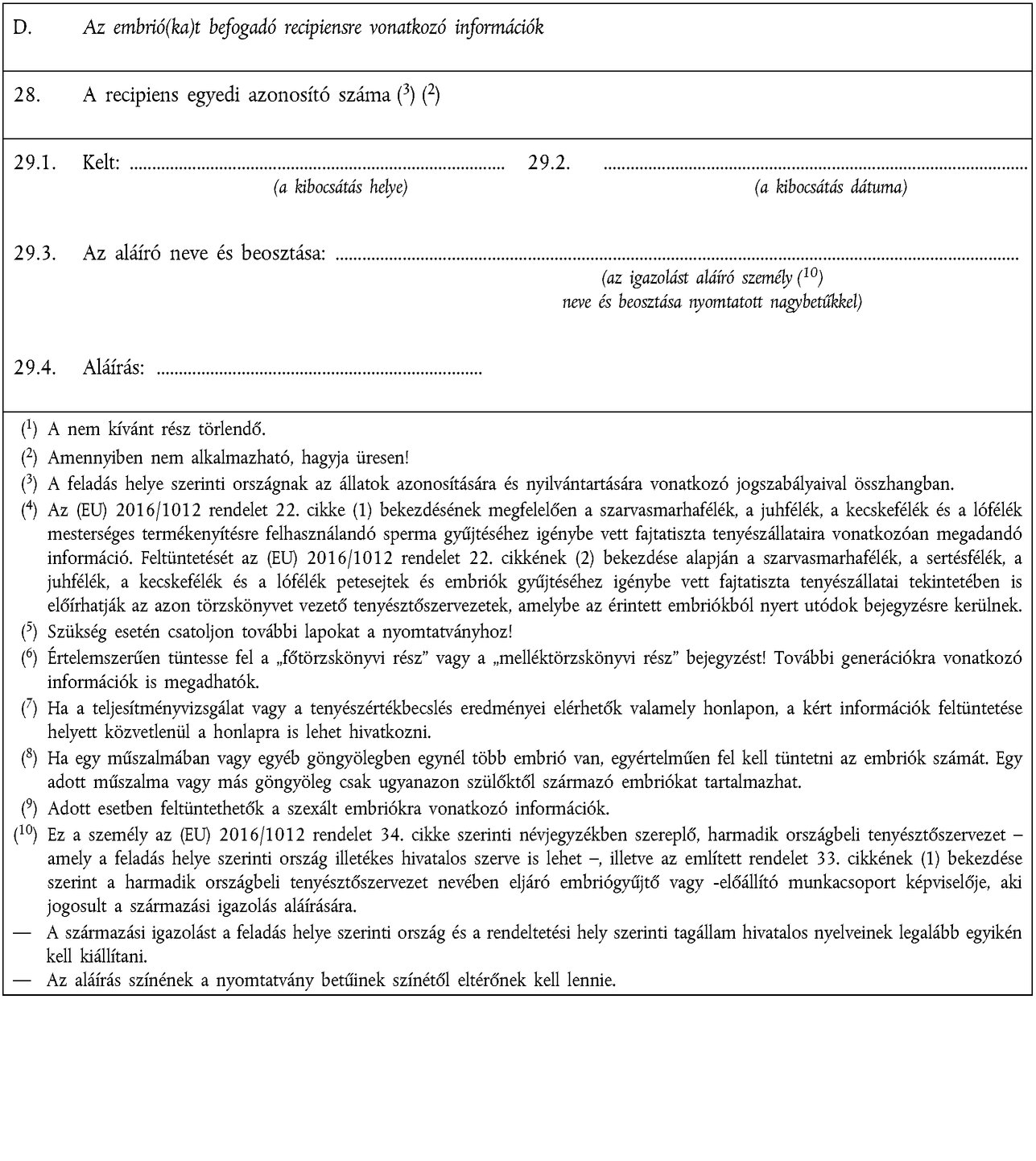 (10) Ez a személy az (EU) 2016/1012 rendelet 34. cikke szerinti névjegyzékben szereplő, harmadik országbeli tenyésztőszervezet - amely a feladás helye szerinti ország illetékes hivatalos szerve is lehet -, illetve az említett rendelet 33. cikkének (1) bekezdése szerint a harmadik országbeli tenyésztőszervezet nevében eljáró embriógyűjtő vagy -előállító munkacsoport képviselője, aki jogosult a származási igazolás aláírására.