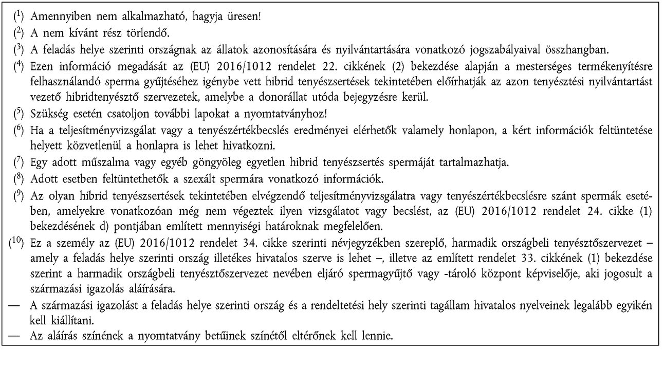 A hibrid tenyészsertések (Sus scrofa) spermájának az Unióba történő beléptetésére vonatkozóan az (EU) 2016/1012 rendeletben előírt származási igazolás