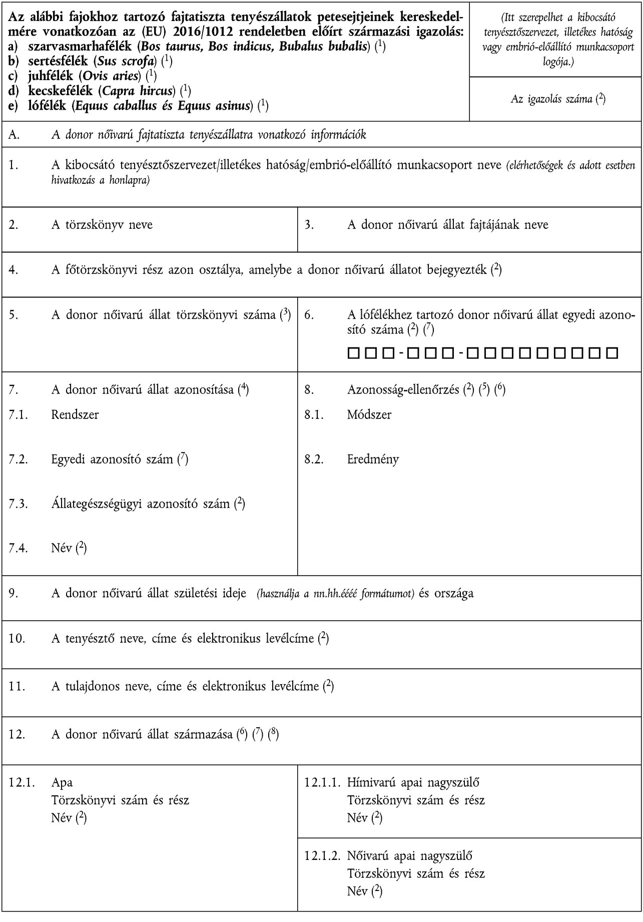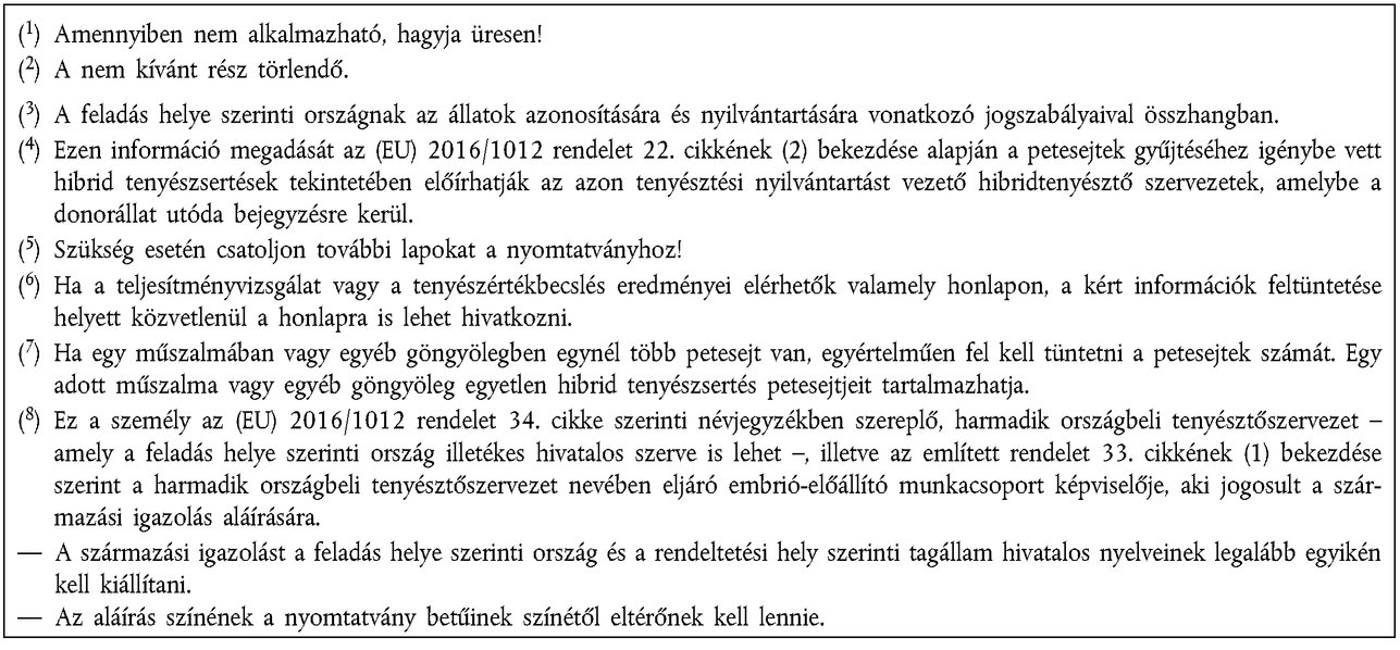 A hibrid tenyészsertések (Sus scrofa) petesejtjeinek az Unióba történő beléptetésére vonatkozóan az (EU) 2016/1012 rendeletben előírt származási igazolás