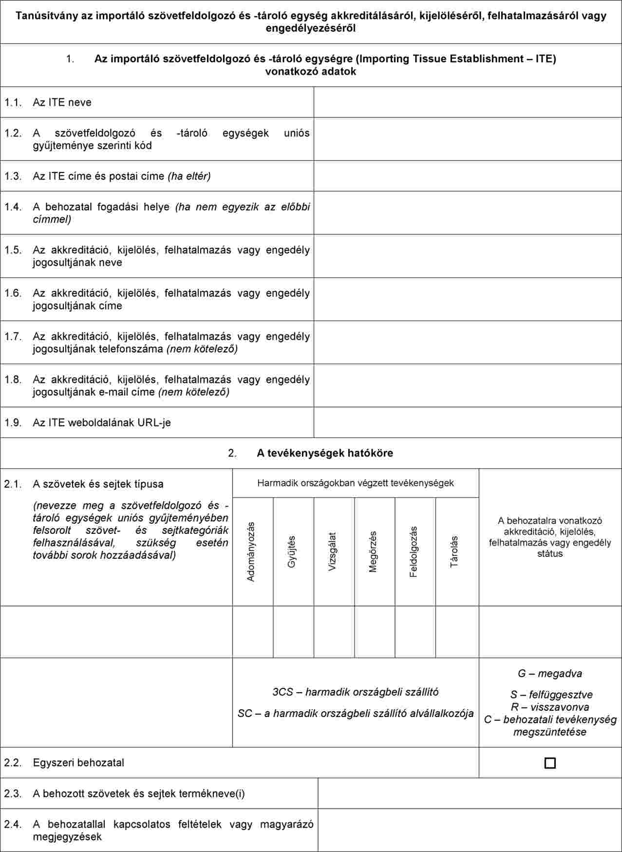 Az illetékes hatóság(ok) által az importáló szövetfeldolgozó és -tároló egység számára kiállítandó tanúsítvány az akkreditálásról, kijelölésről, felhatalmazásról vagy engedélyezésről