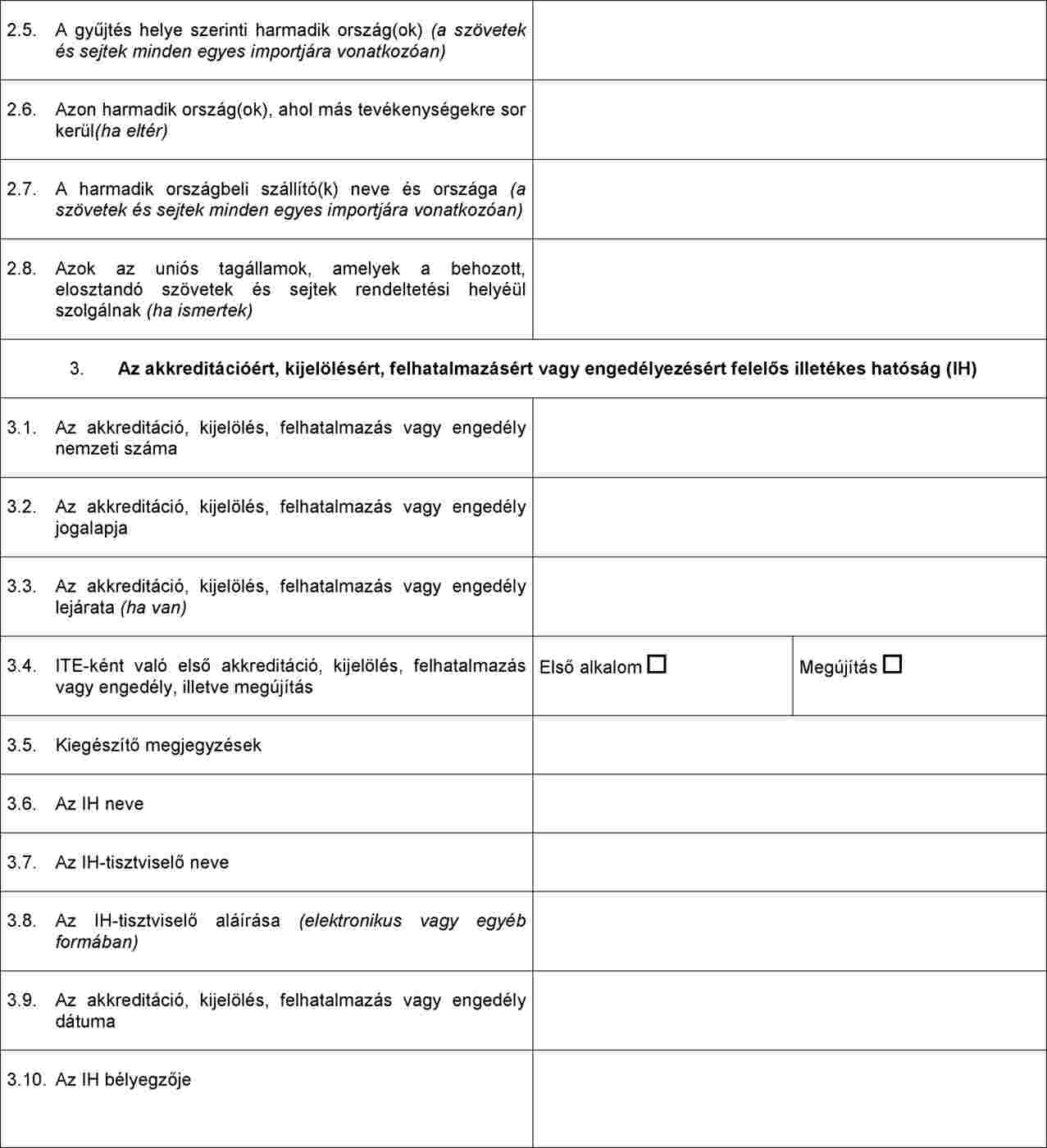 4. Az ITE kérelmezői státusa: Fel kell tüntetni, hogy az ITE-ként való akkreditáció, kijelölés, felhatalmazás vagy engedély iránti első kérelemről vagy - adott esetben - megújítás iránti kérelemről van-e szó. Ha a kérelmező már akkreditált, kijelölt, felhatalmazott vagy engedélyezett szövetfeldolgozó és -tároló egység (tissue establishment - TE), meg kell adni a TE-gyűjtemény szerinti kódot.