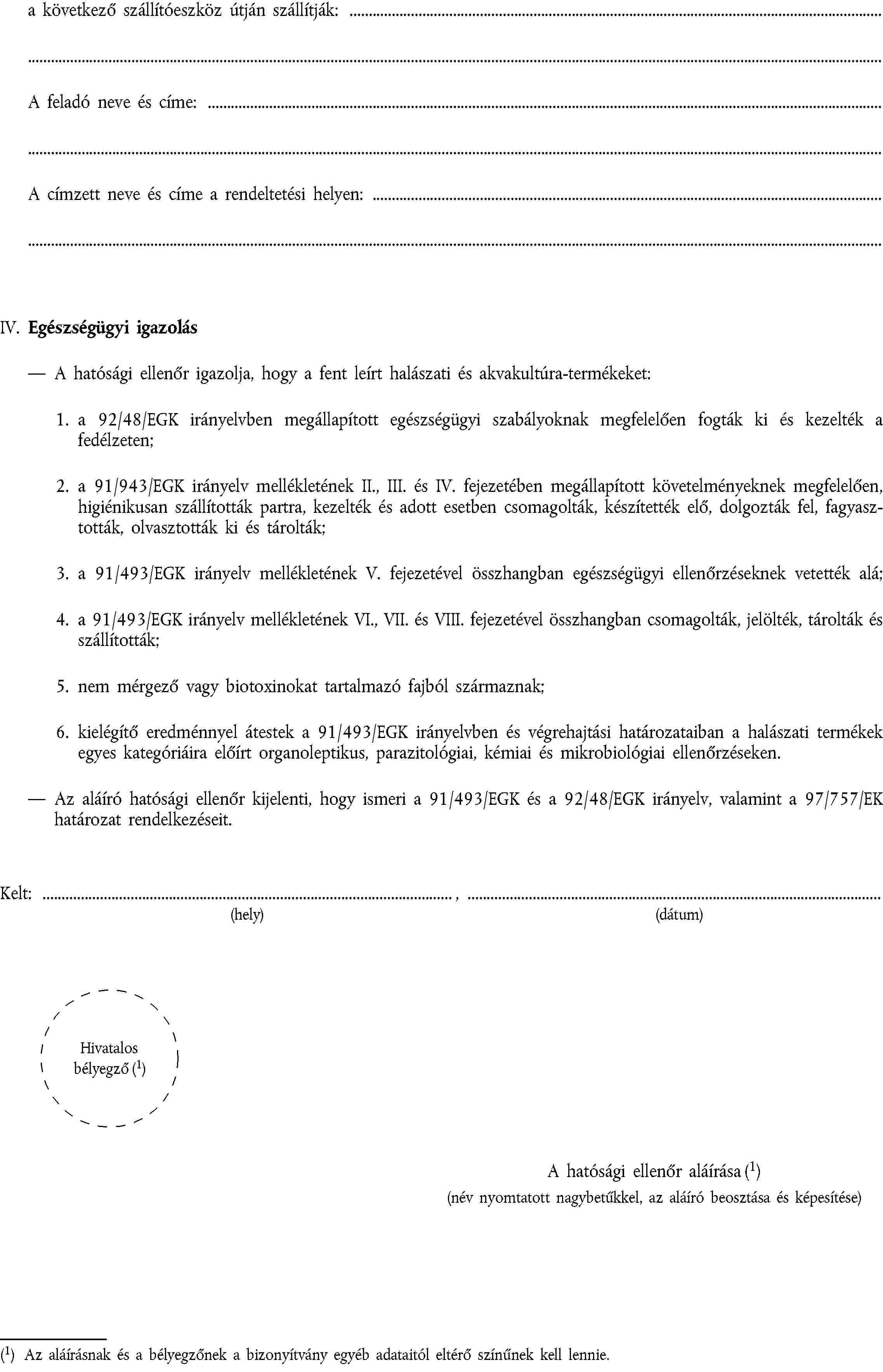 mivel a 91/493/EGK irányelv 11. cikke (4) bekezdésének a) pontjában említett, egészségügyi bizonyítvány megszerzésére vonatkozó eljárásnak ki kell terjednie egy bizonyítványminta meghatározására, a kiállítás nyelvére/nyelveire vonatkozó minimumkövetelményekre, valamint a bizonyítvány aláírására jogosult személy beosztására;