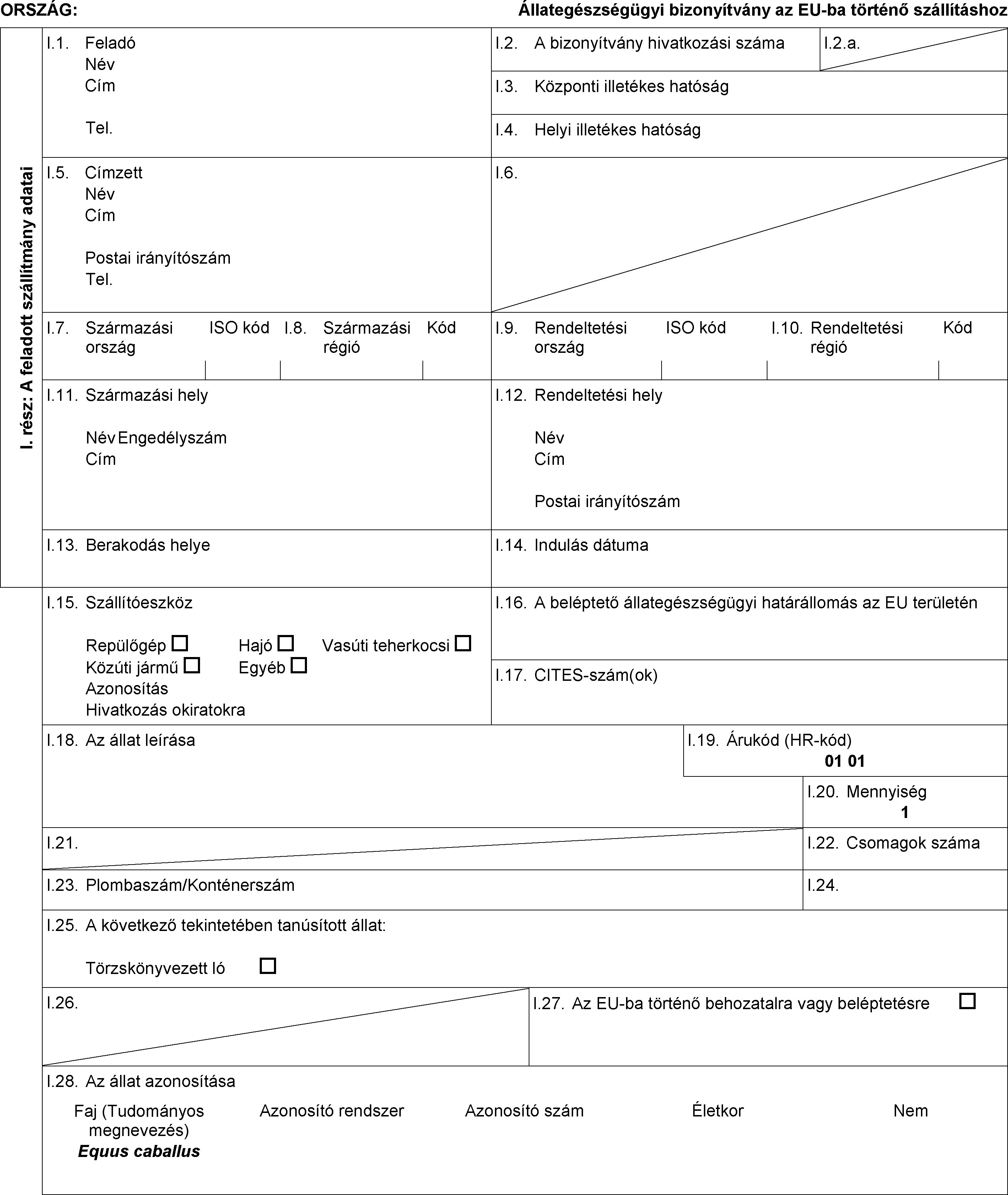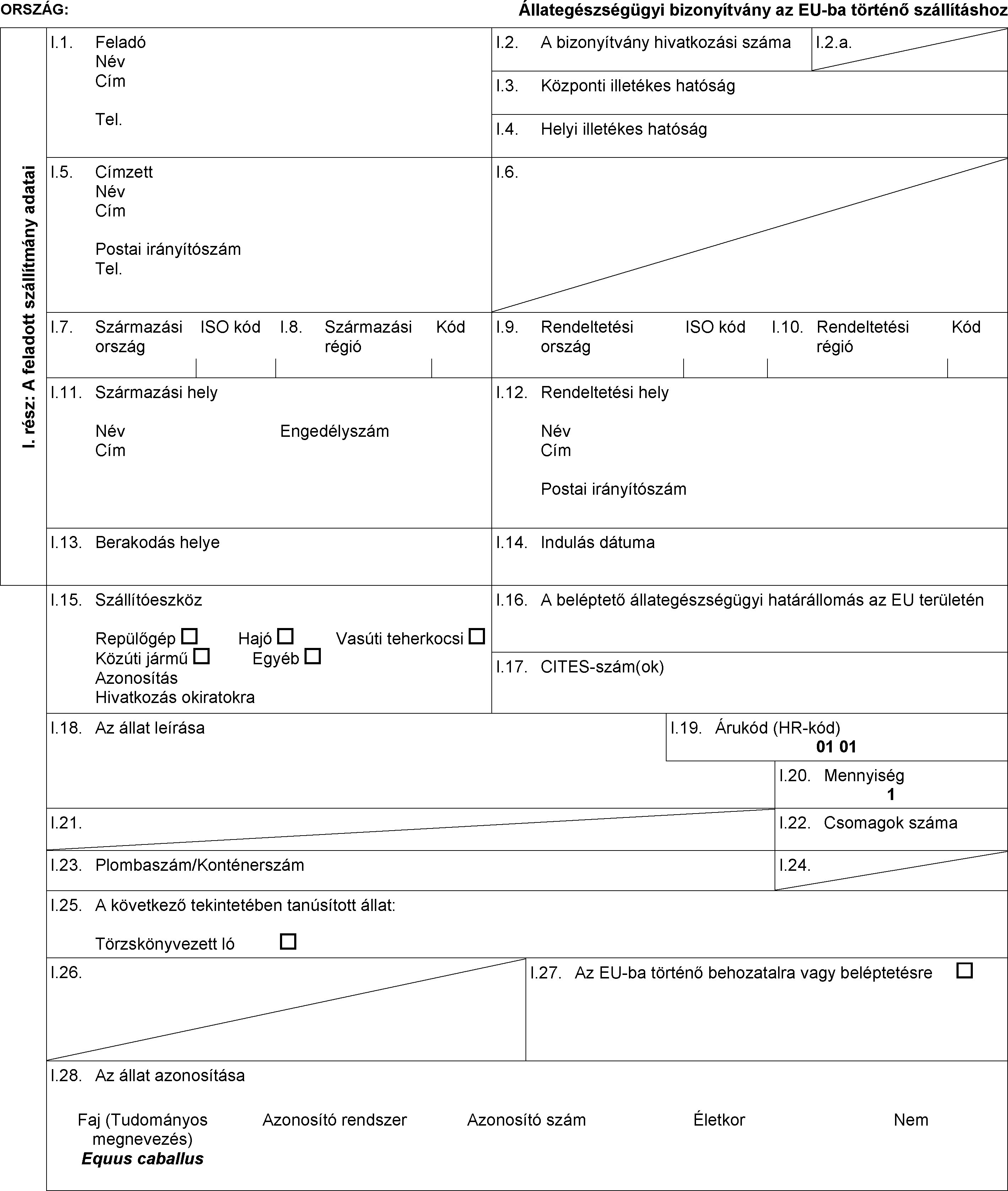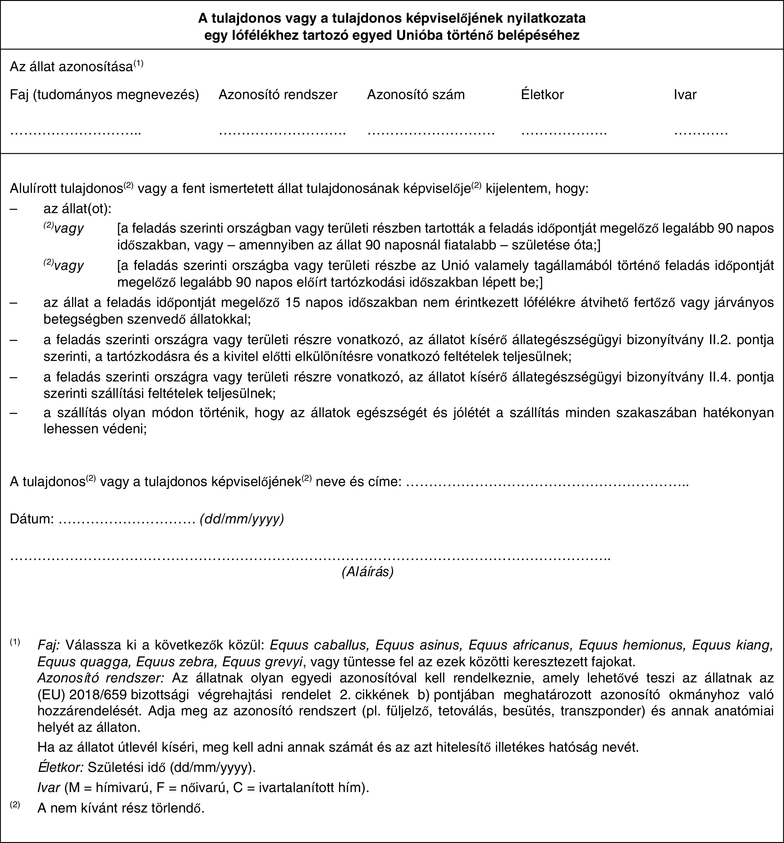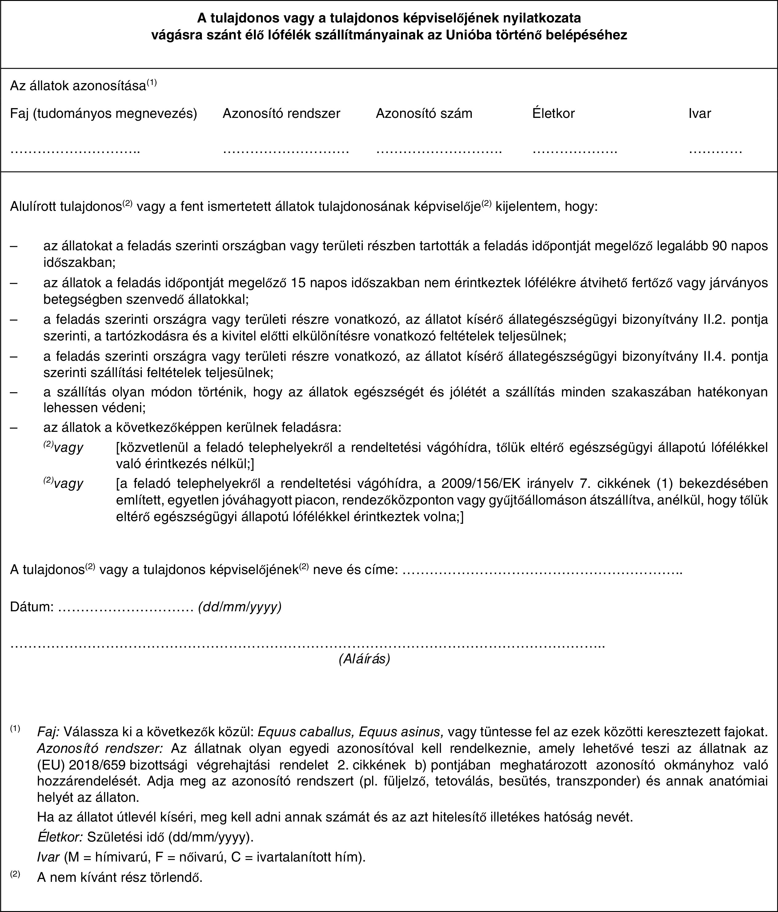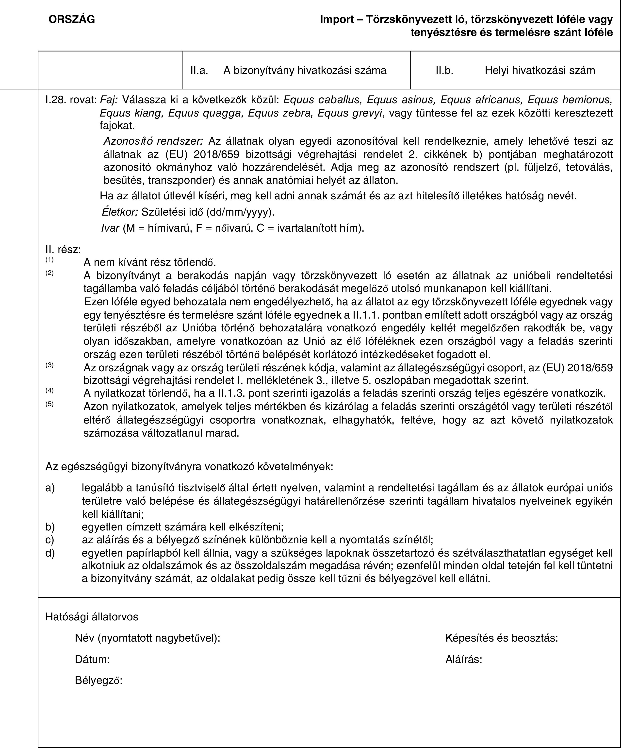 ÁLLATEGÉSZSÉGÜGYI BIZONYÍTVÁNYMINTÁK ÉS NYILATKOZATMINTÁK ÉLŐ LÓFÉLÉK UNIÓBA TÖRTÉNŐ BELÉPÉSÉHEZ