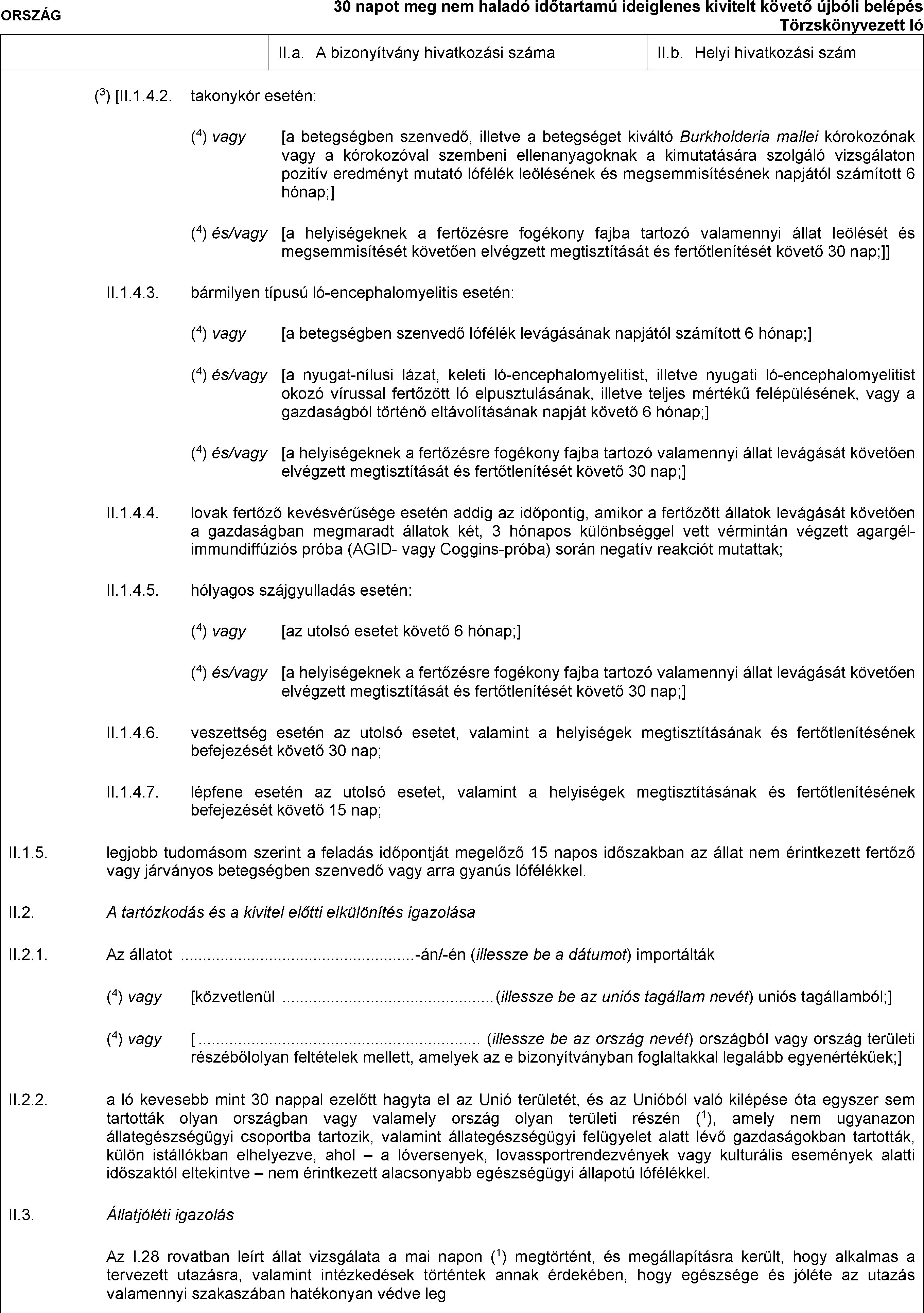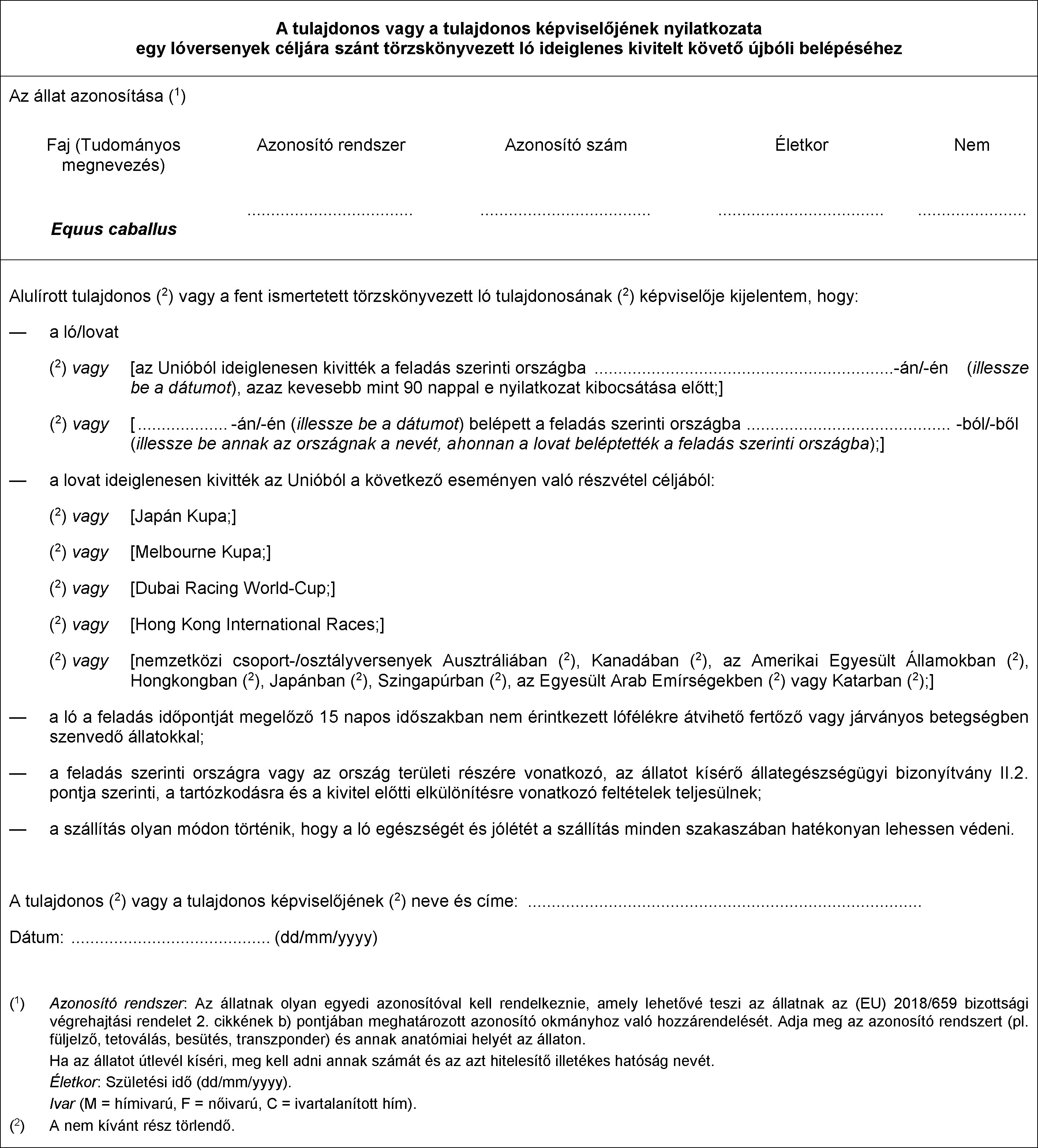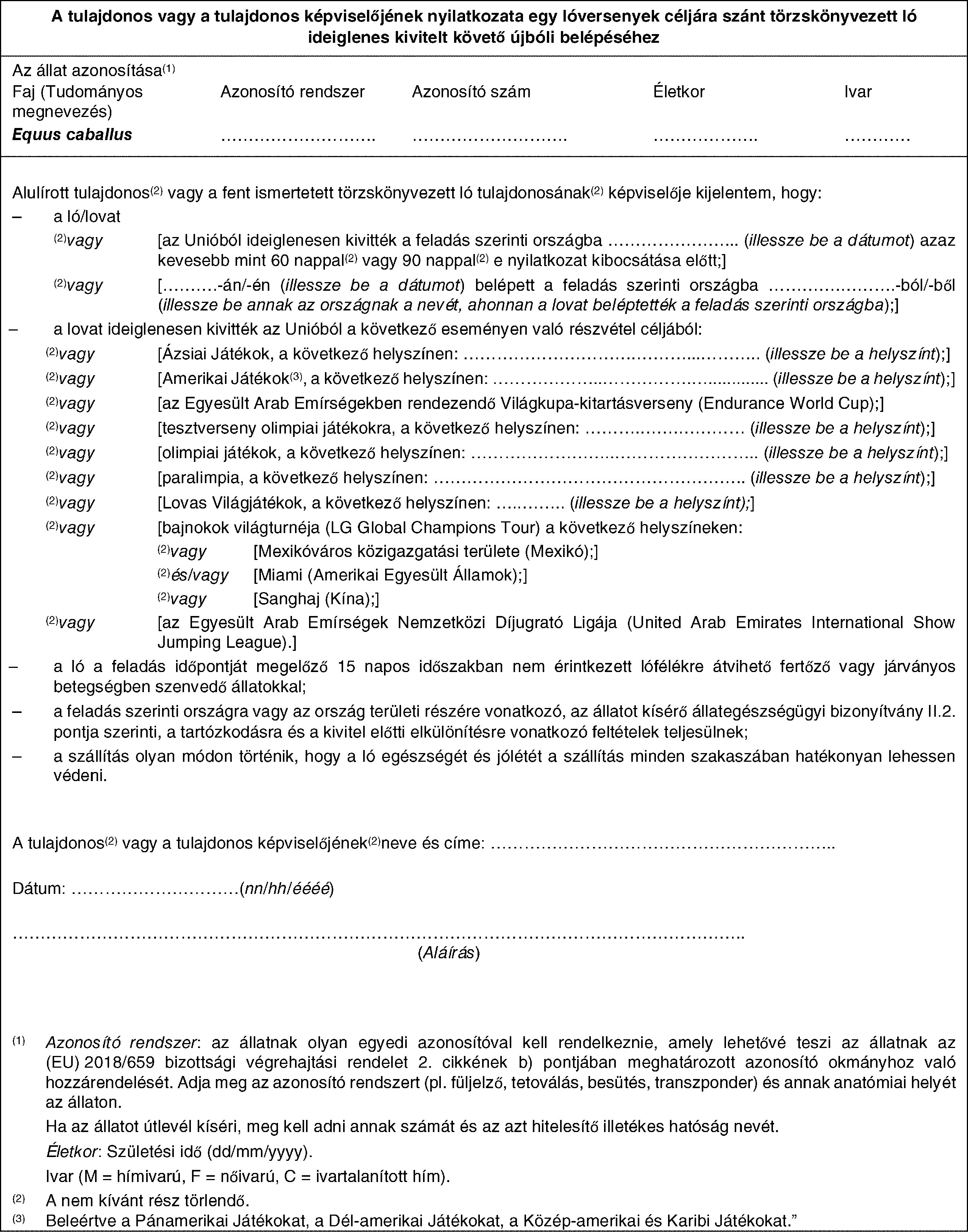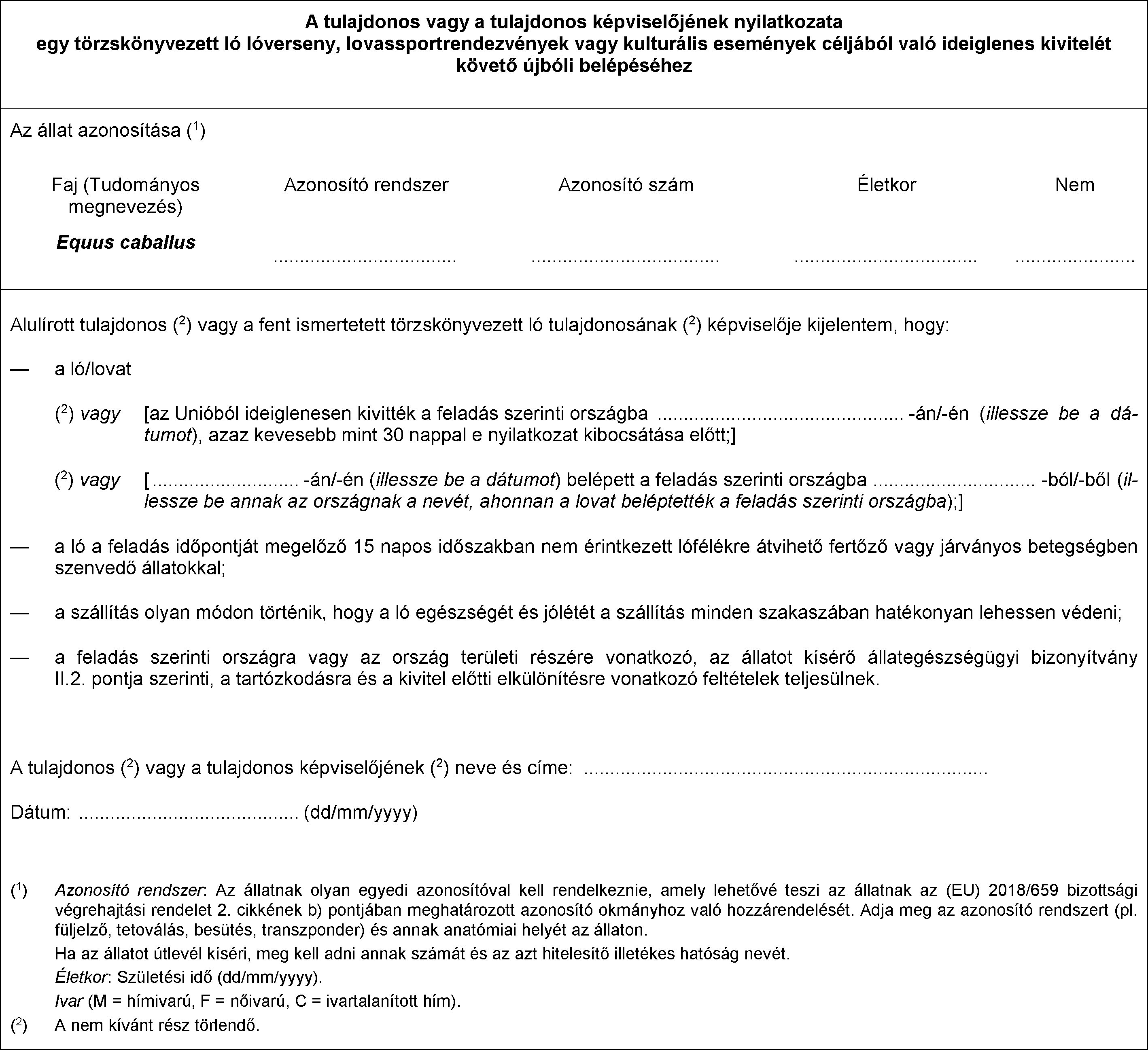 Állategészségügyi bizonyítványminta és nyilatkozatminta lóversenyek, lovassportrendezvények és kulturális események céljára szánt törzskönyvezett lovak 30 napot meg nem haladó időtartamú ideiglenes kivitelét követő újbóli uniós belépéséhez