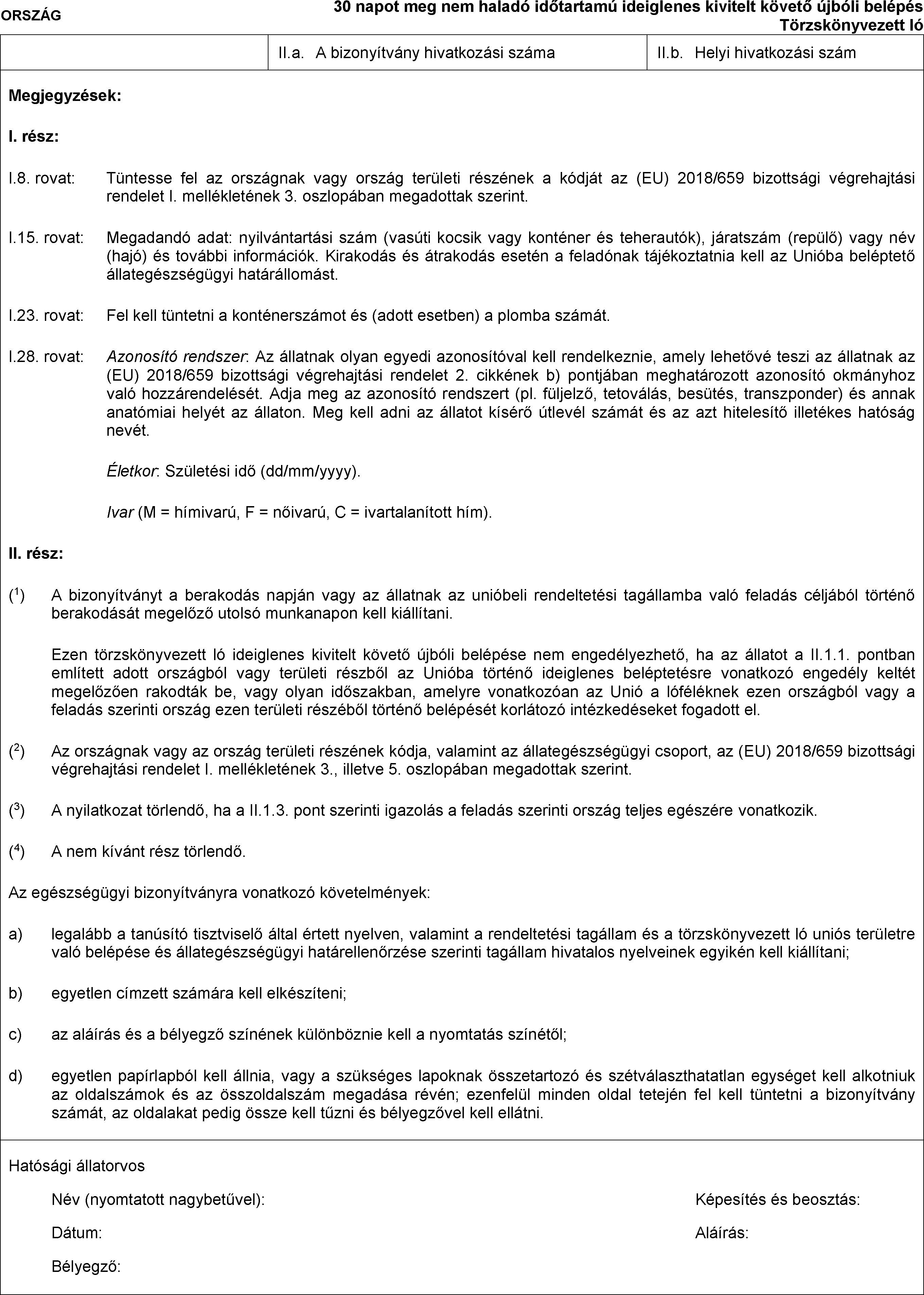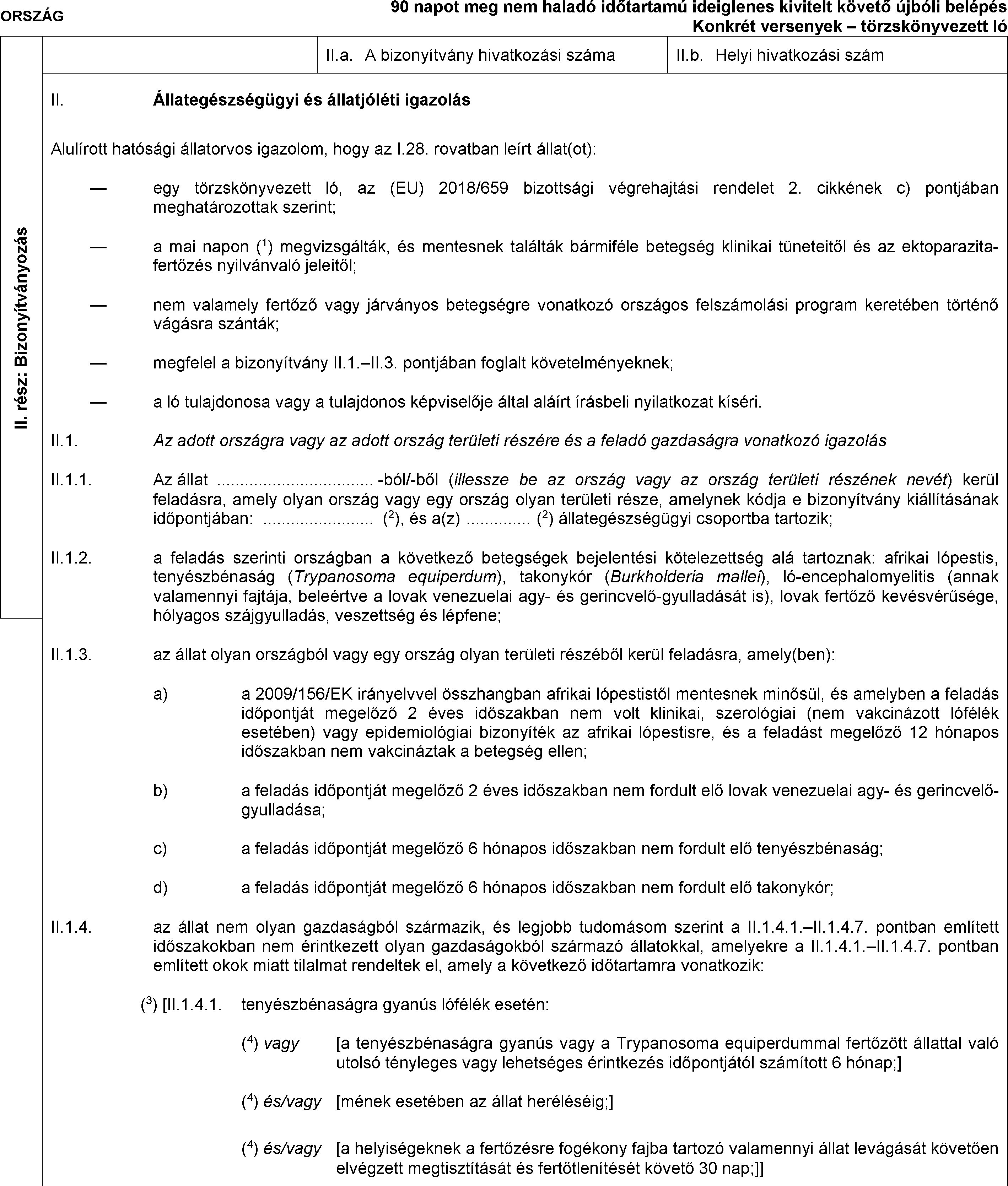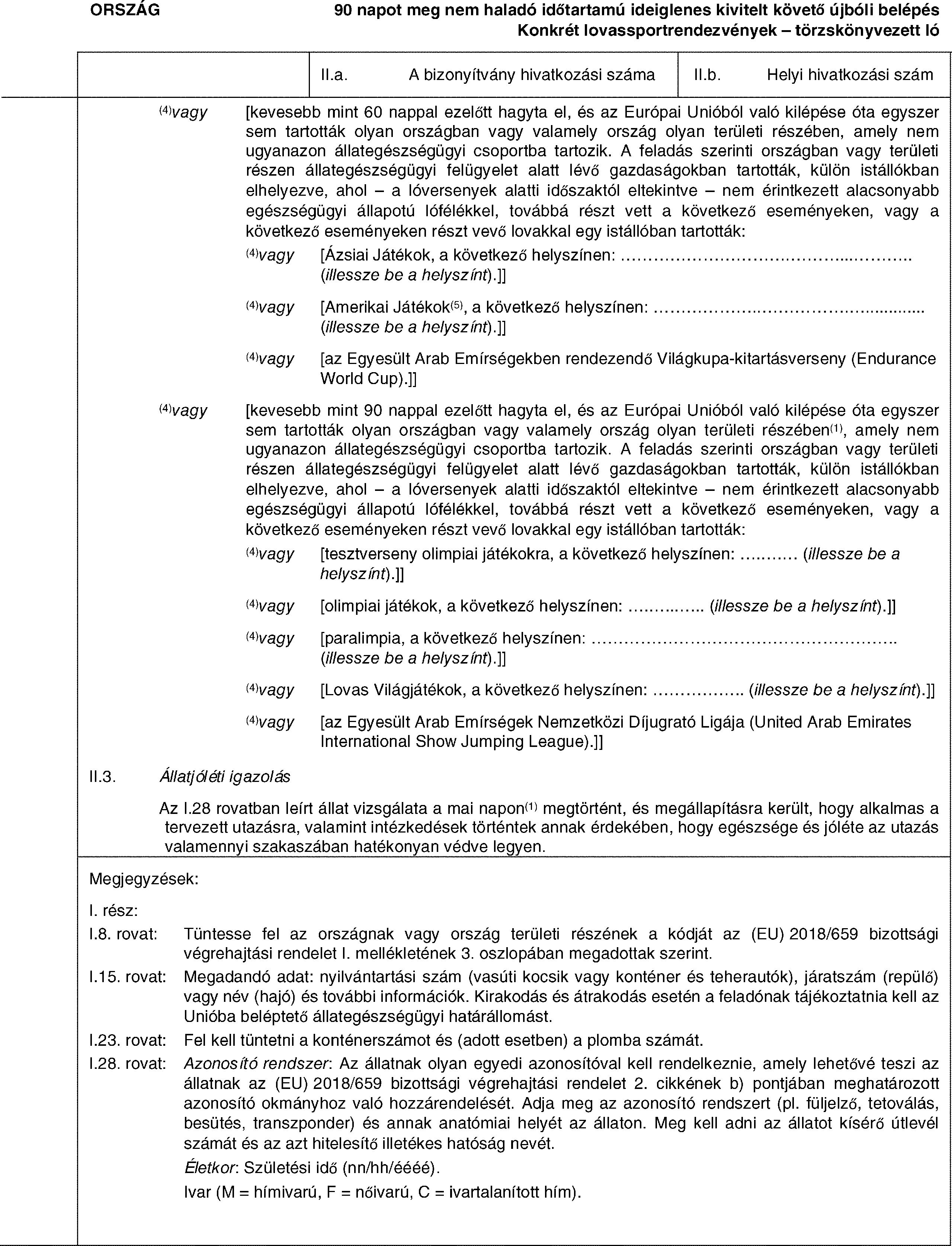 Állategészségügyi bizonyítványminta és nyilatkozatminta lóversenyek, lovassportrendezvények és kulturális események céljára szánt törzskönyvezett lovak 30 napot meg nem haladó időtartamú ideiglenes kivitelét követő újbóli uniós belépéséhez