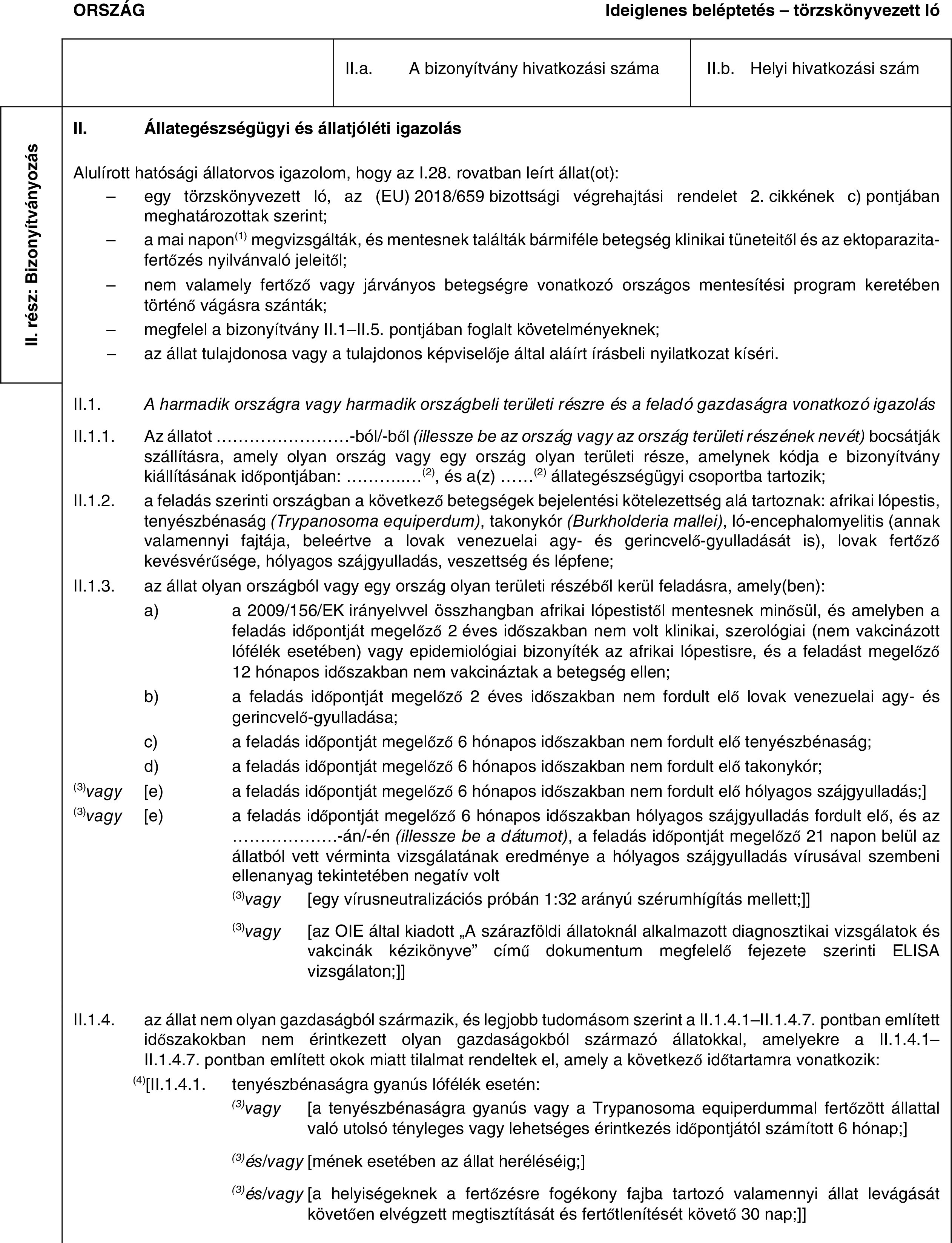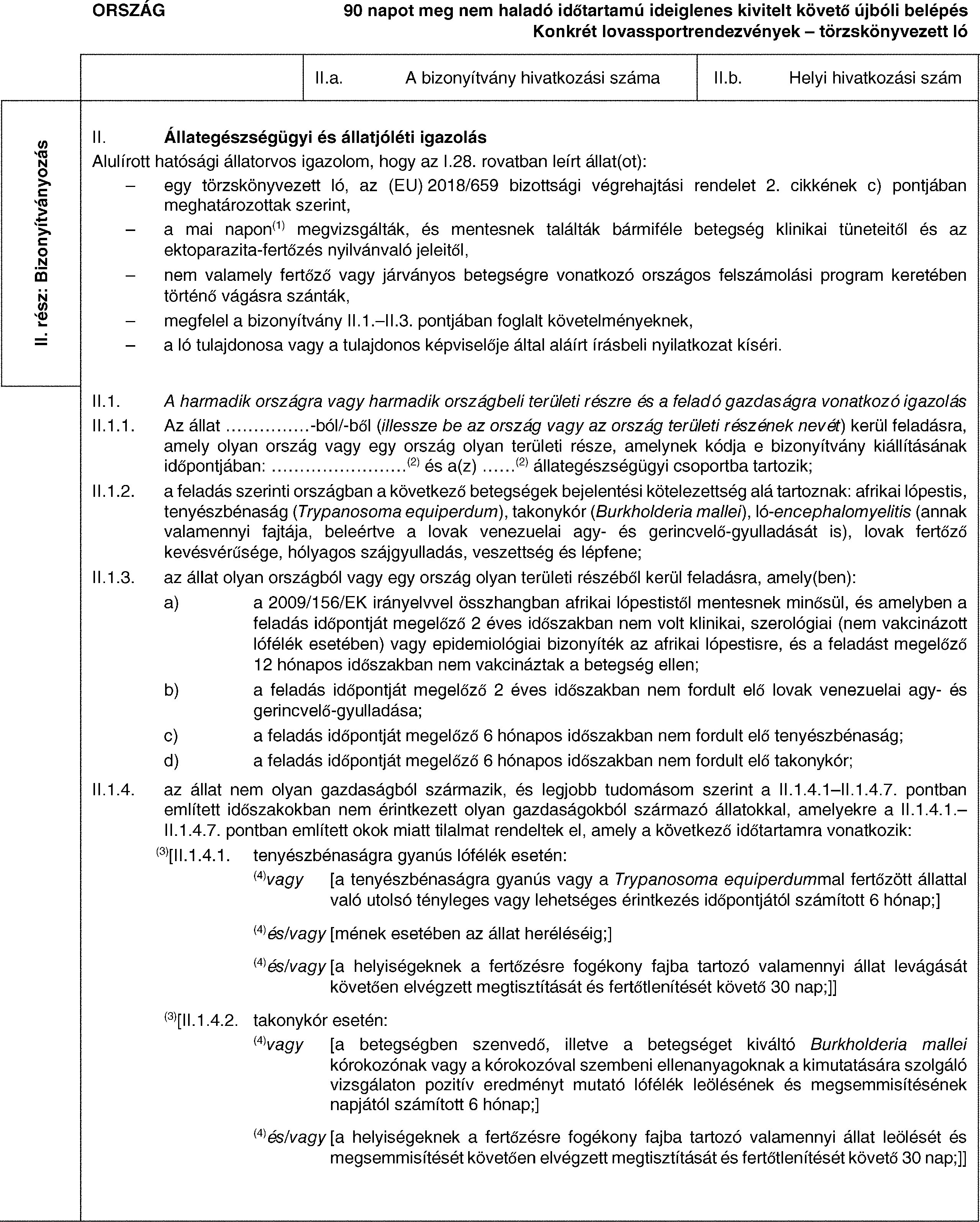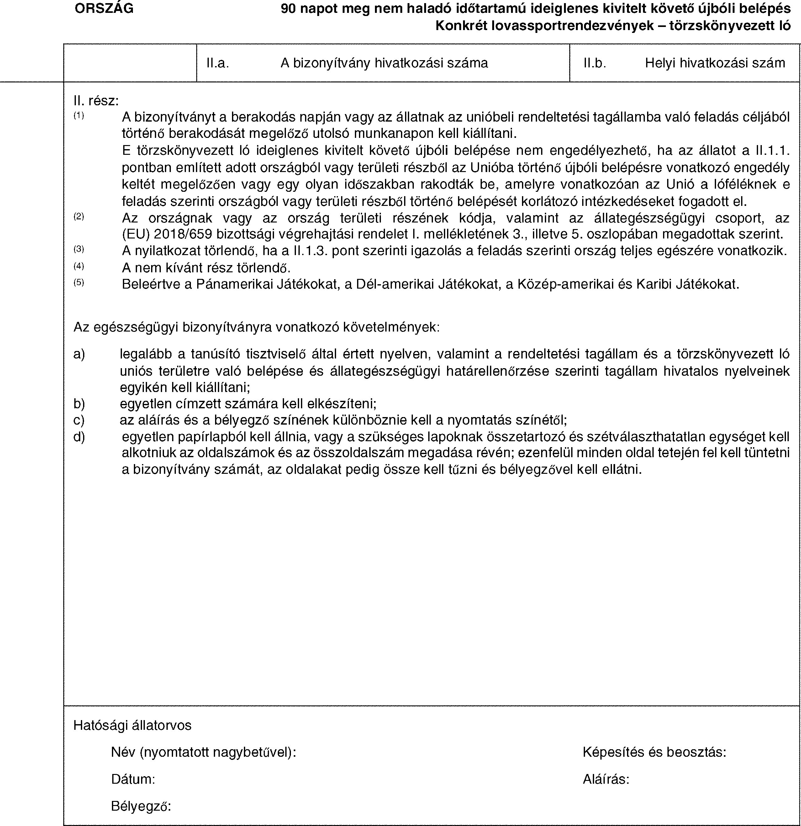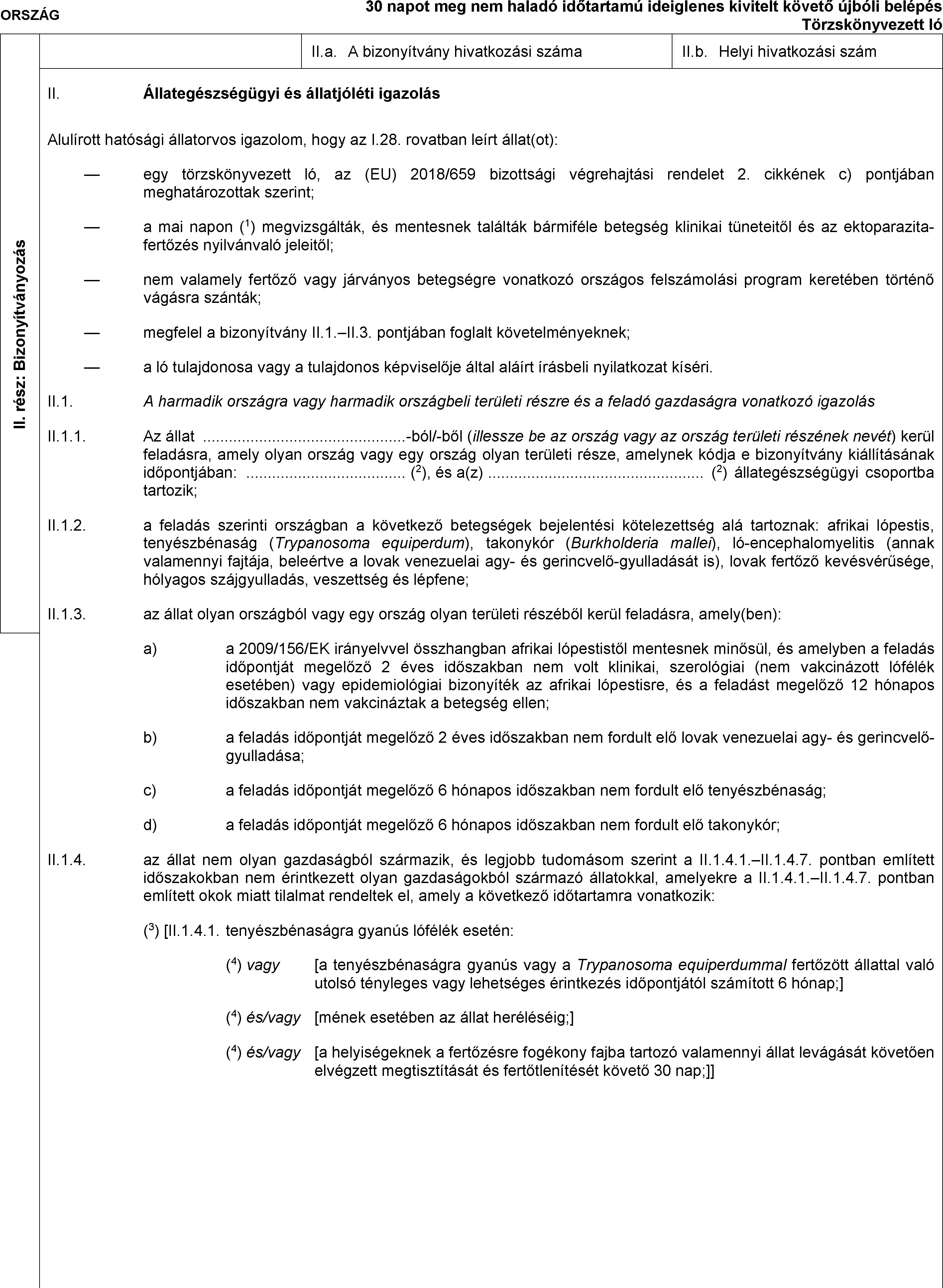 Állategészségügyi bizonyítványminta és nyilatkozatminta lóversenyek, lovassportrendezvények és kulturális események céljára szánt törzskönyvezett lovak 30 napot meg nem haladó időtartamú ideiglenes kivitelét követő újbóli uniós belépéséhez