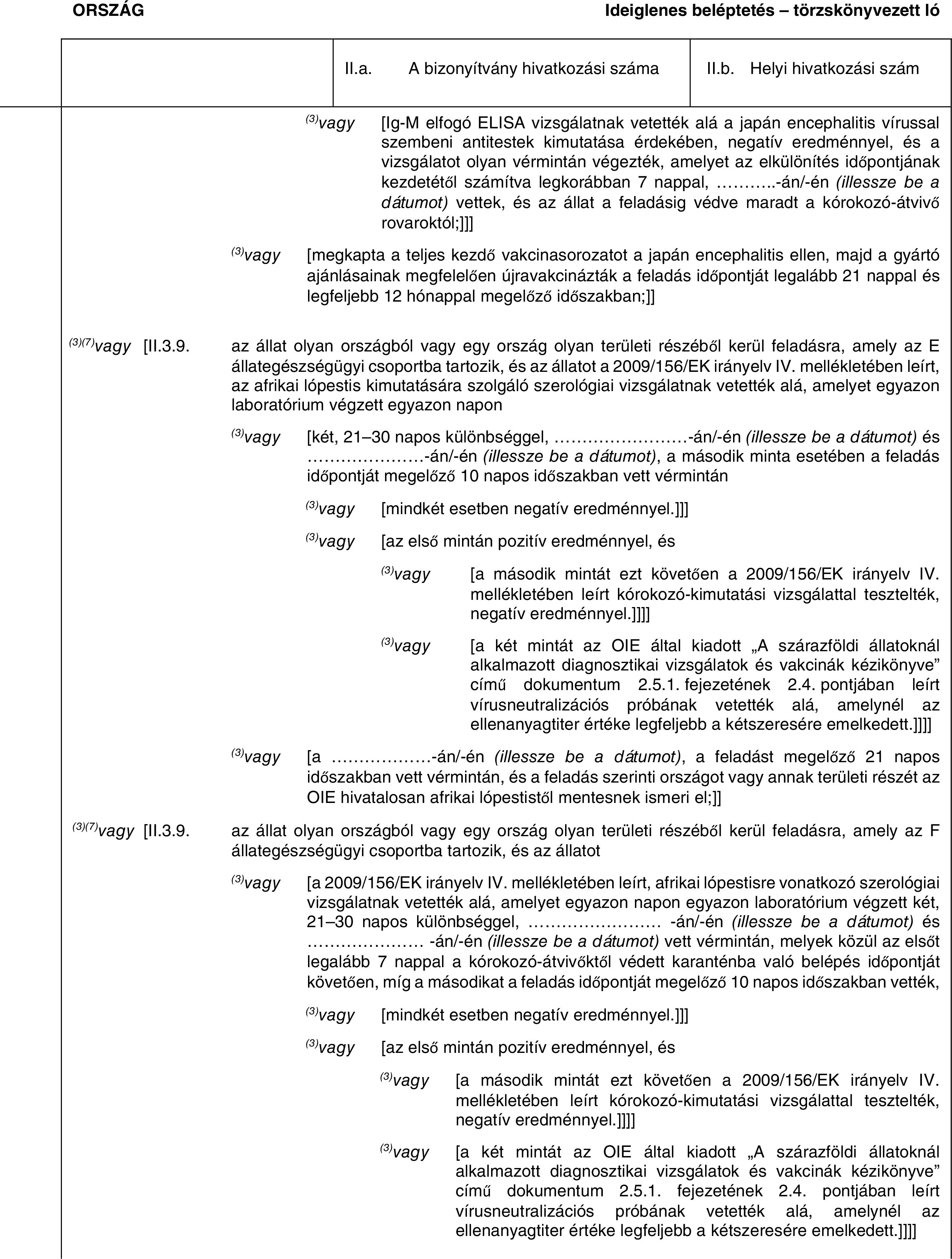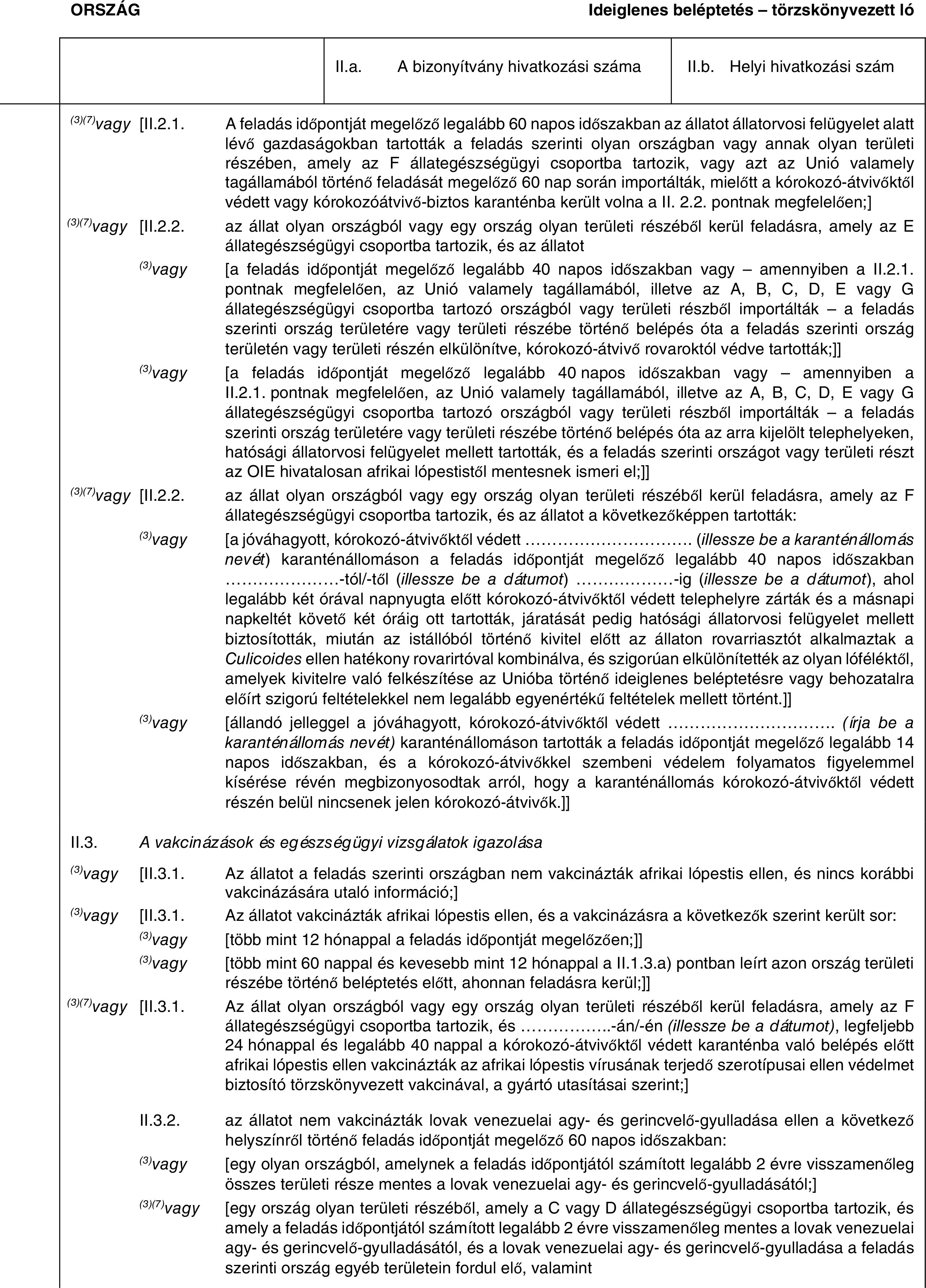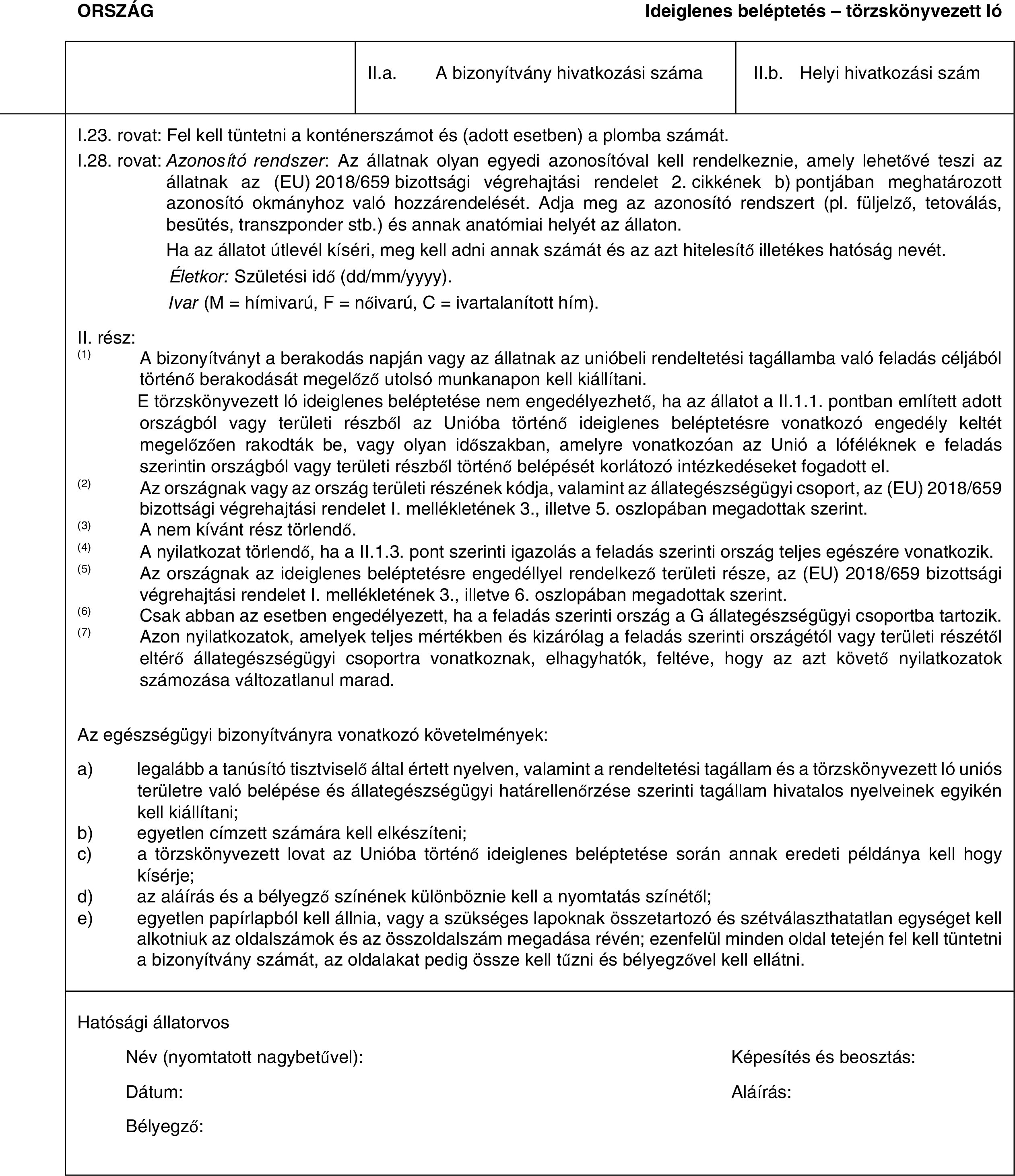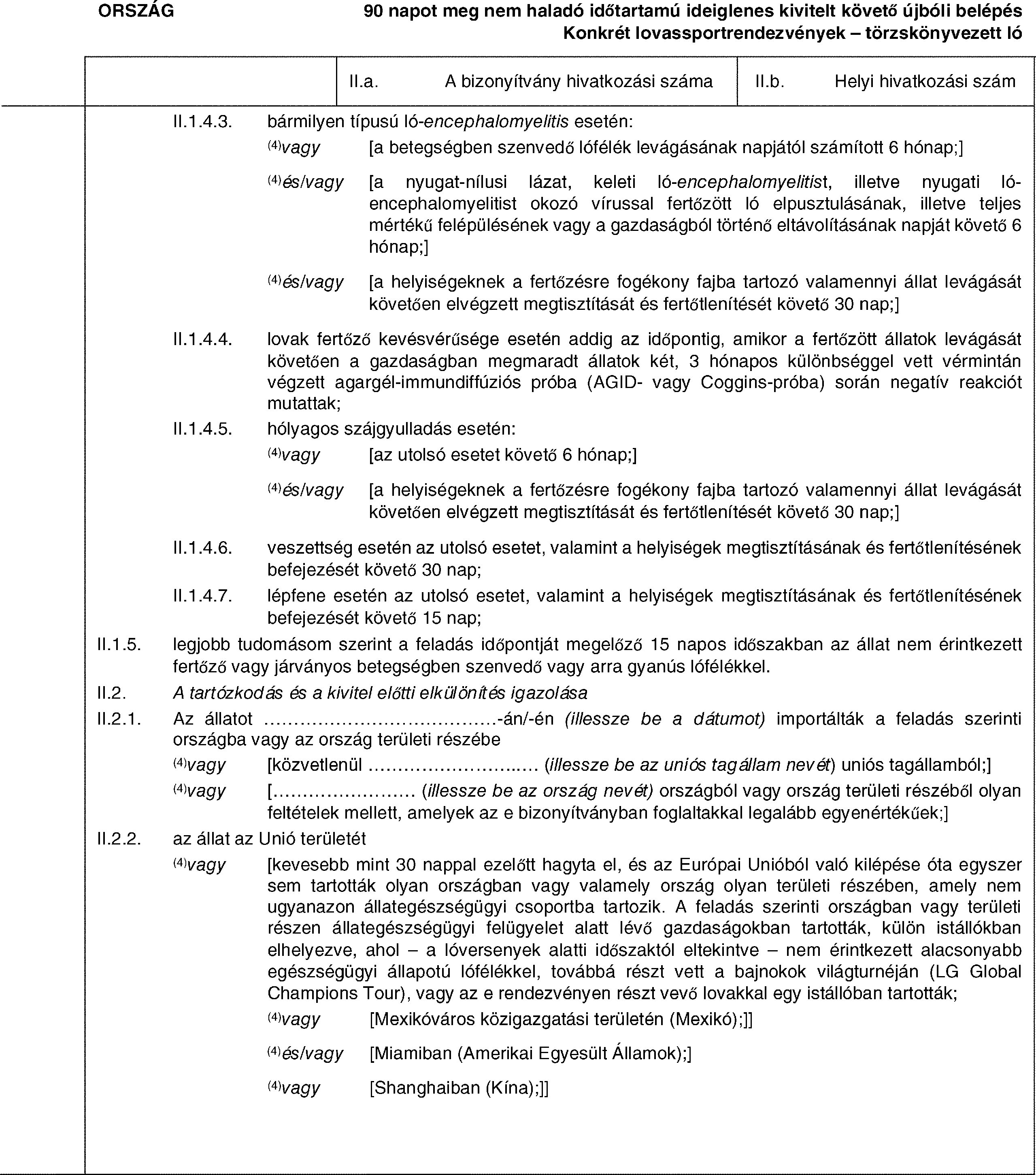 a) a törzskönyvezett lovaknak az I. mellékletben szereplő táblázat 6. oszlopában feltüntetett ideiglenes beléptetése a II. melléklet 1. részének A. szakaszában foglalt állategészségügyi bizonyítványminta szerinti egyedi állategészségügyi bizonyítvány kíséretében;