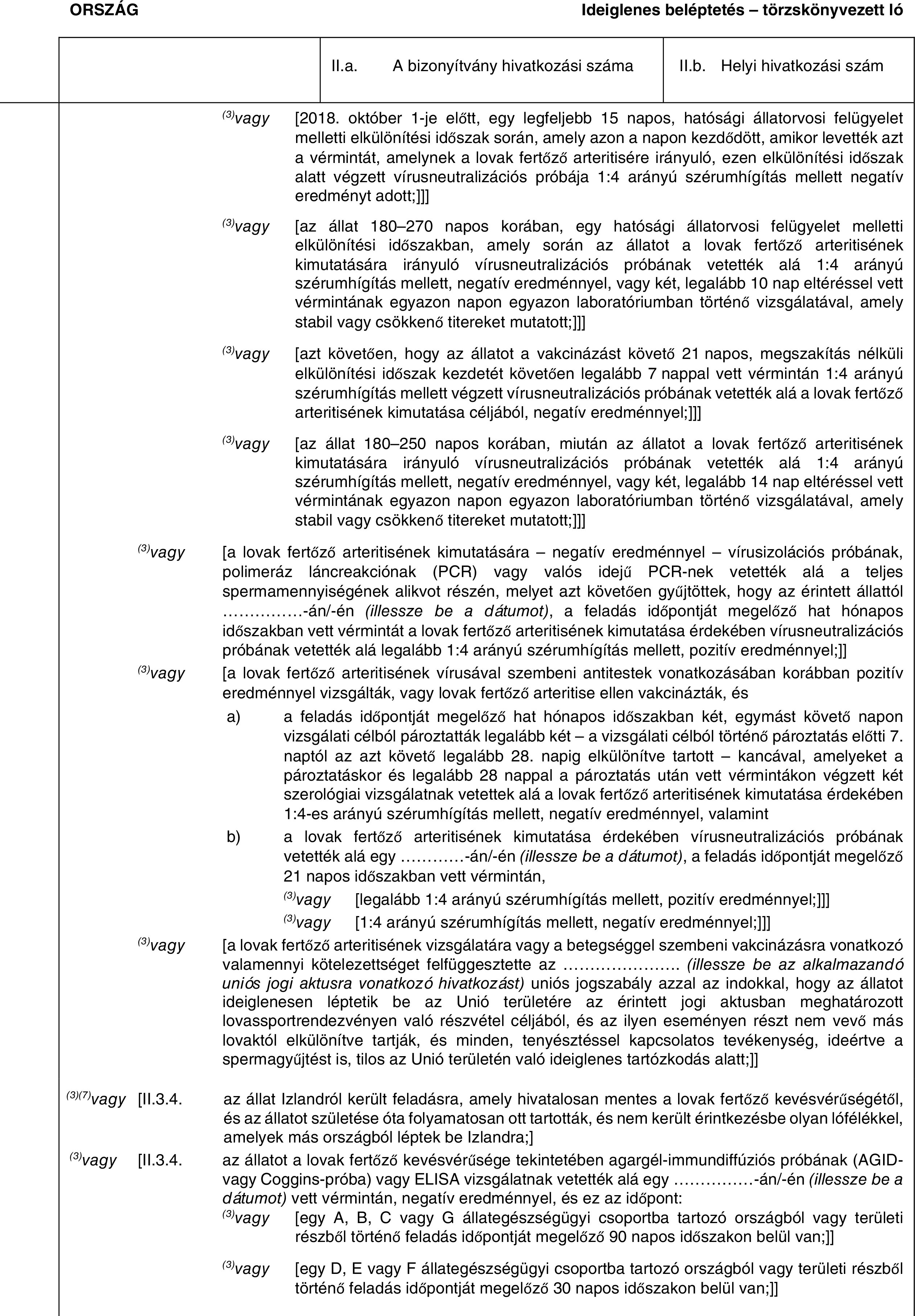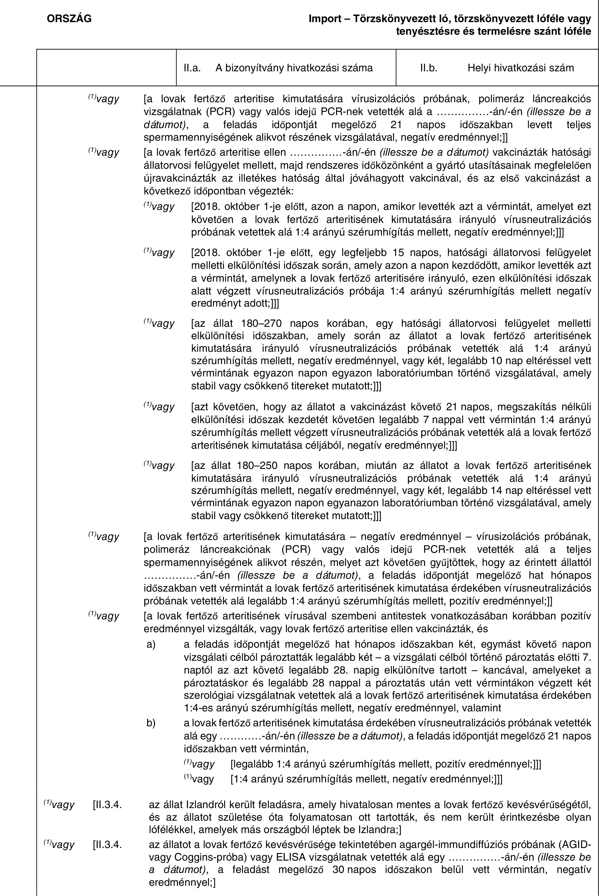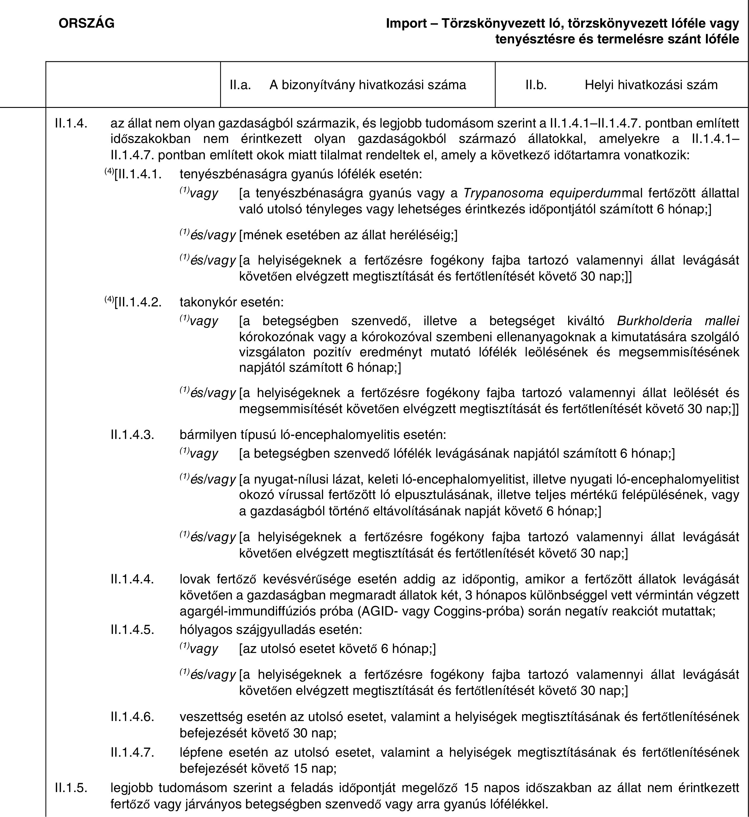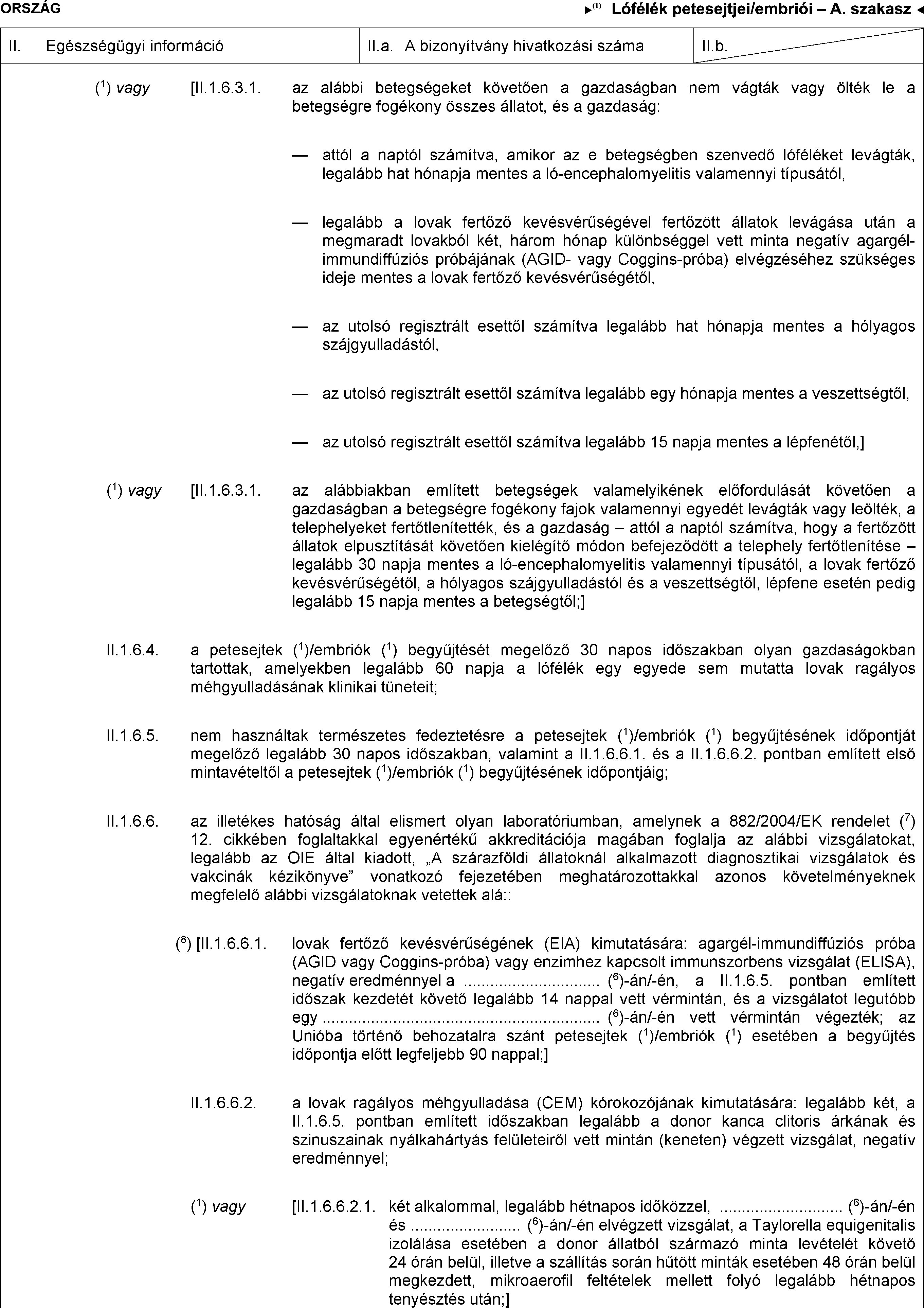 11 | Törzskönyvezett lovak spermájának behozatala | III. melléklet, 1. rész. A. szakasz III. melléklet, 1. rész., B. szakasz III. melléklet, 1. rész., C. szakasz III. melléklet, 1. rész., D. szakasz |