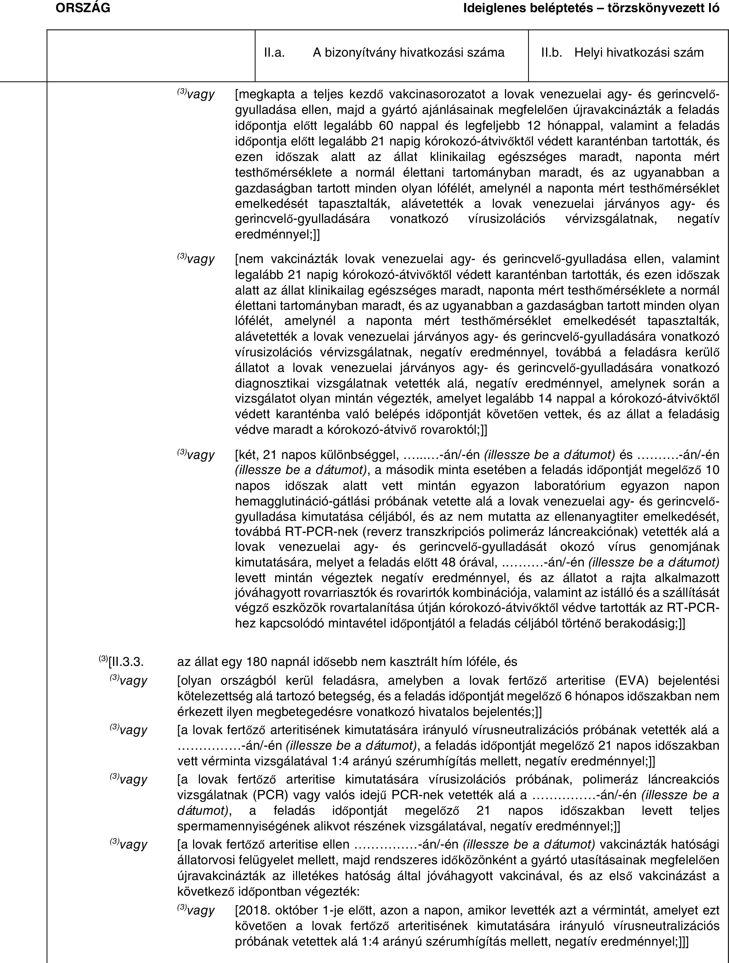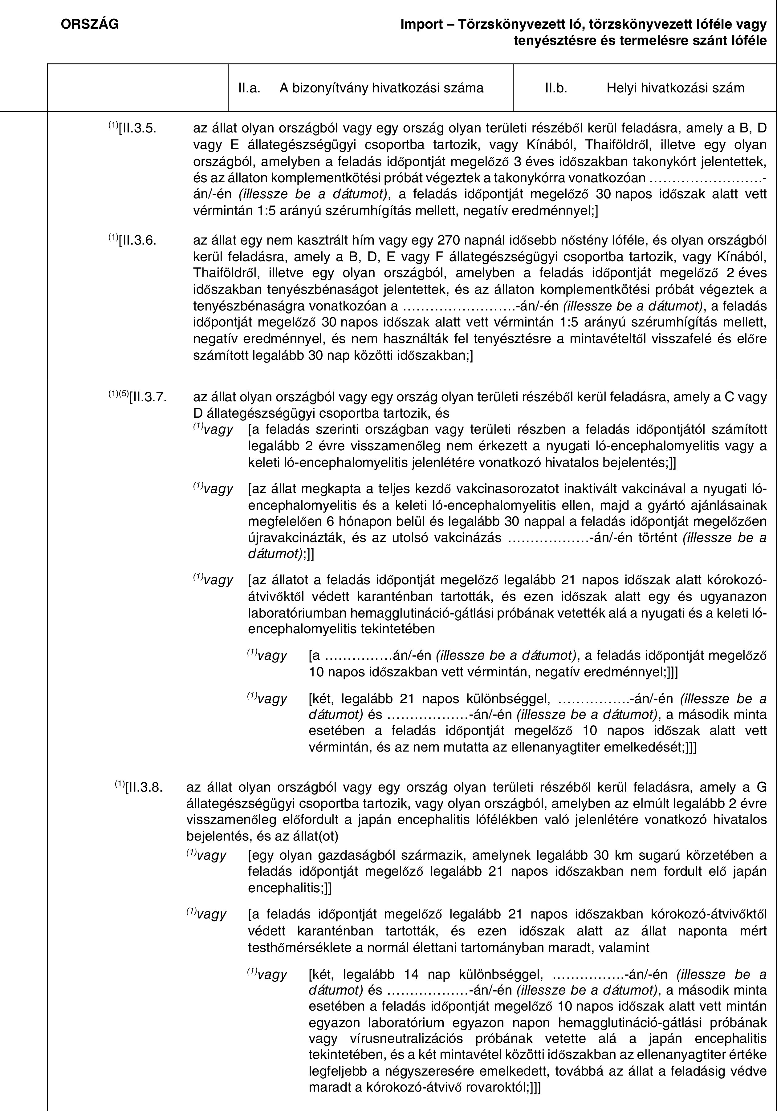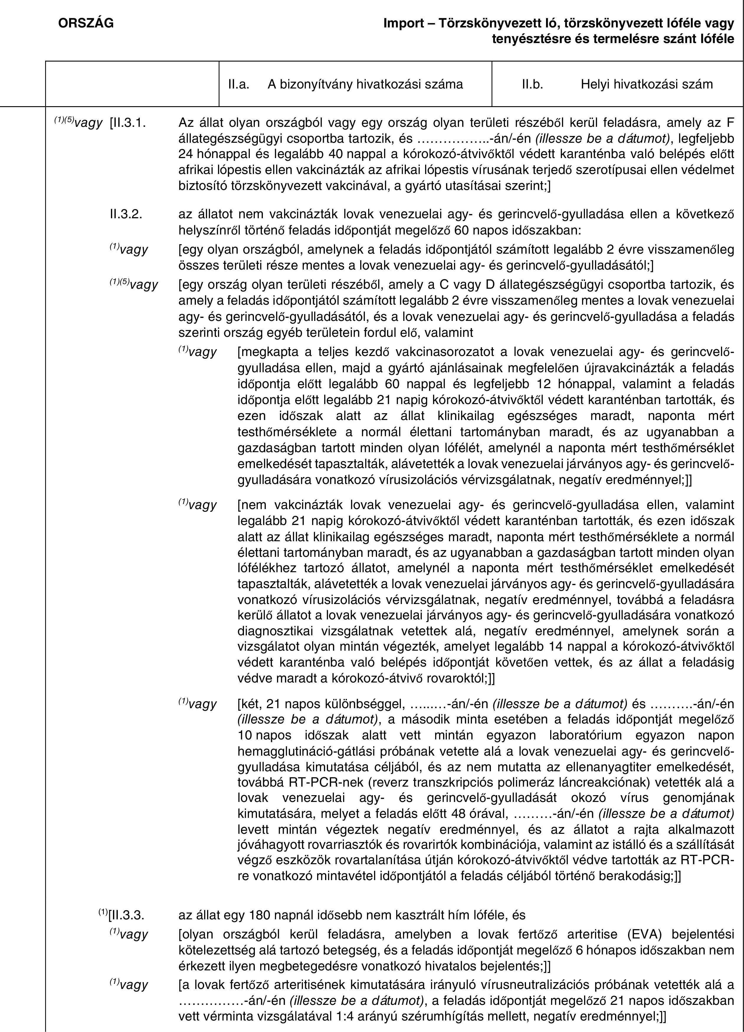 11 | Törzskönyvezett lovak spermájának behozatala | III. melléklet, 1. rész. A. szakasz III. melléklet, 1. rész., B. szakasz III. melléklet, 1. rész., C. szakasz III. melléklet, 1. rész., D. szakasz |