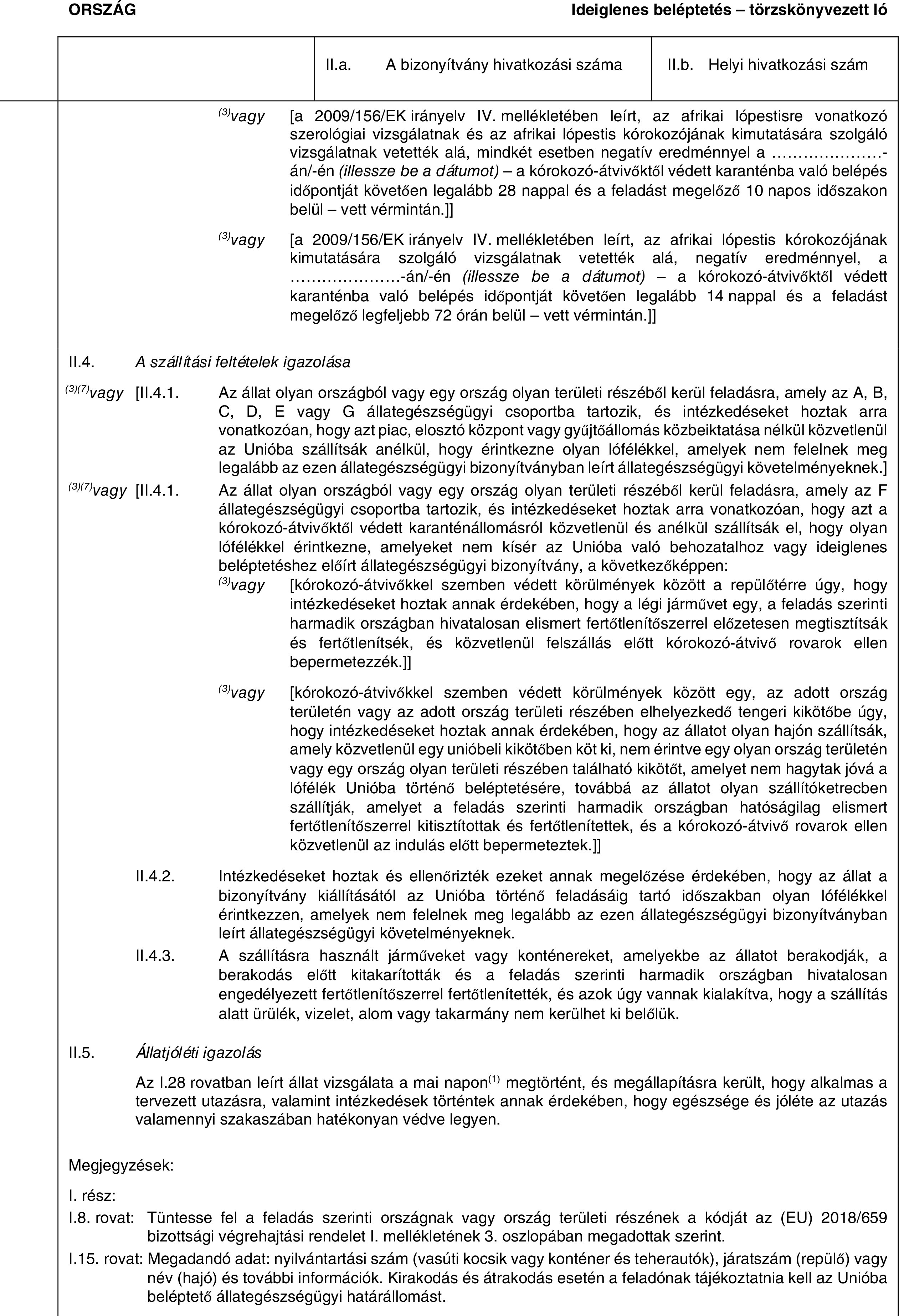 7 | Törzskönyvezett lovak lóverseny, lovassportrendezvények és kulturális események céljából történt ideiglenes kivitelt követő újbóli belépése | II. melléklet, 2. rész. A. szakasz II. melléklet, 2. rész. B. szakasz, 1. fejezet II. melléklet, 2. rész. B. szakasz, 2. fejezet |