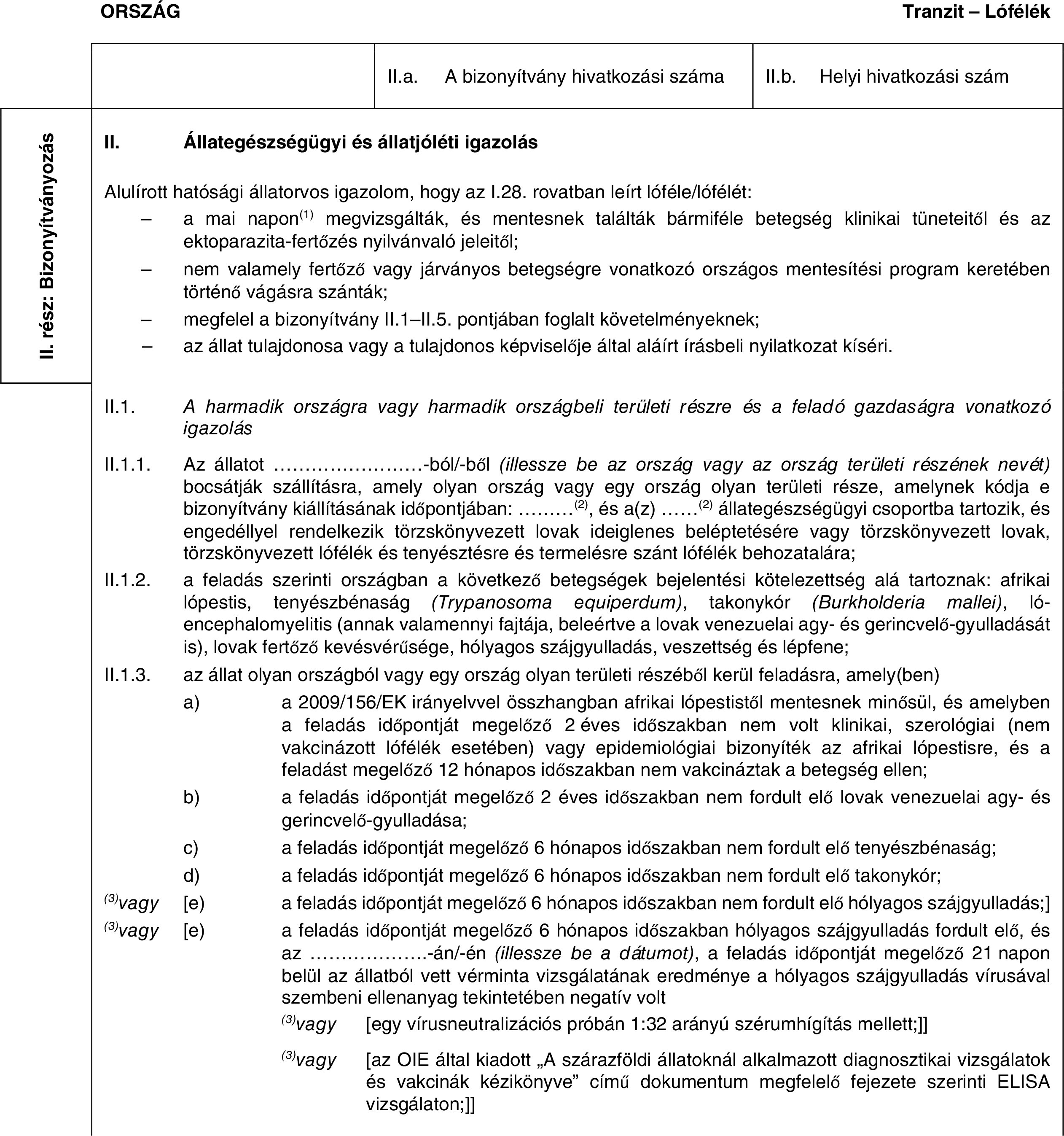 b) a törzskönyvezett lovaknak az I. mellékletben szereplő táblázat 15. oszlopában feltüntetett tranzitja a II. melléklet 1. részének B. szakaszában foglalt állategészségügyi bizonyítványminta szerinti egyedi állategészségügyi bizonyítvány kíséretében;