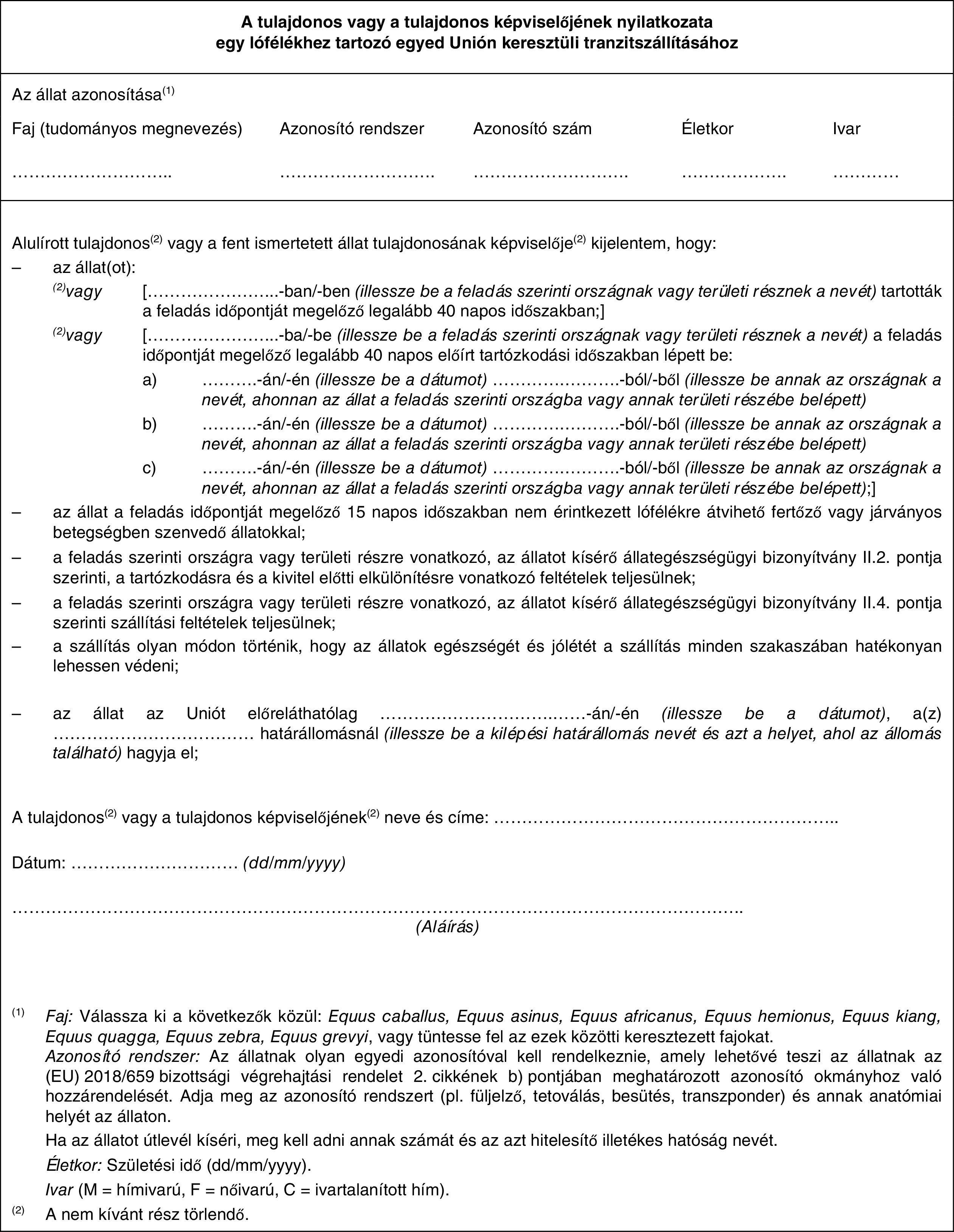 Állategészségügyi bizonyítványminta és nyilatkozatminta élő lófélék egyik harmadik országból vagy harmadik országbeli területi részből egy másik harmadik országba vagy ugyanazon harmadik ország egy másik területi részébe az Unión keresztül történő tranzitszállításához