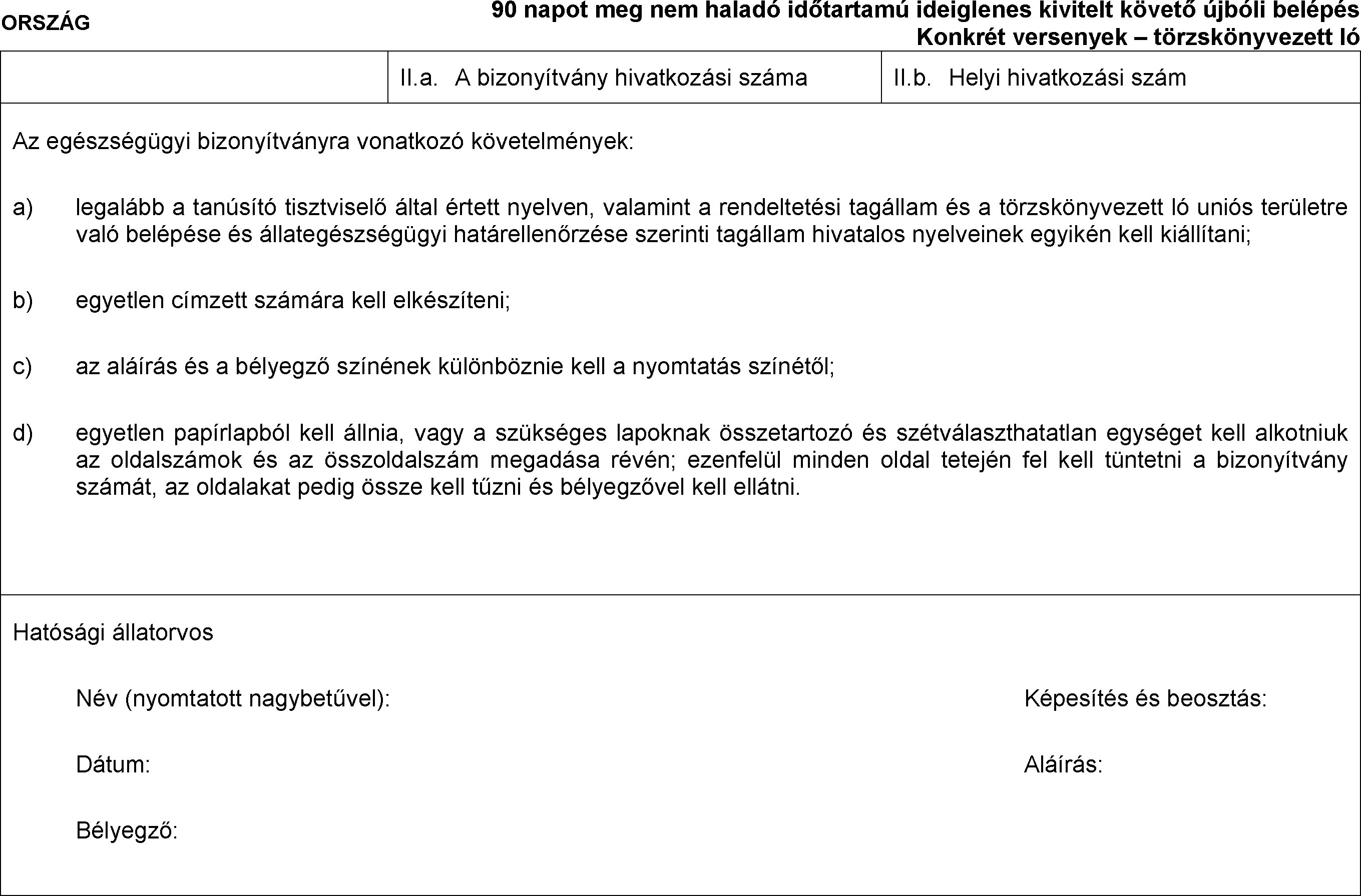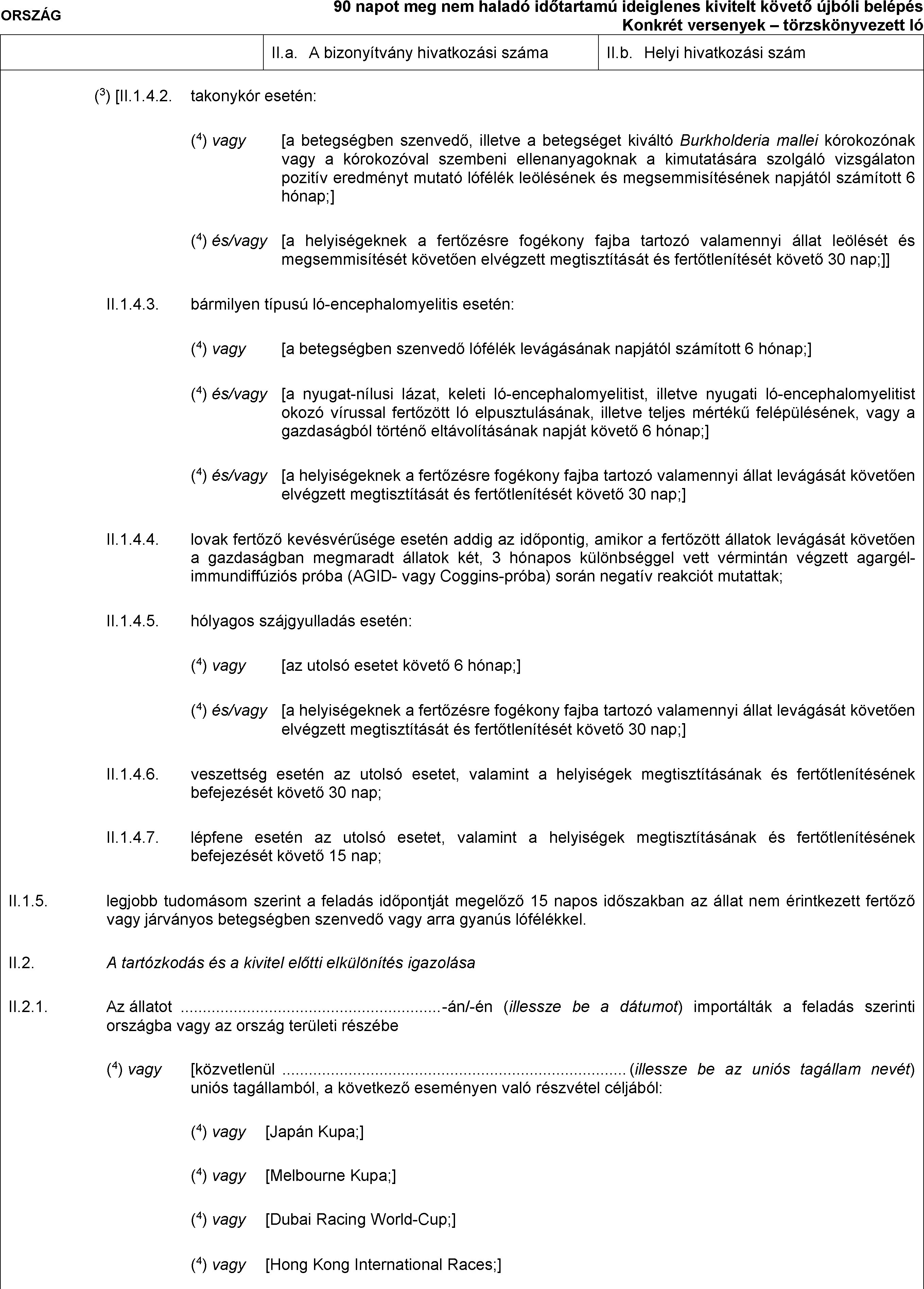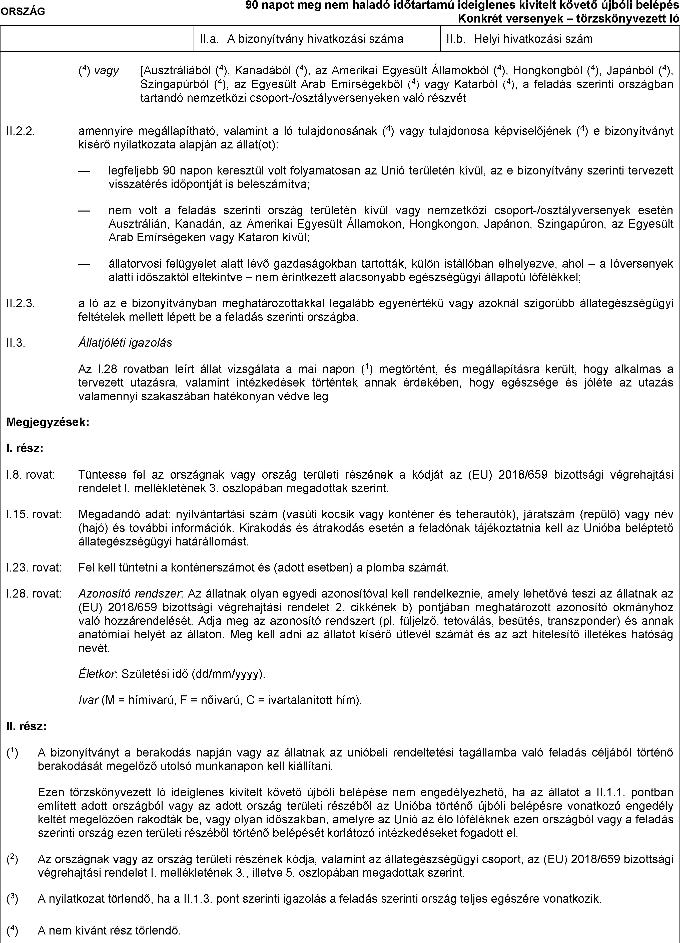 Állategészségügyi bizonyítványminta és nyilatkozatminta az Ausztráliában, Kanadában, az Amerikai Egyesült Államokban, Hongkongban, Japánban, Szingapúrban, Egyesült Arab Emírségekben vagy Katarban konkrét lóversenyeseményeken részt vett, lóverseny céljára szánt törzskönyvezett lovak 90 napot meg nem haladó időtartamú ideiglenes kivitelét követő újbóli uniós belépéséhez