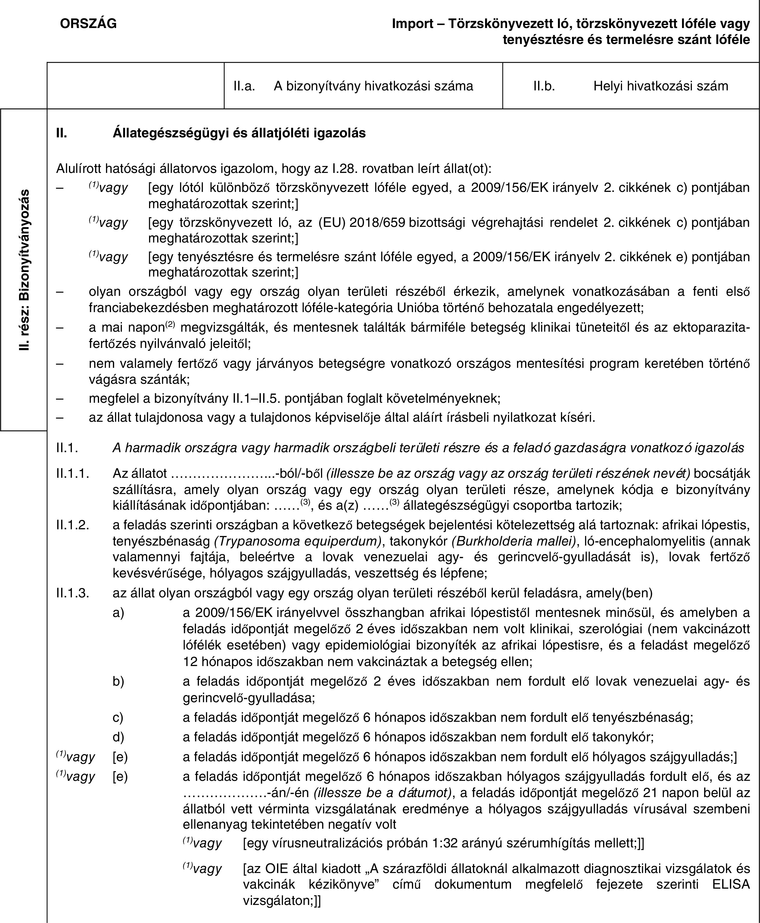 f) a törzskönyvezett lóféléknek és a tenyésztésre és termelésre szánt lóféléknek az I. mellékletben szereplő táblázat 10. oszlopában feltüntetett behozatala a II. melléklet 3. részének A. szakaszában foglalt állategészségügyi bizonyítványminta szerinti egyedi állategészségügyi bizonyítvány kíséretében.