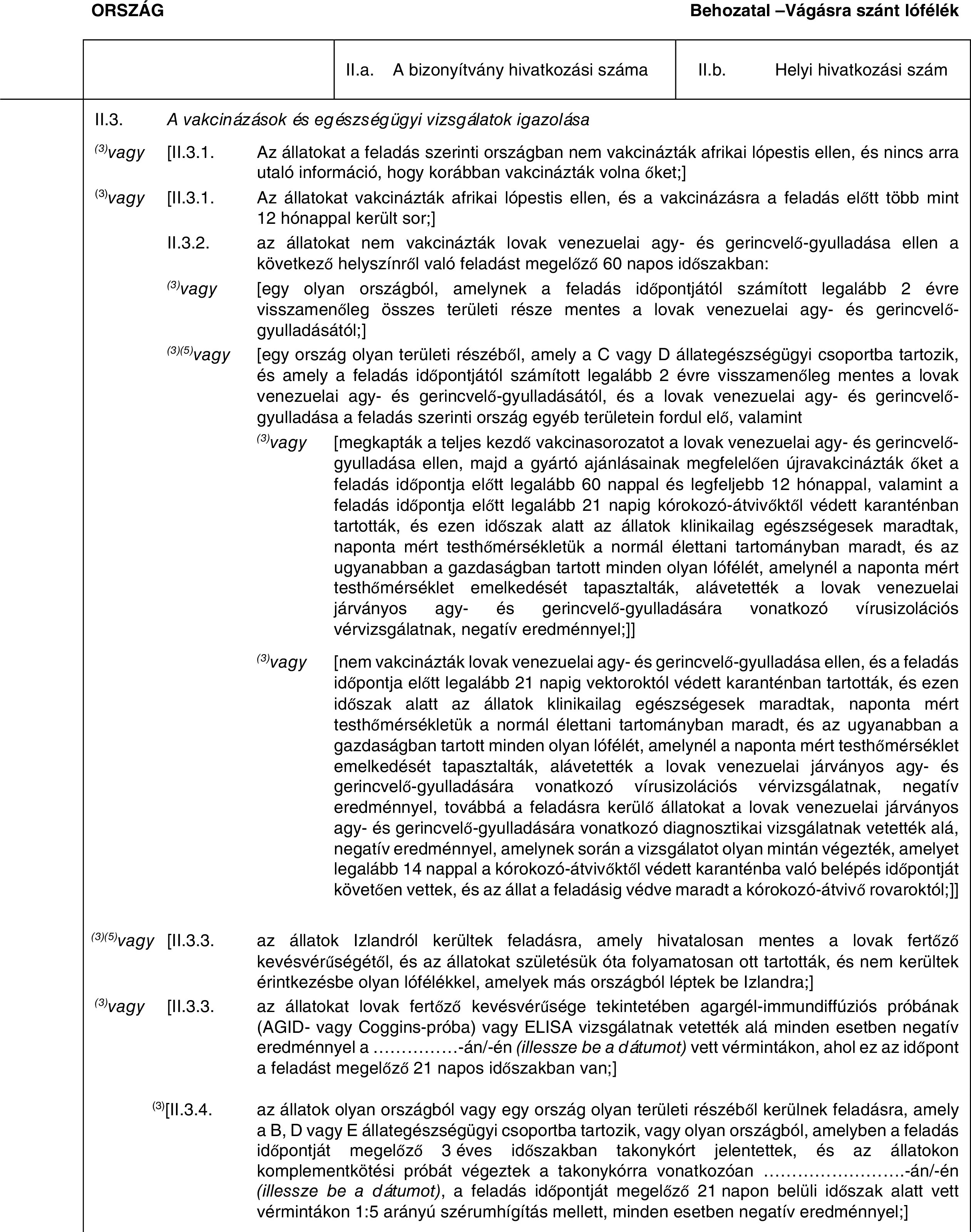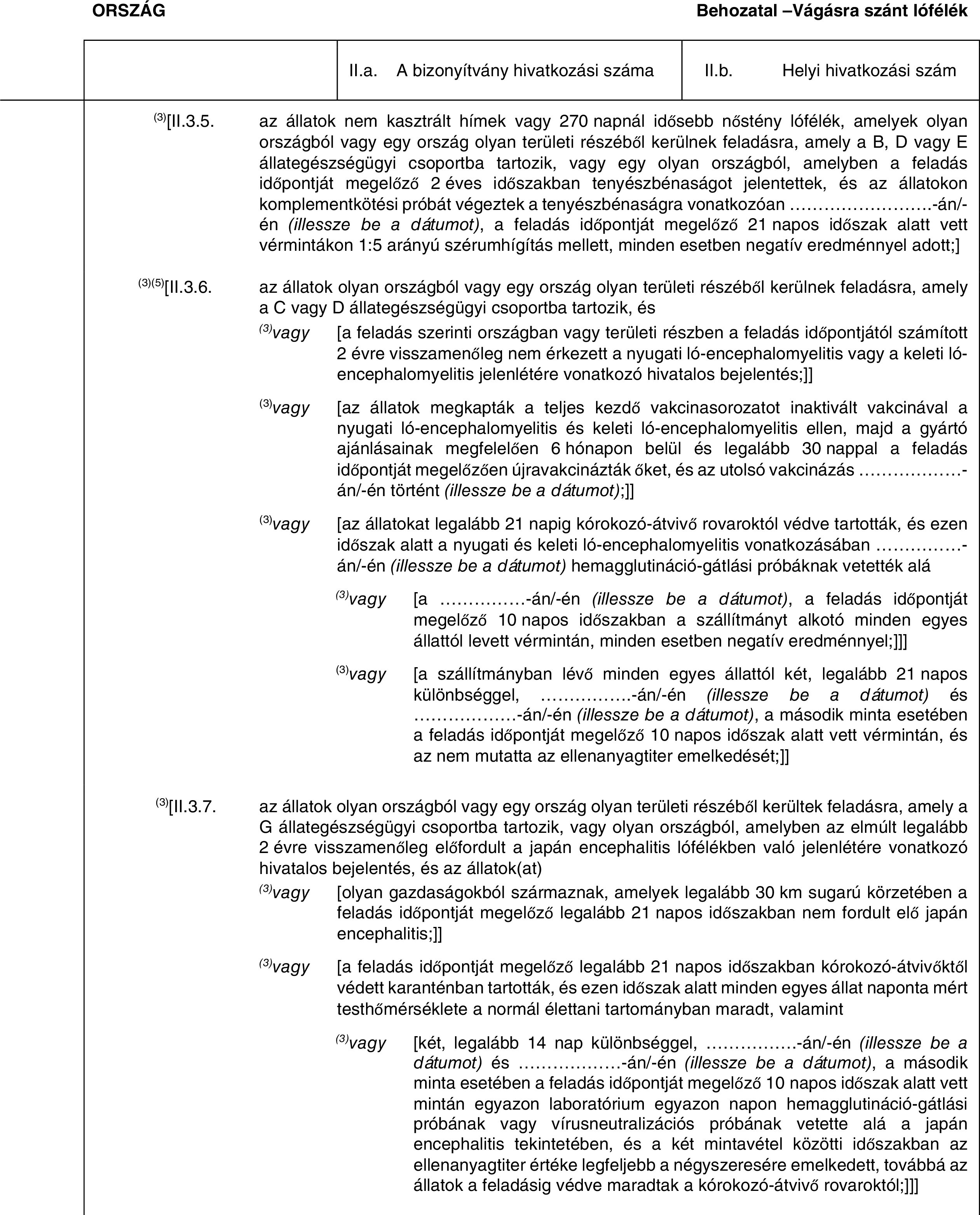 e) a vágásra szánt lófélék szállítmányainak az I. mellékletben szereplő táblázat 9. oszlopában feltüntetett behozatala a II. melléklet 3. részének B. szakaszában foglalt állategészségügyi bizonyítványminta szerinti egyedi állategészségügyi bizonyítvány kíséretében;