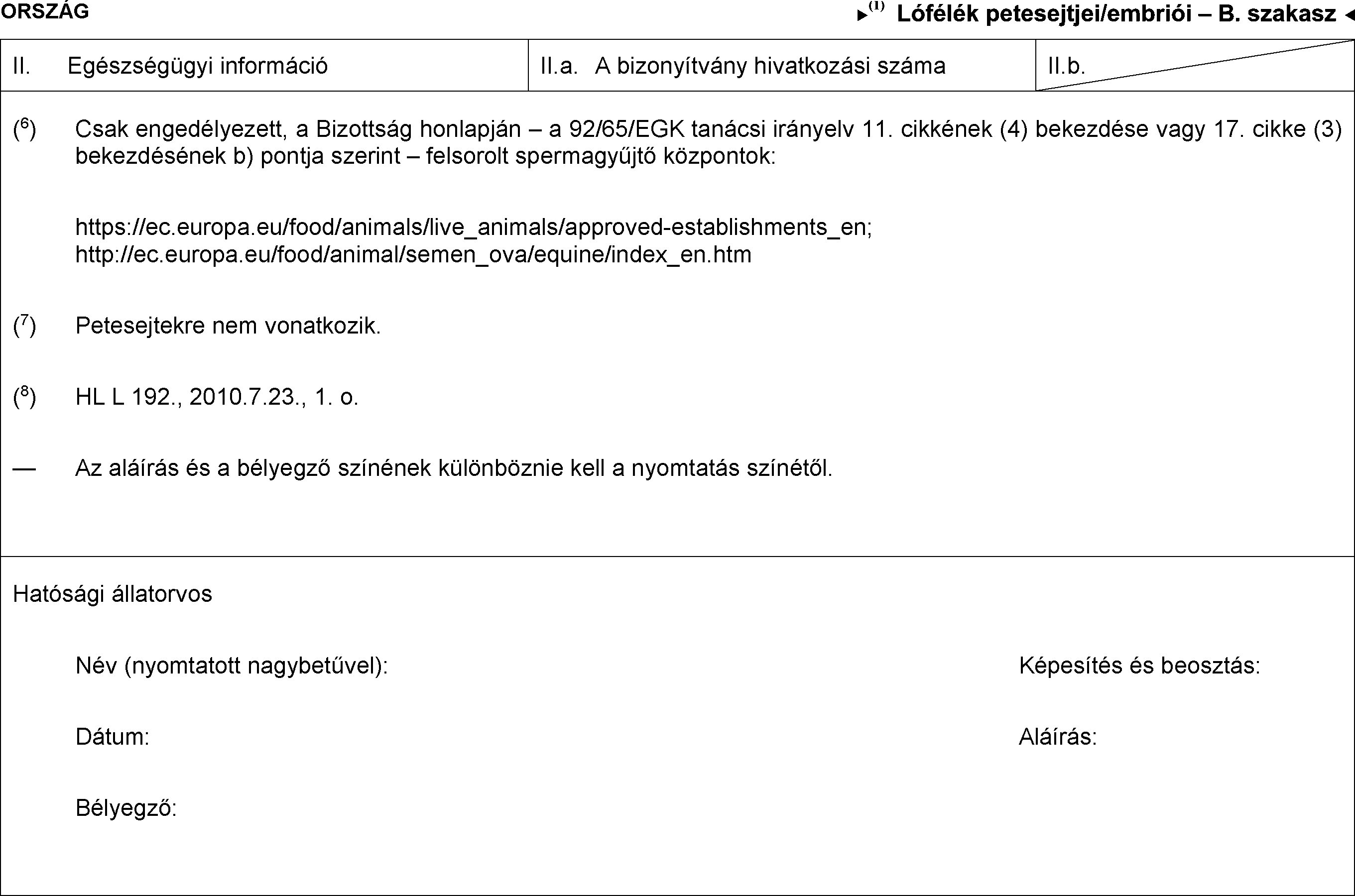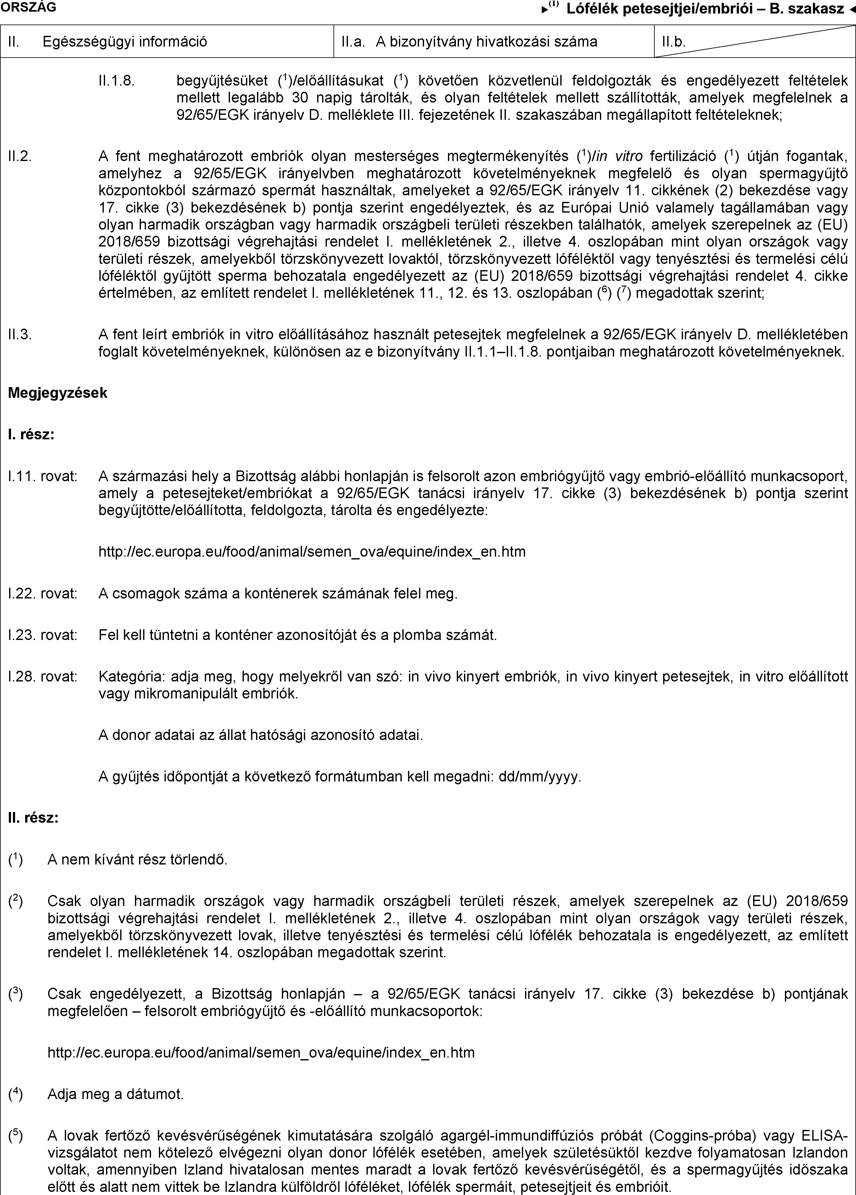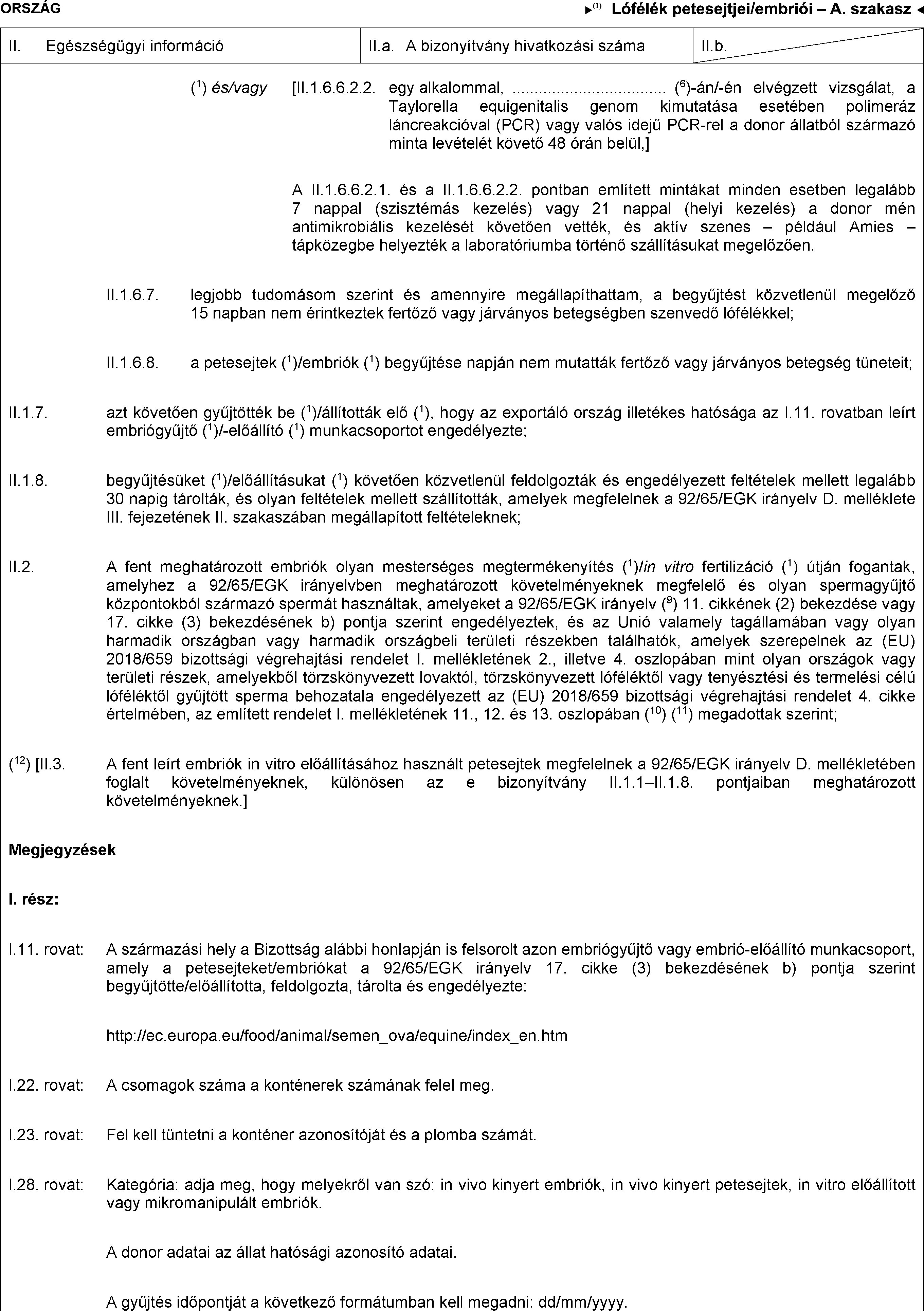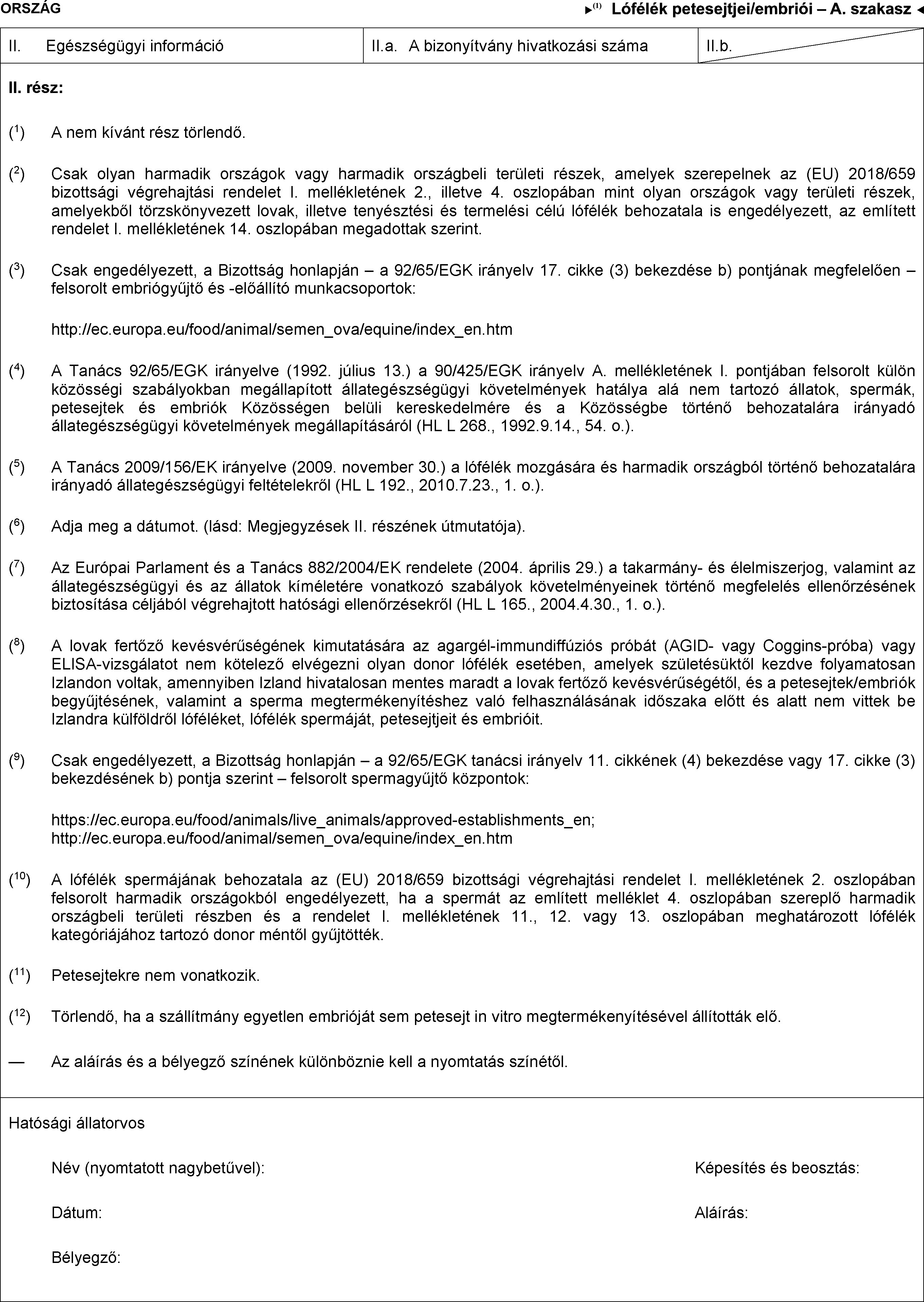 2. MINTA - Állategészségügyi bizonyítványminta a lófélék 2010. augusztus 31. után és 2014. október 1. előtt a 92/65/EGK irányelvnek megfelelően gyűjtött, feldolgozott és tárolt és a petesejtek, illetve embriók származási helye szerinti, engedélyezett embriógyűjtő vagy -előállító munkacsoport által 2010. augusztus 31. után feladott petesejt- és embriókészletei szállítmányainak behozatalához