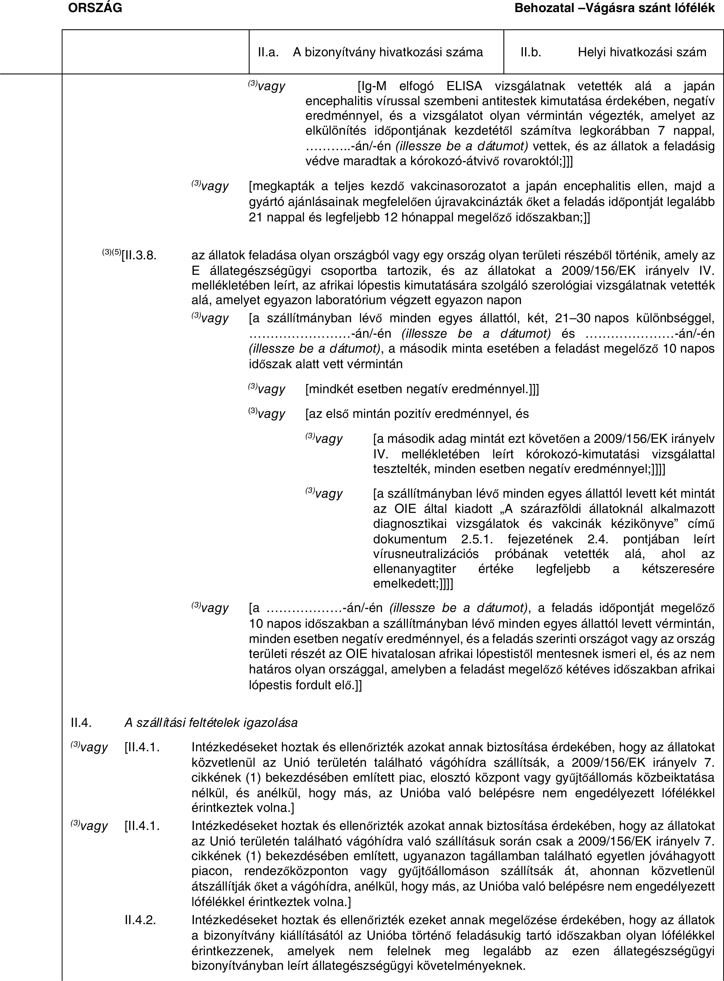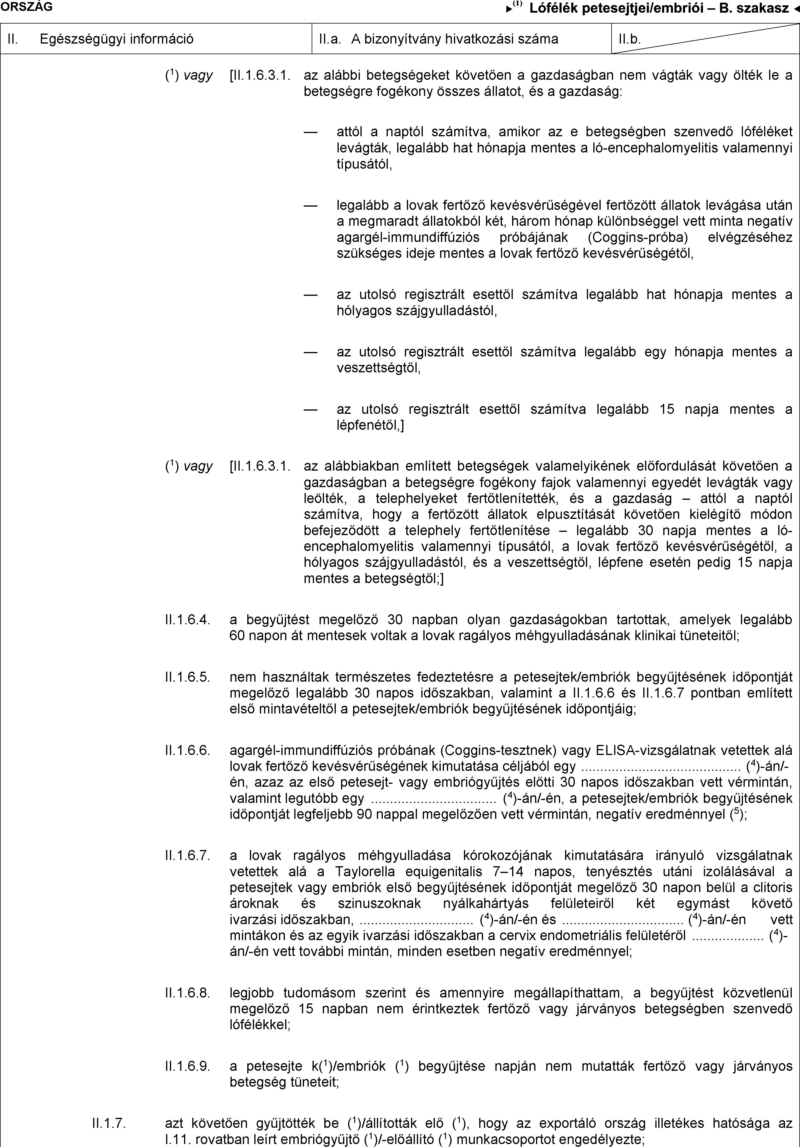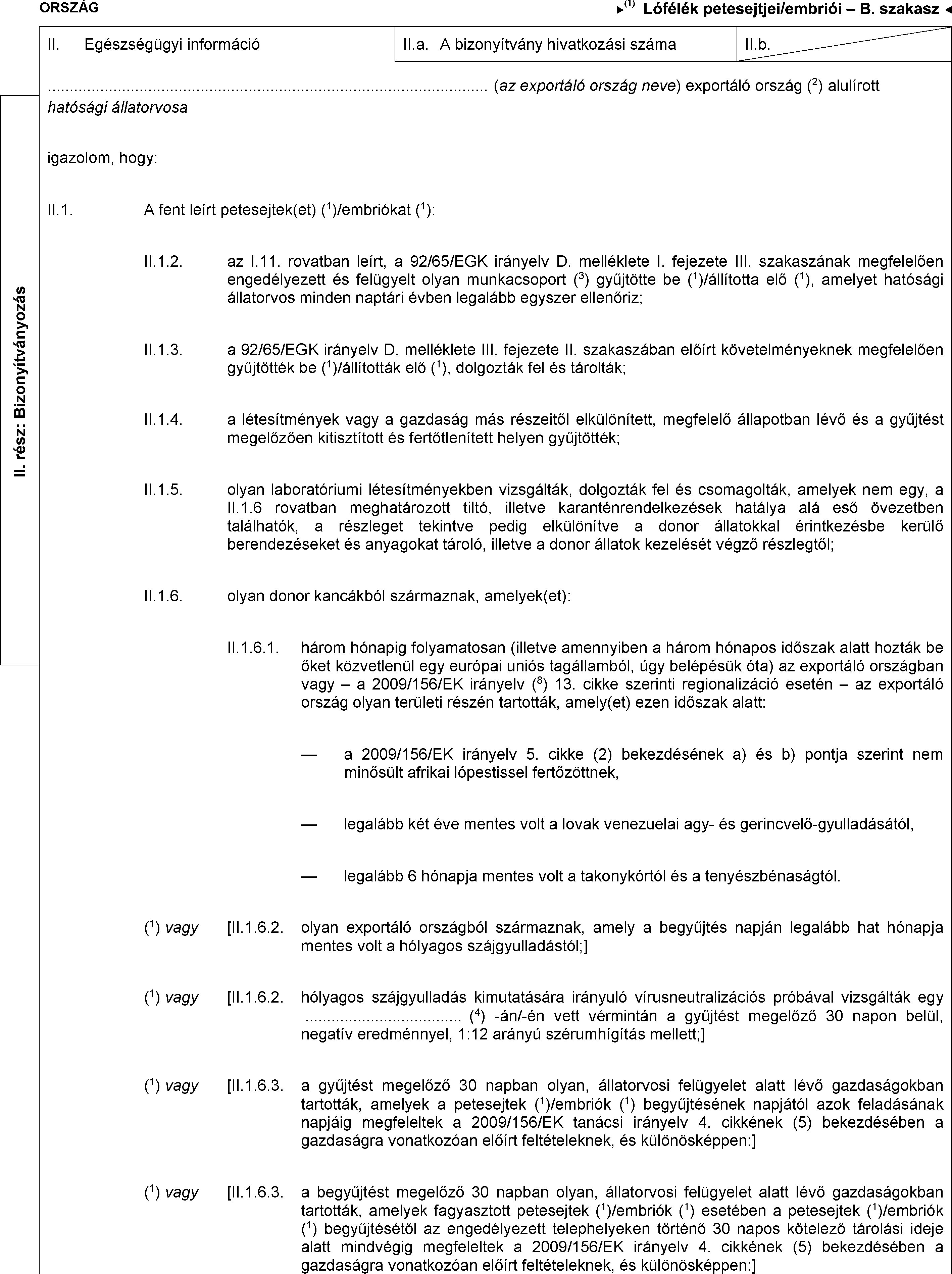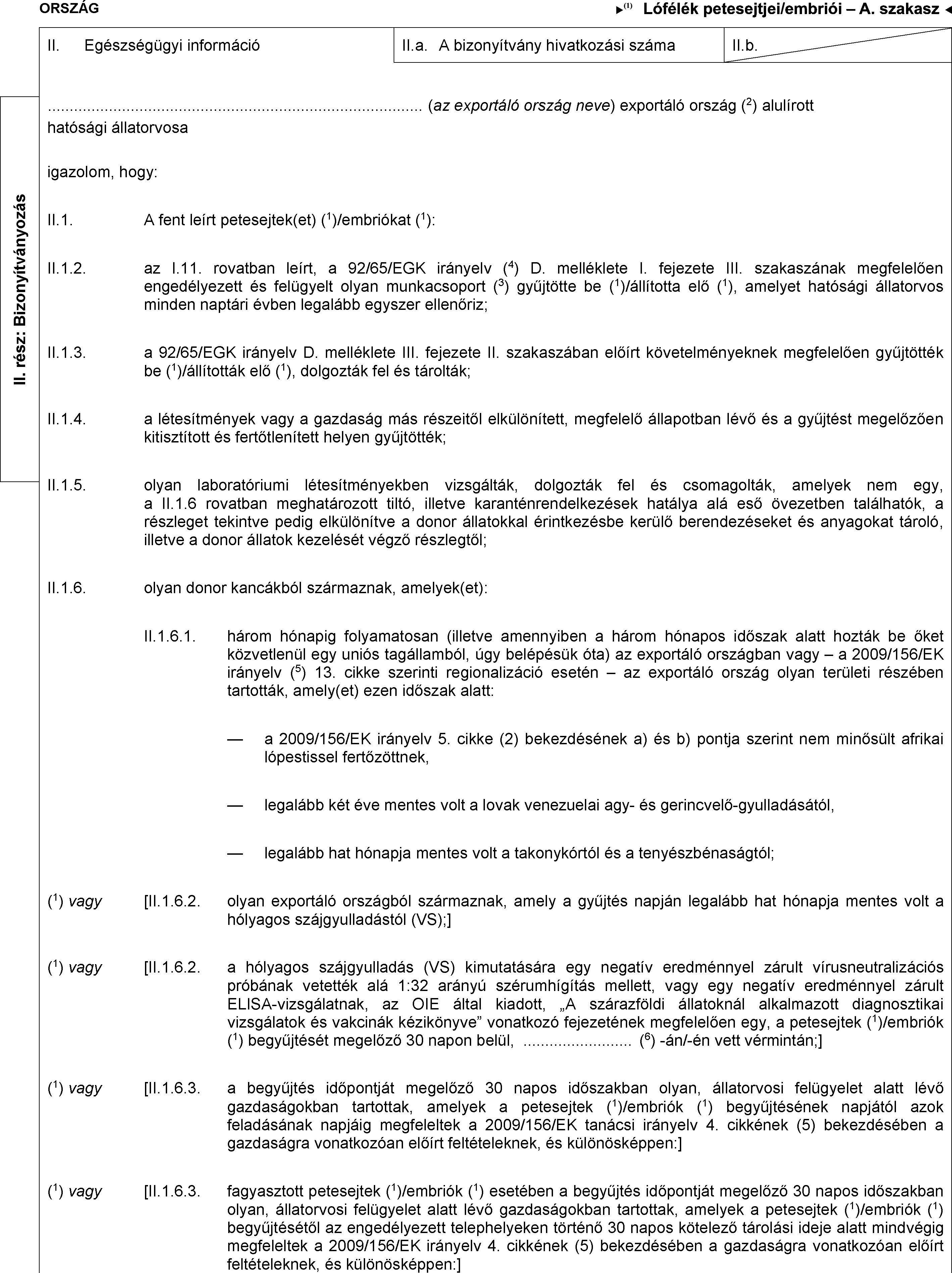 2. MINTA - Állategészségügyi bizonyítványminta a lófélék 2010. augusztus 31. után és 2014. október 1. előtt a 92/65/EGK irányelvnek megfelelően gyűjtött, feldolgozott és tárolt és a petesejtek, illetve embriók származási helye szerinti, engedélyezett embriógyűjtő vagy -előállító munkacsoport által 2010. augusztus 31. után feladott petesejt- és embriókészletei szállítmányainak behozatalához
