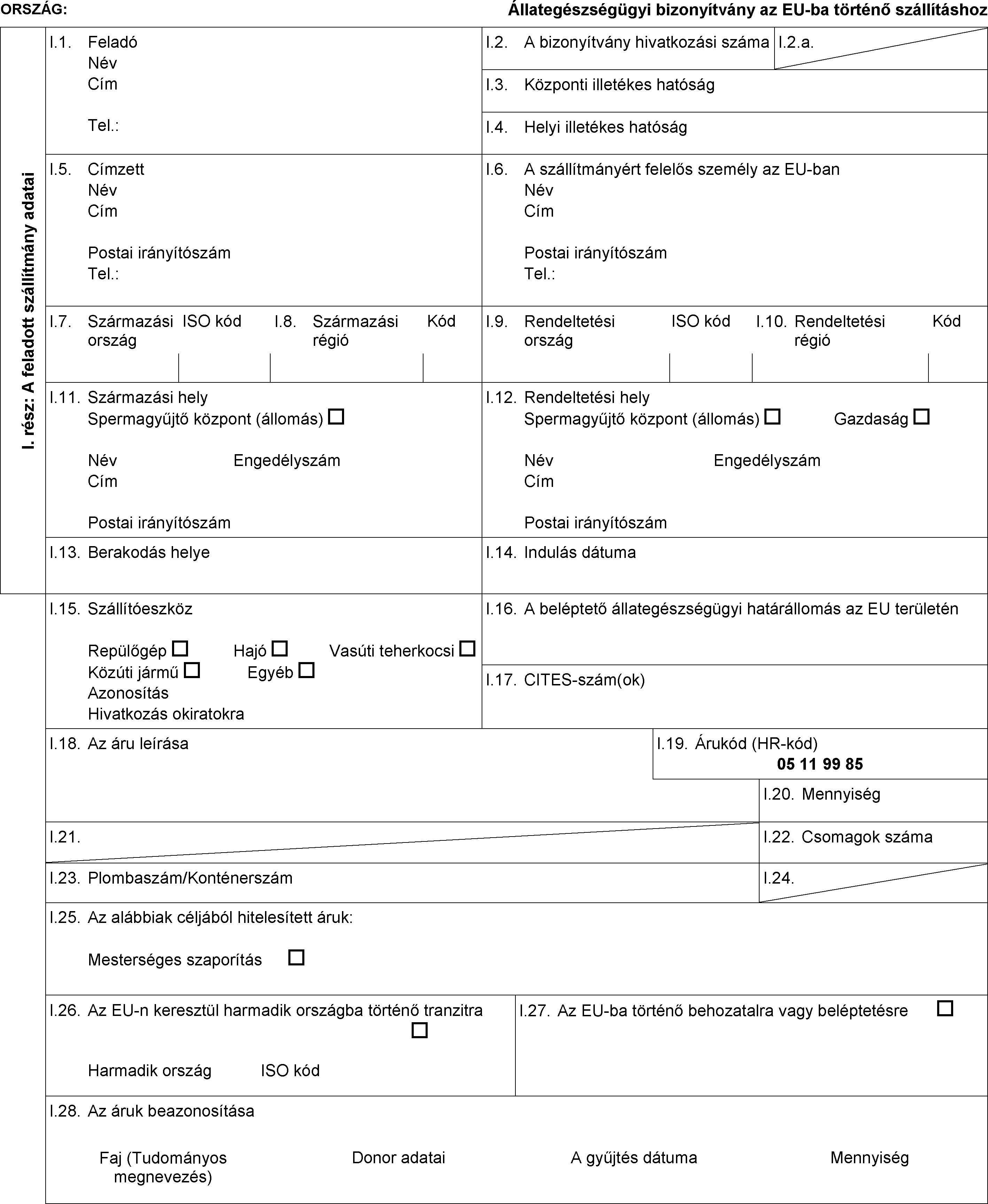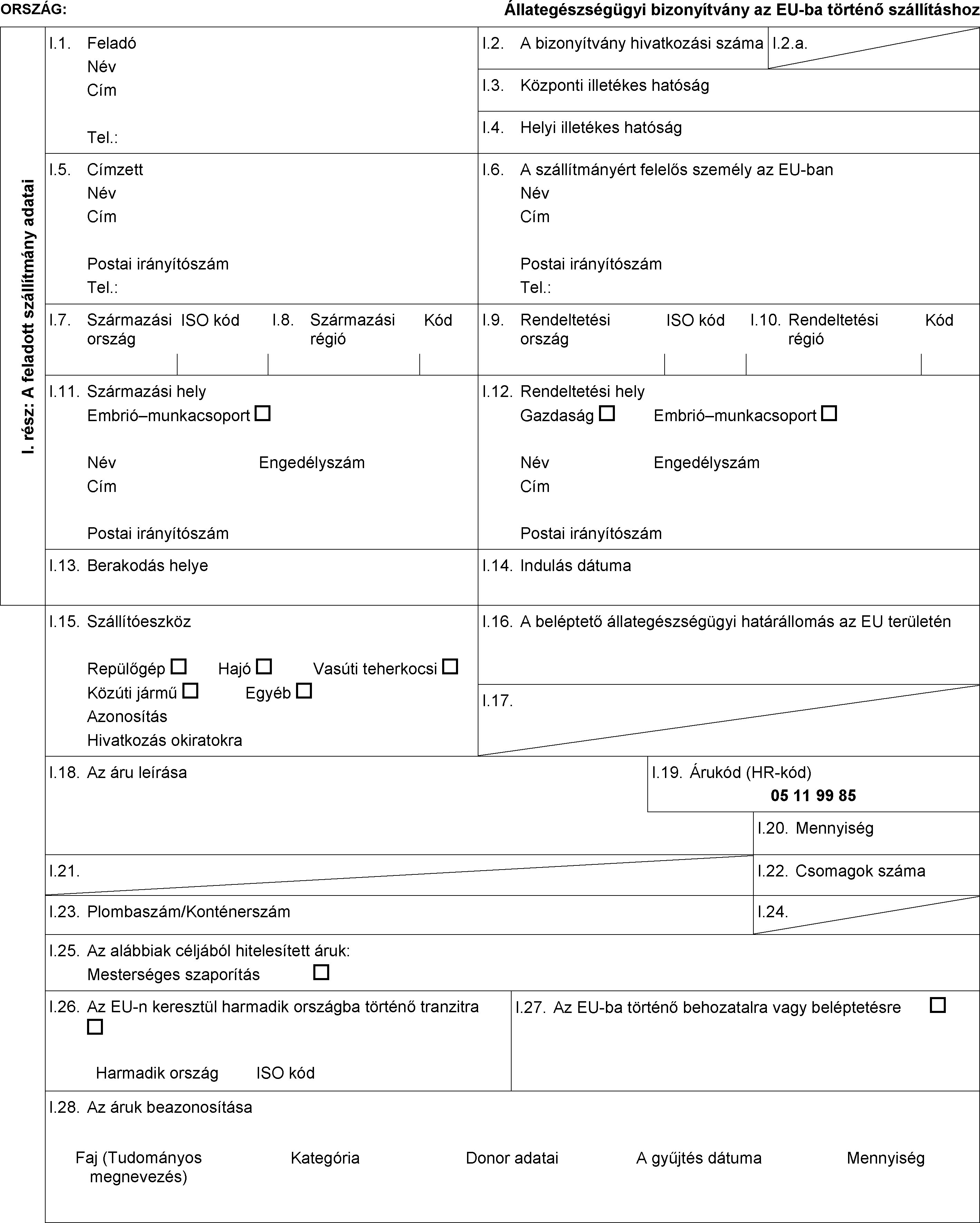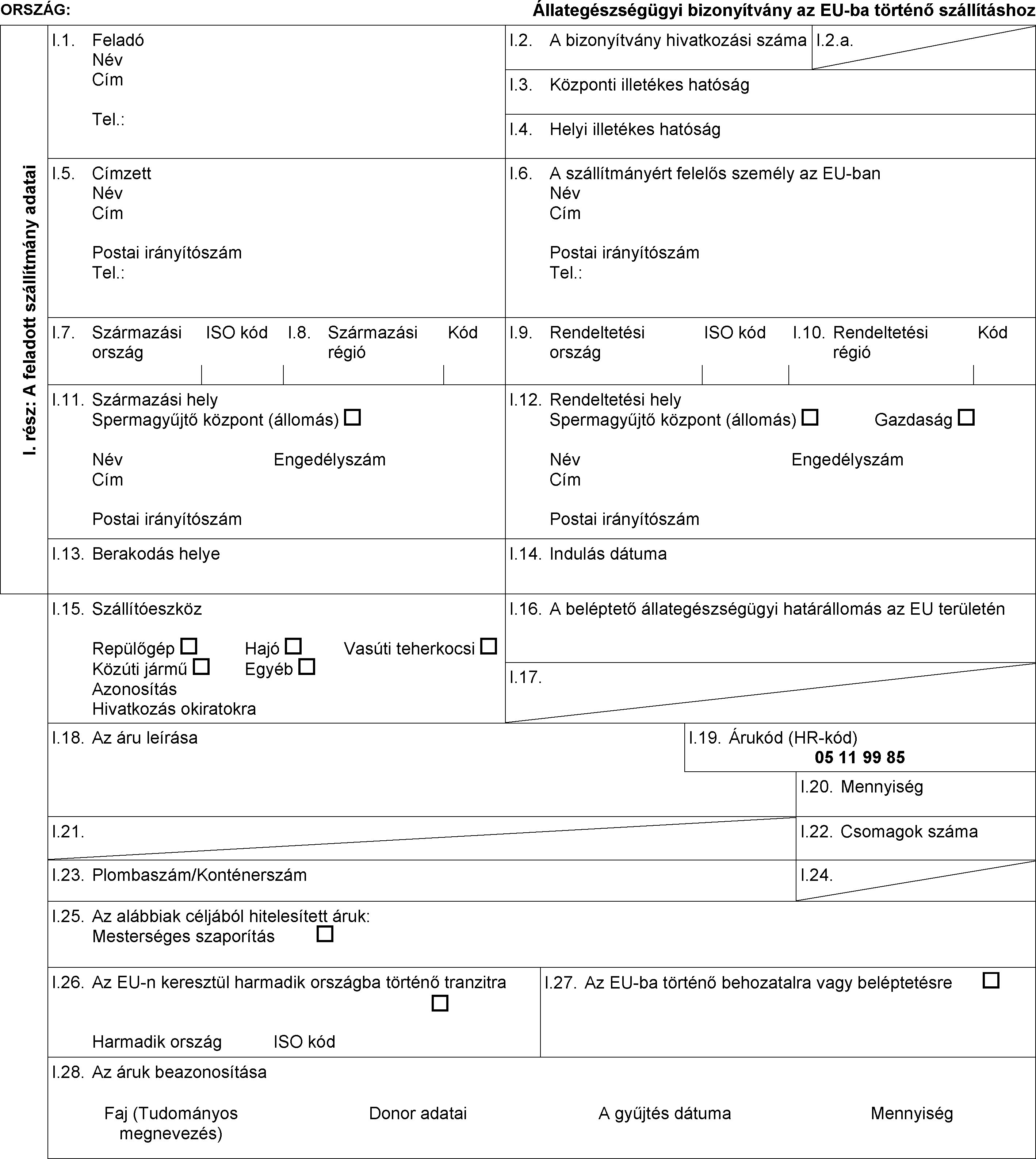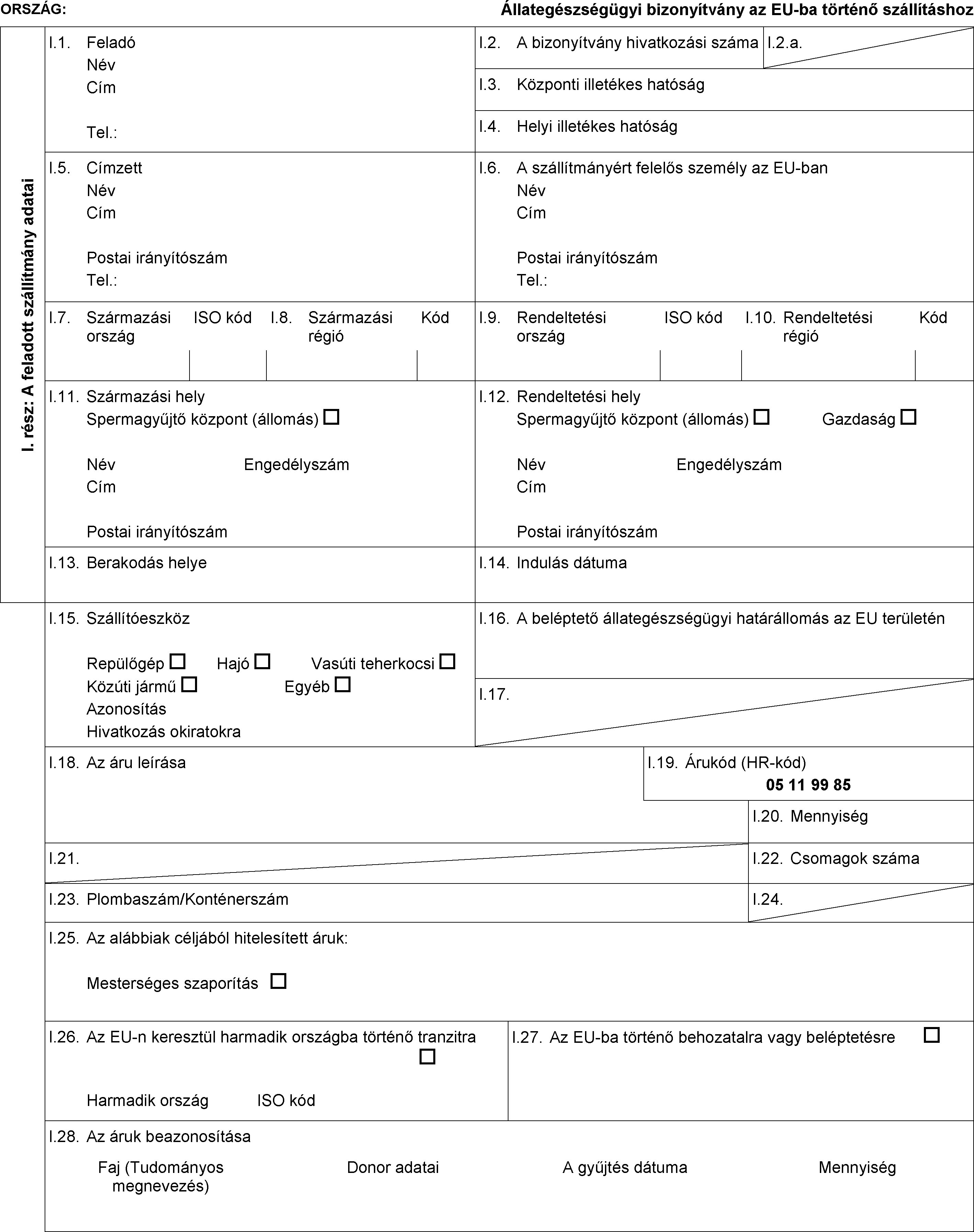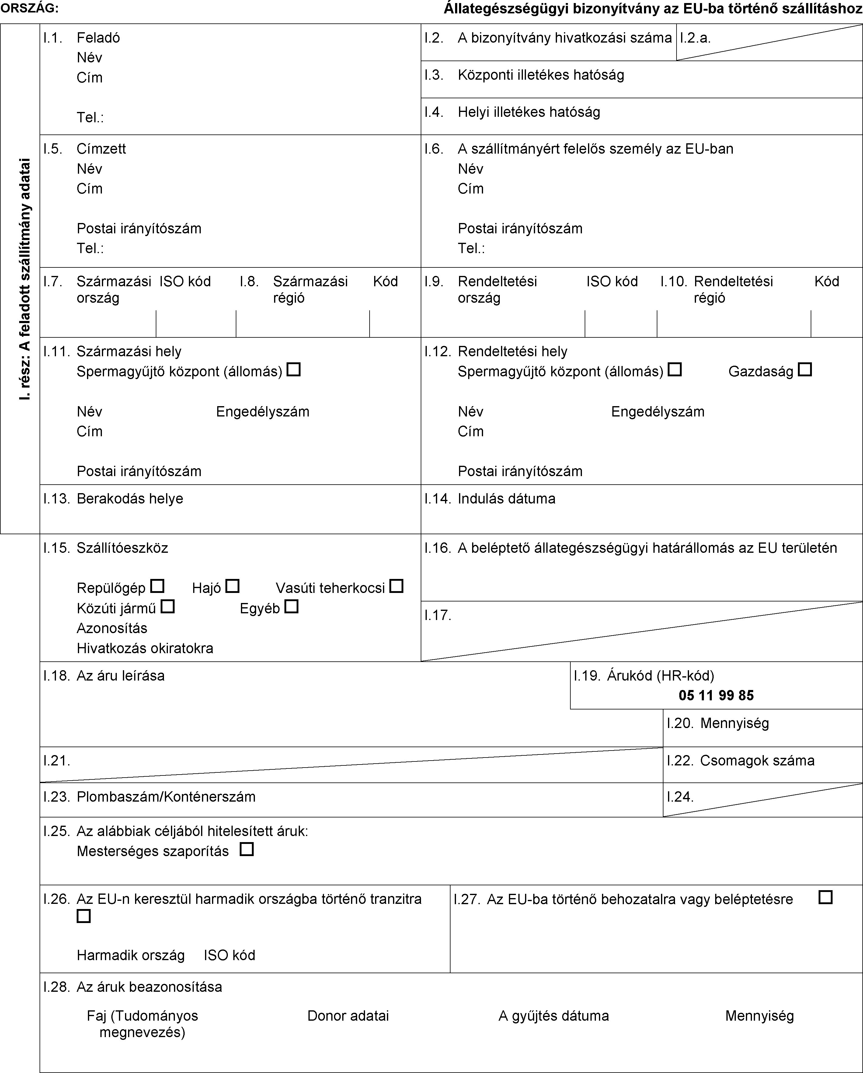 Állategészségügyi bizonyítványminta sperma behozatalához