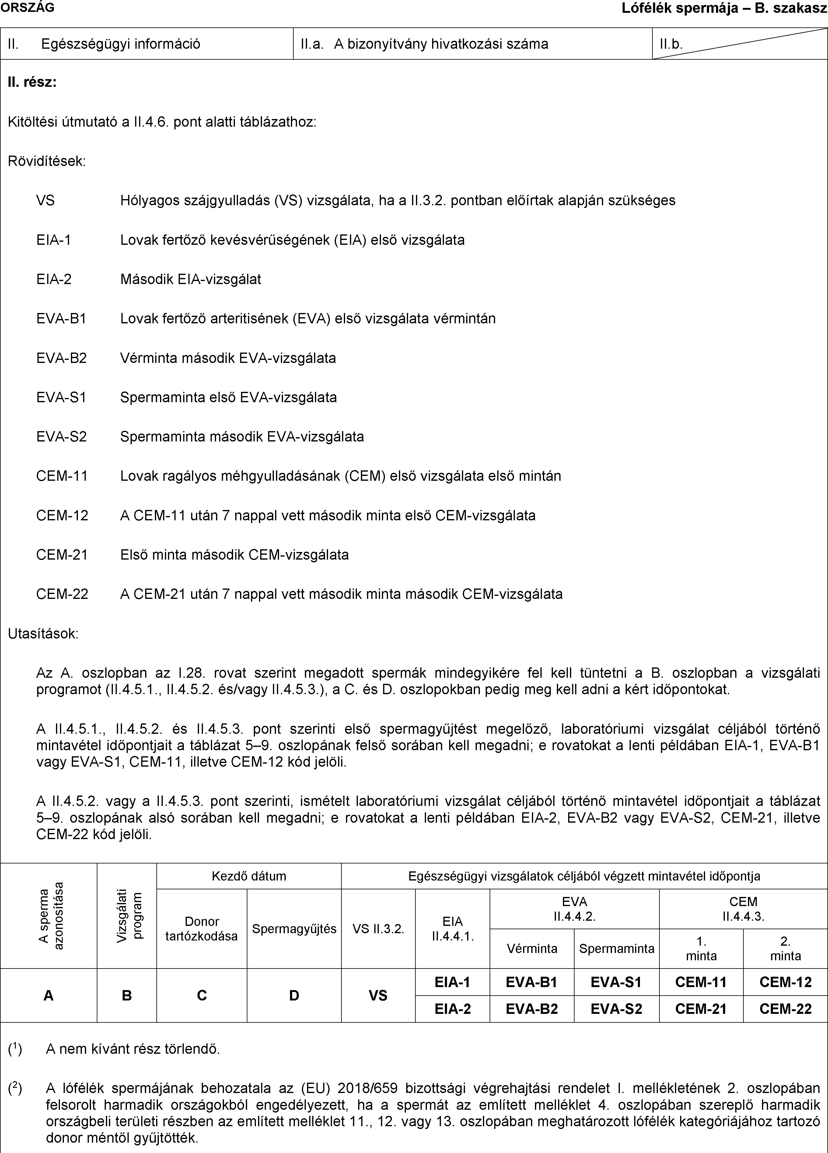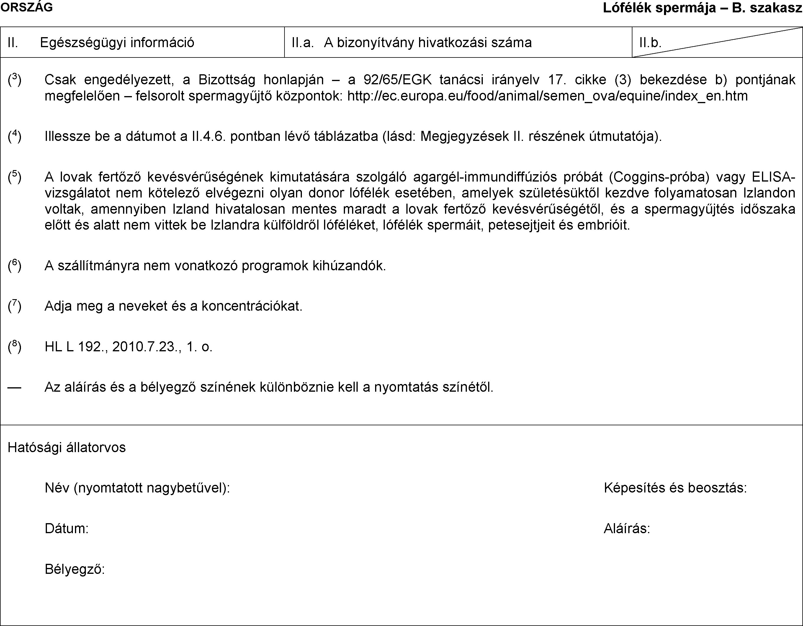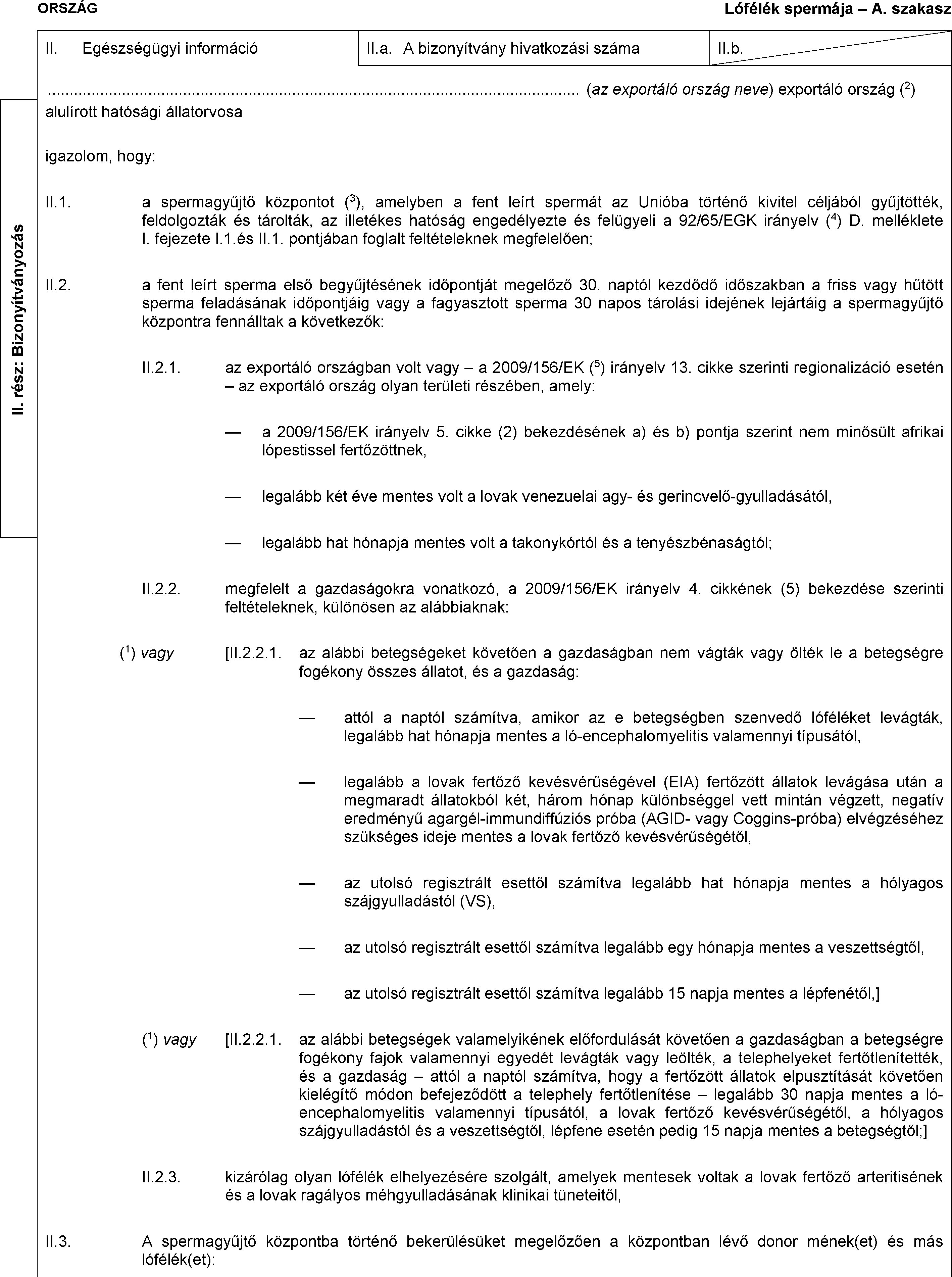 2. MINTA - Állategészségügyi bizonyítványminta a lófélék 2010. augusztus 31. után és 2014. október 1. előtt a 92/65/EGK irányelvnek megfelelően gyűjtött, feldolgozott és tárolt és a sperma származási helye szerinti, engedélyezett spermagyűjtő központból 2010. augusztus 31. után feladott spermakészletei szállítmányainak behozatalához