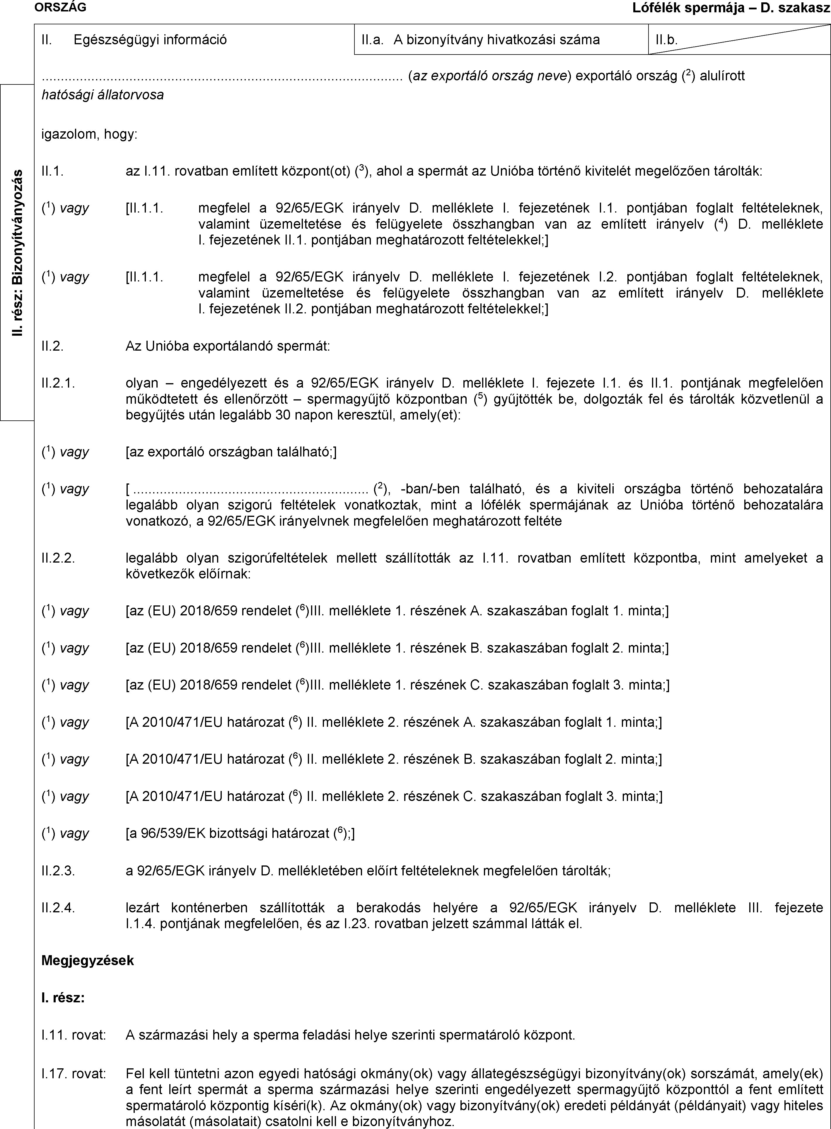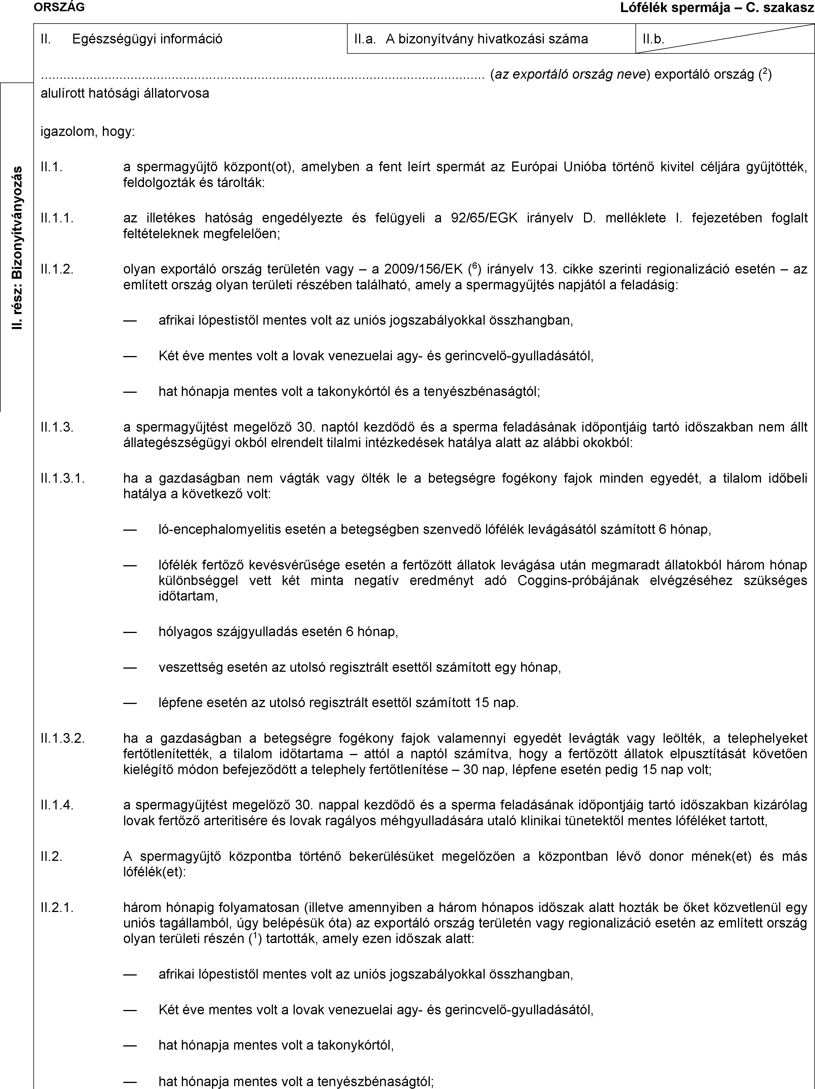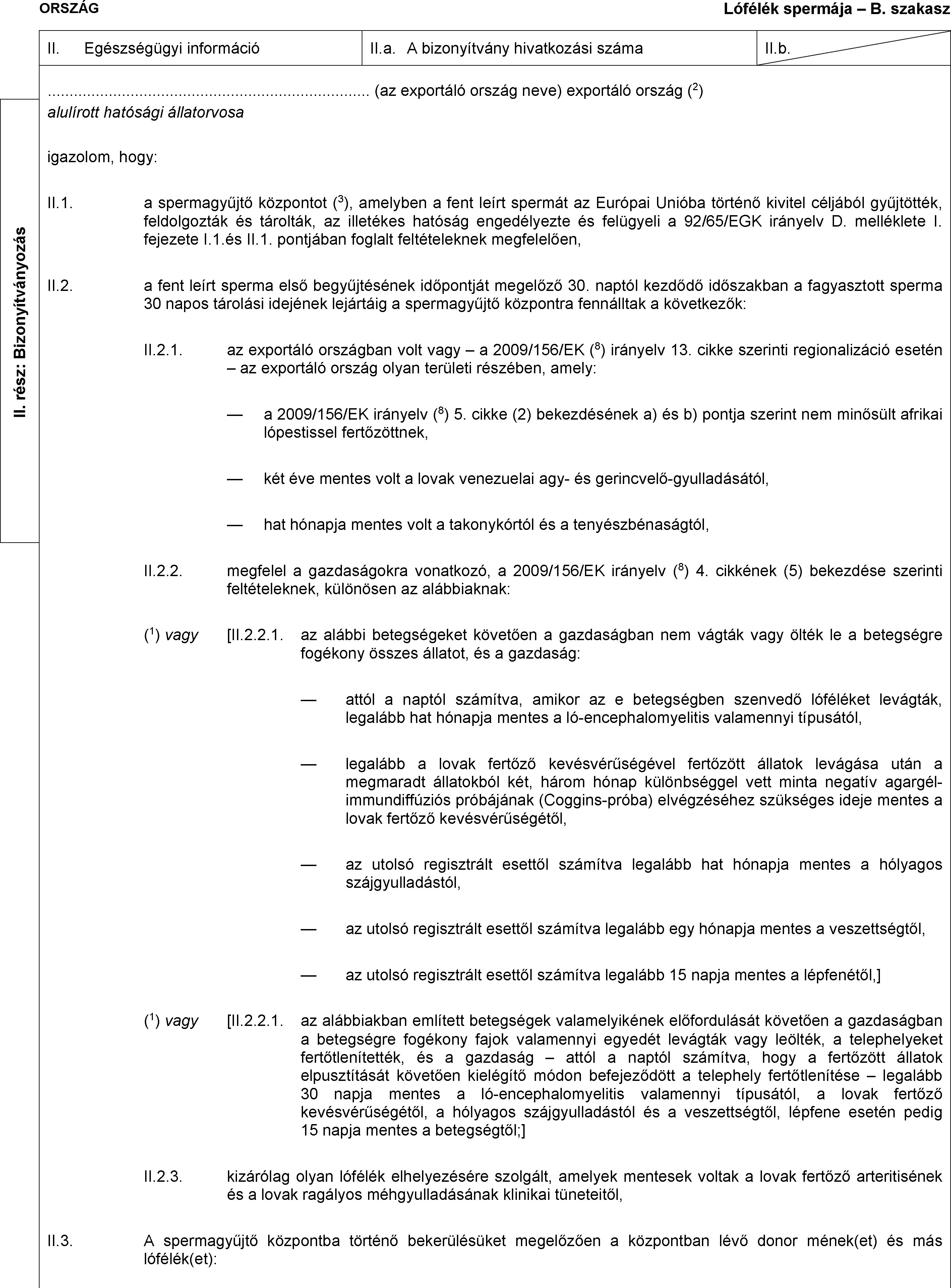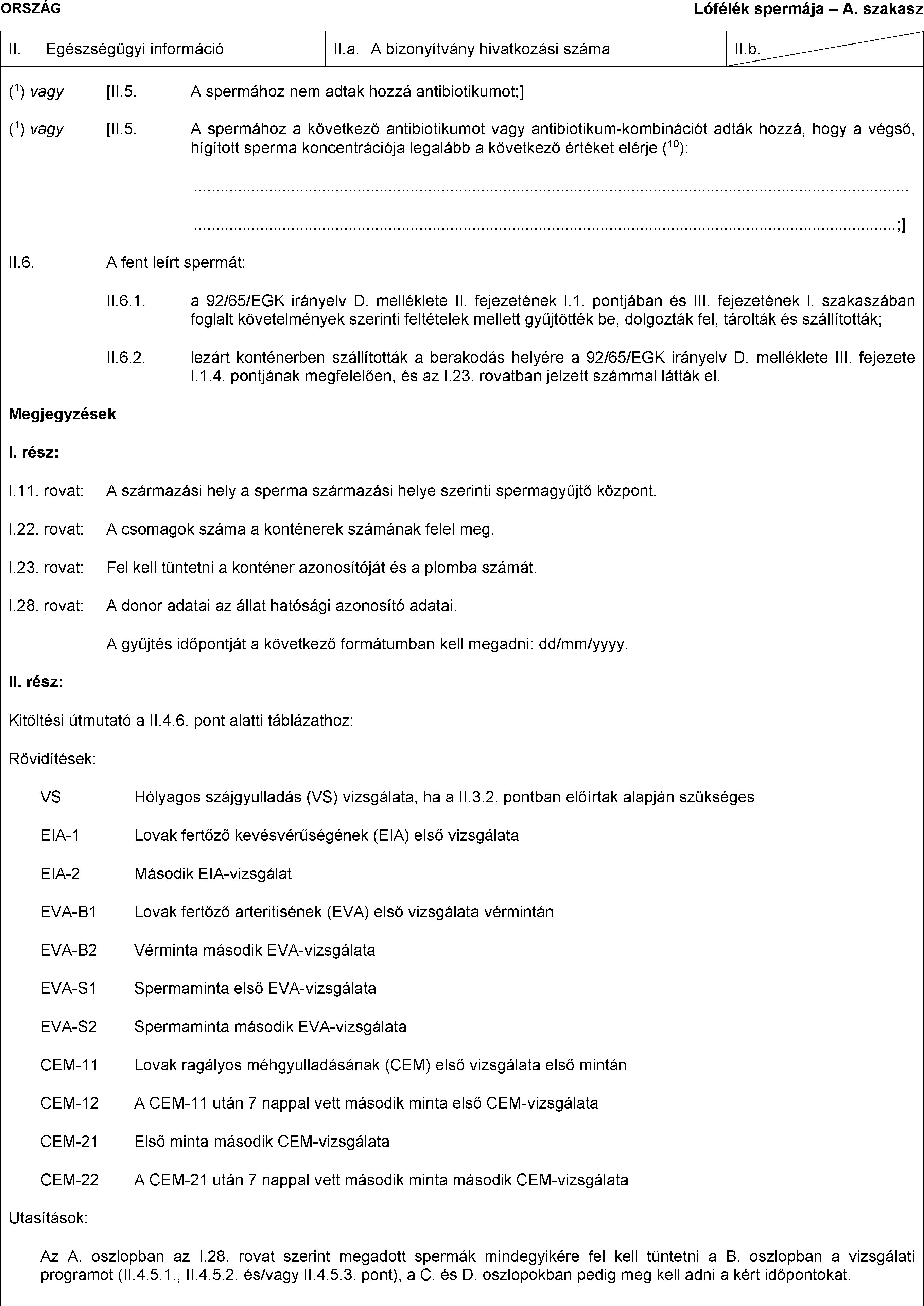2. MINTA - Állategészségügyi bizonyítványminta a lófélék 2010. augusztus 31. után és 2014. október 1. előtt a 92/65/EGK irányelvnek megfelelően gyűjtött, feldolgozott és tárolt és a sperma származási helye szerinti, engedélyezett spermagyűjtő központból 2010. augusztus 31. után feladott spermakészletei szállítmányainak behozatalához