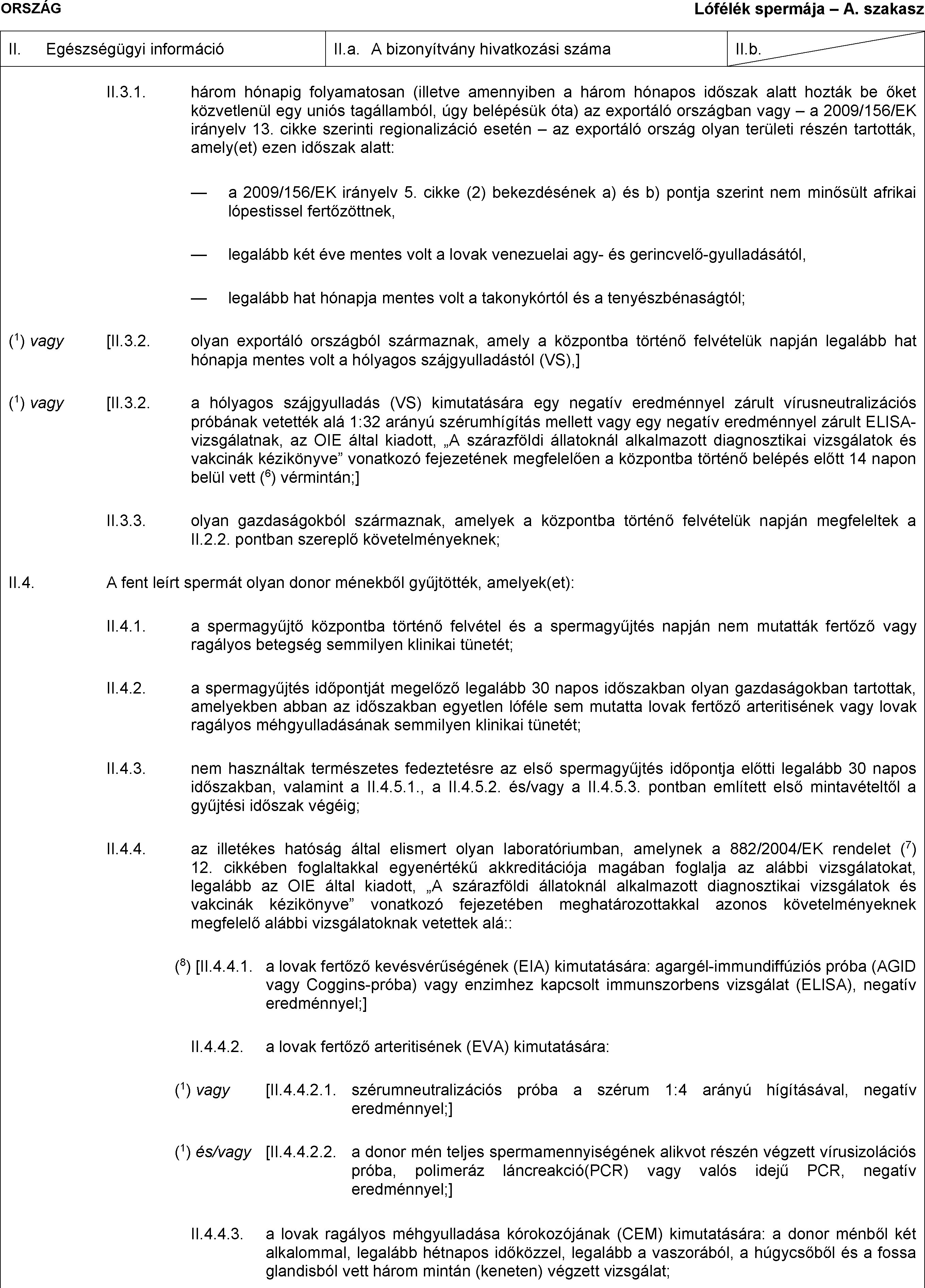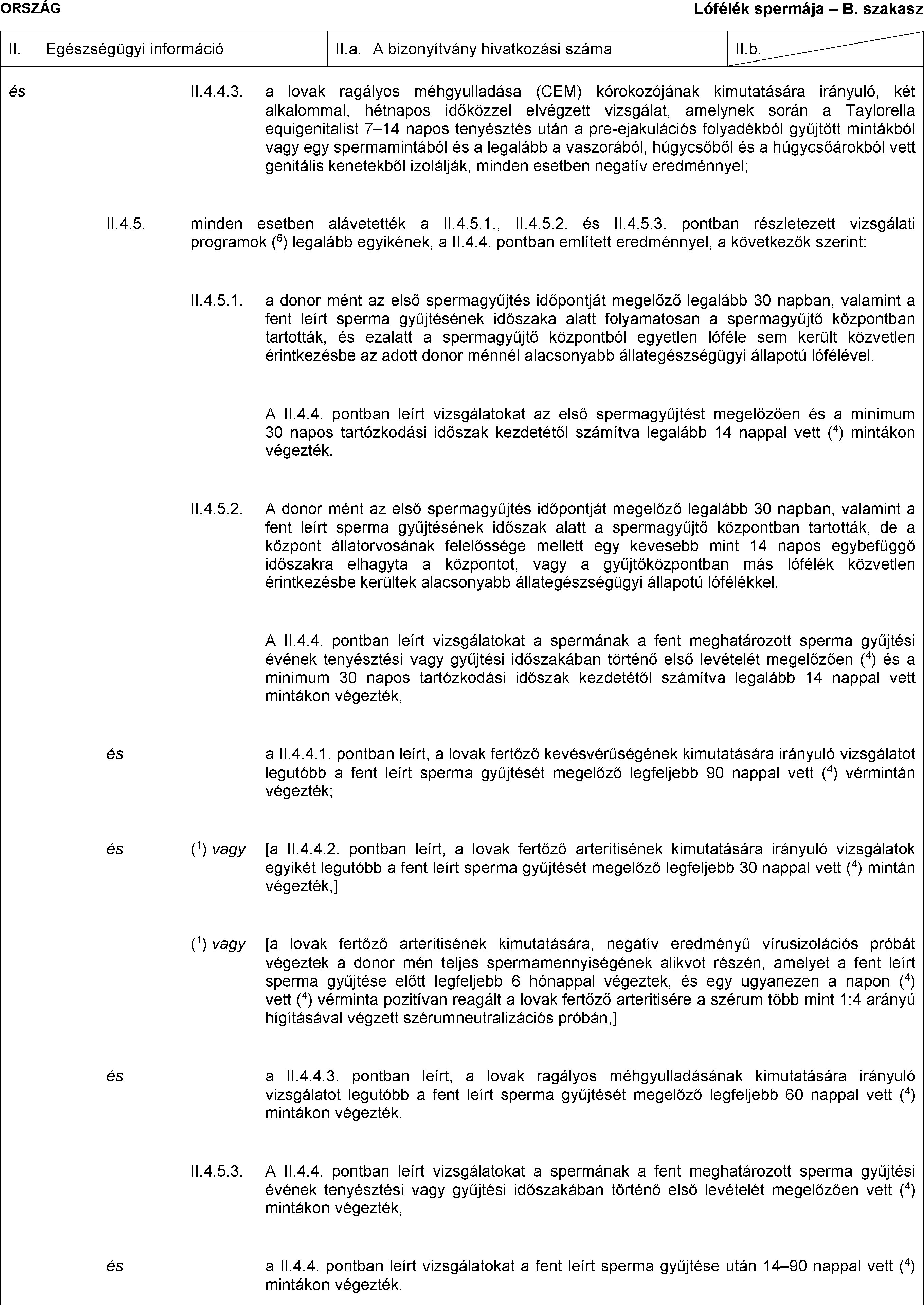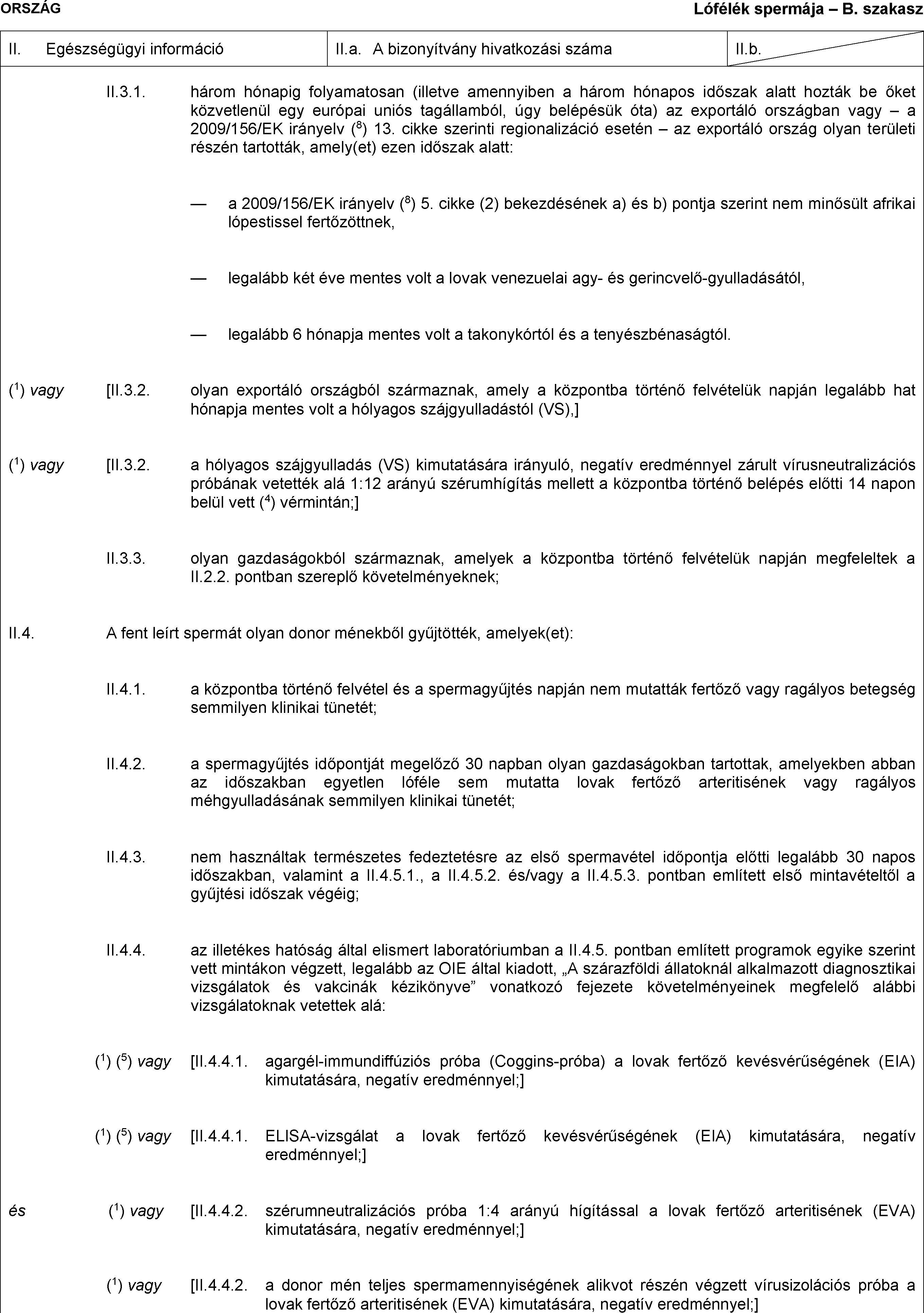 SPERMA | Lóféléknek a 92/65/EGK irányelv 17. cikke (2) bekezdése b) pontjának ii. alpontja szerint begyűjtött spermája. |
