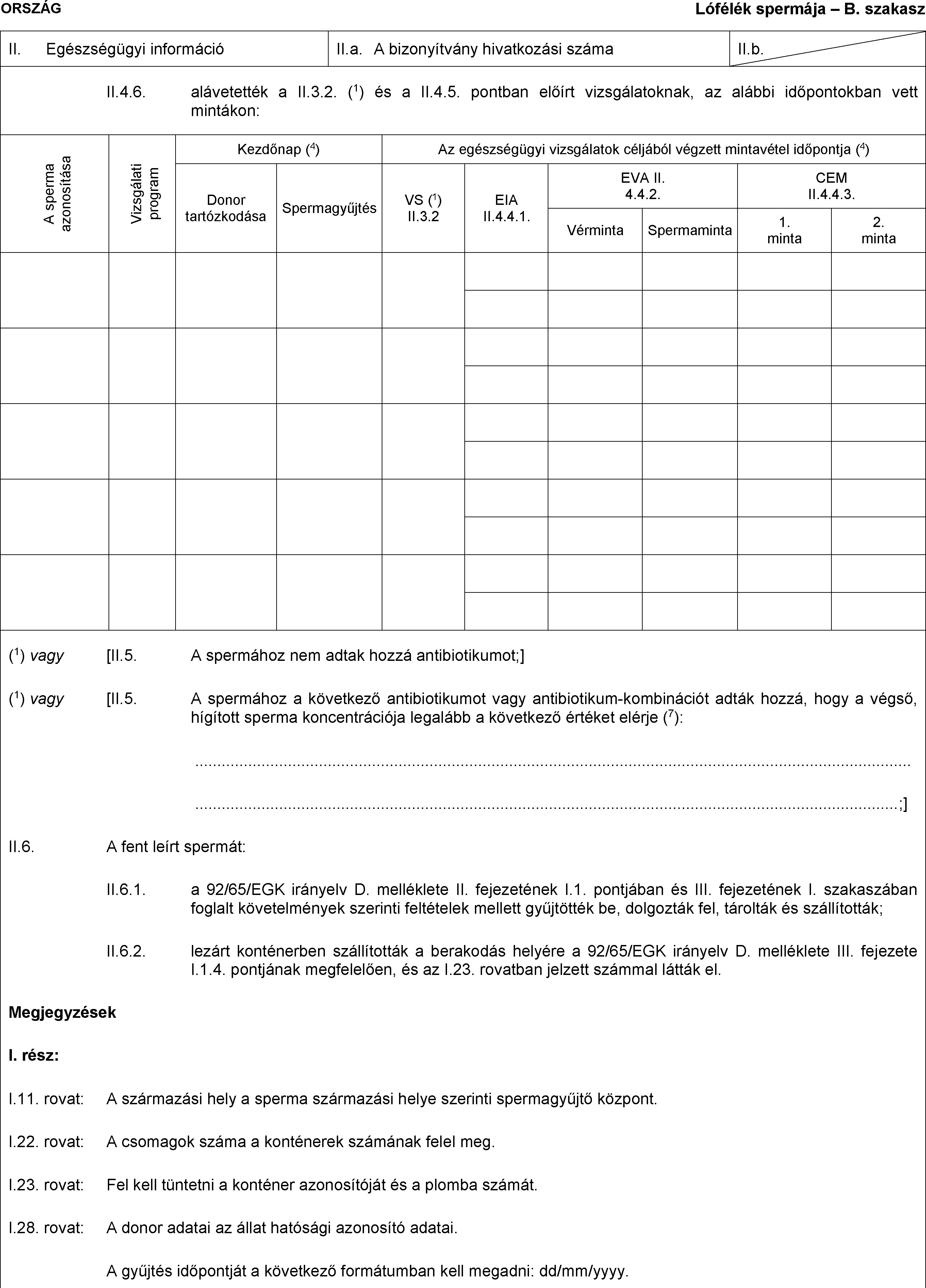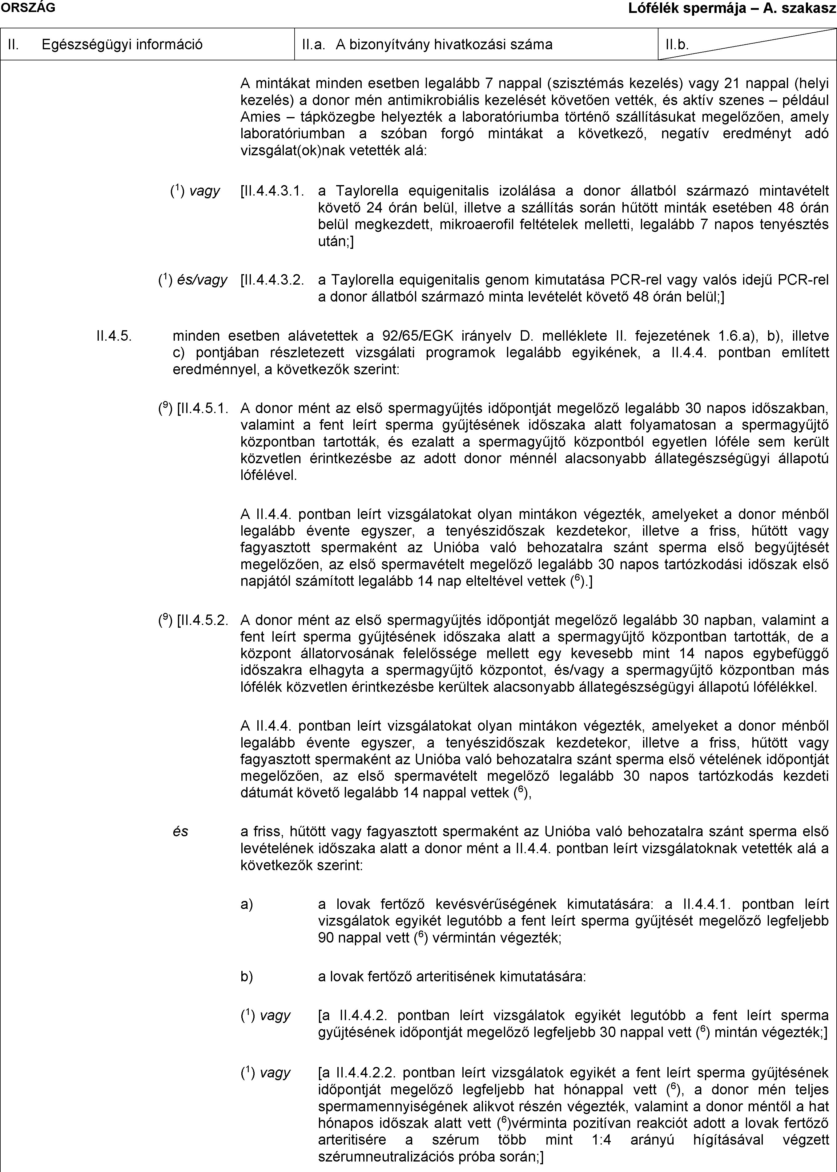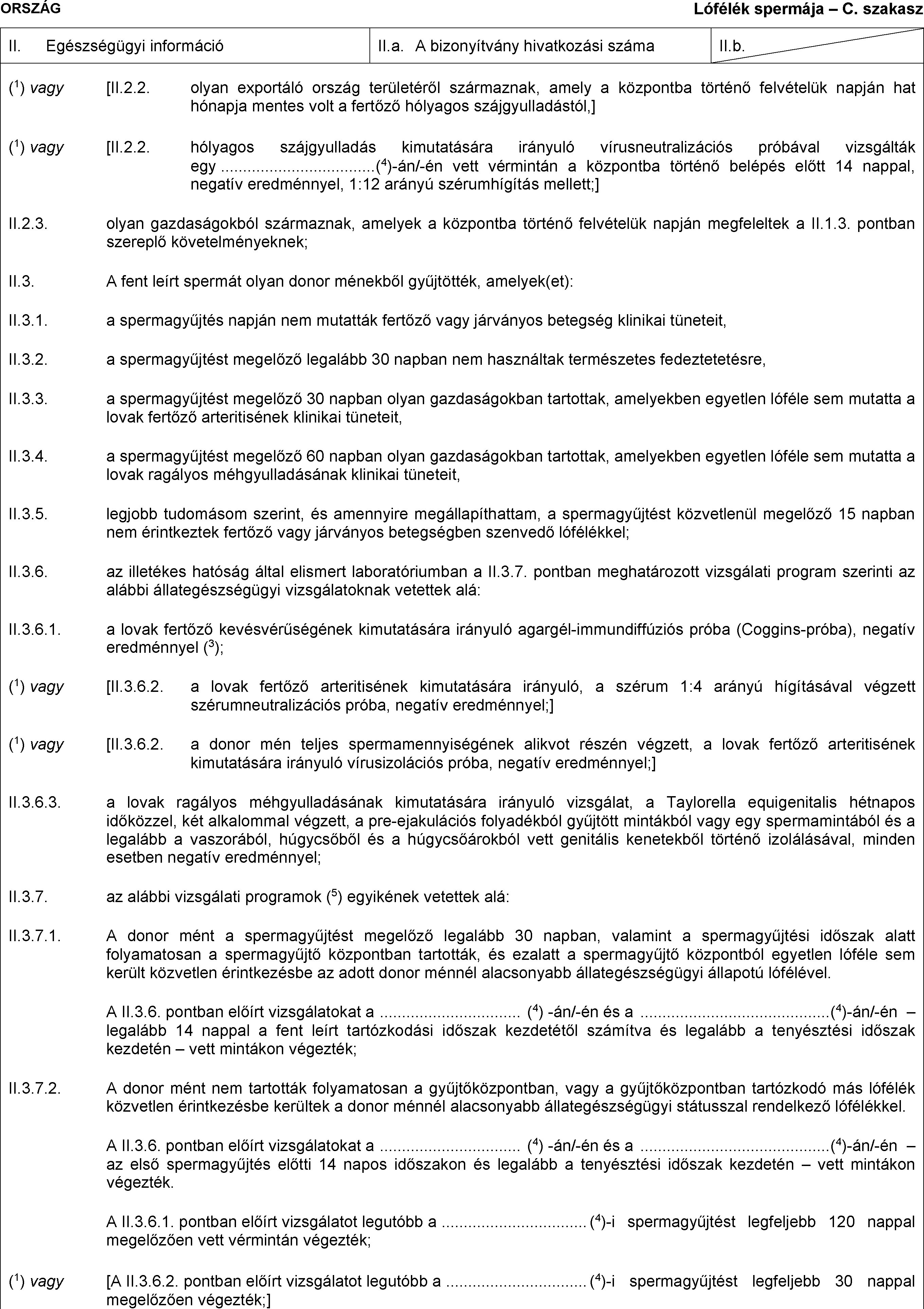 SPERMA | Lóféléknek a 92/65/EGK irányelv 17. cikke (2) bekezdése b) pontjának ii. alpontja szerint begyűjtött spermája. |